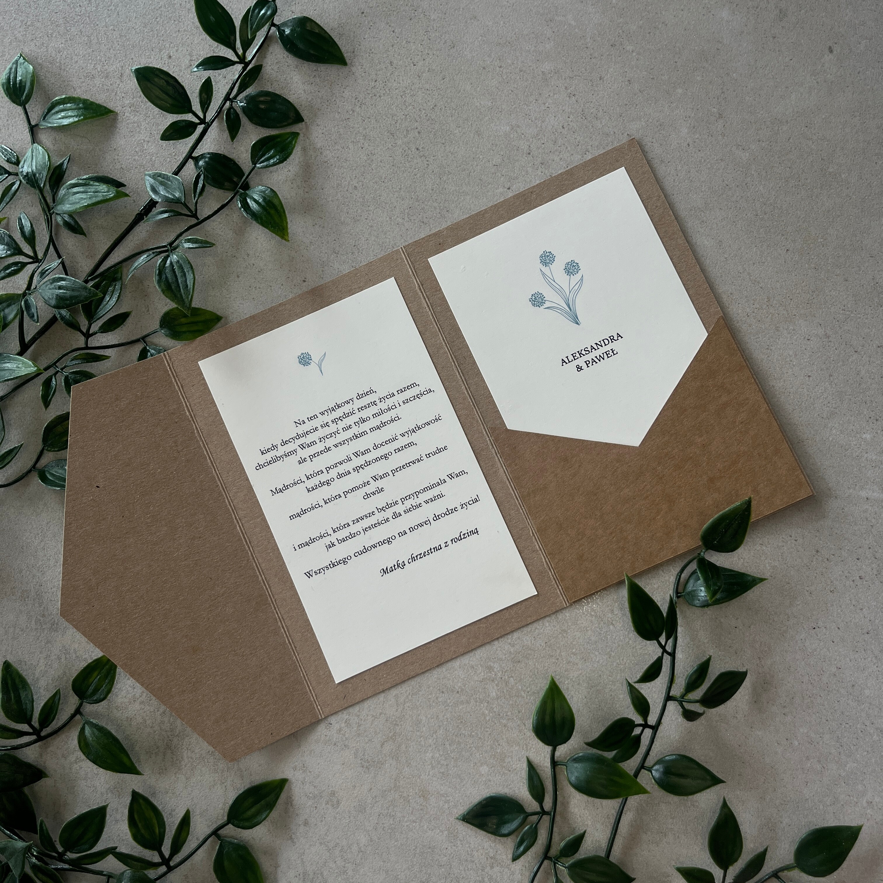 Kartka okolicznościowa to świetny dodatek do prezentu. Jest w pełni personalizowana, dzięki czemu staje się wyjątkowa i idealnie dopasowana do danej osoby. Nadaje się na każdą okazję! Styl rustykalny daje efekt elegancji, swoją prostotą przyciągnie wzrok niejednego. W środku znajduje się kieszonka, w którą można włożyć np. bon podarunkowy.