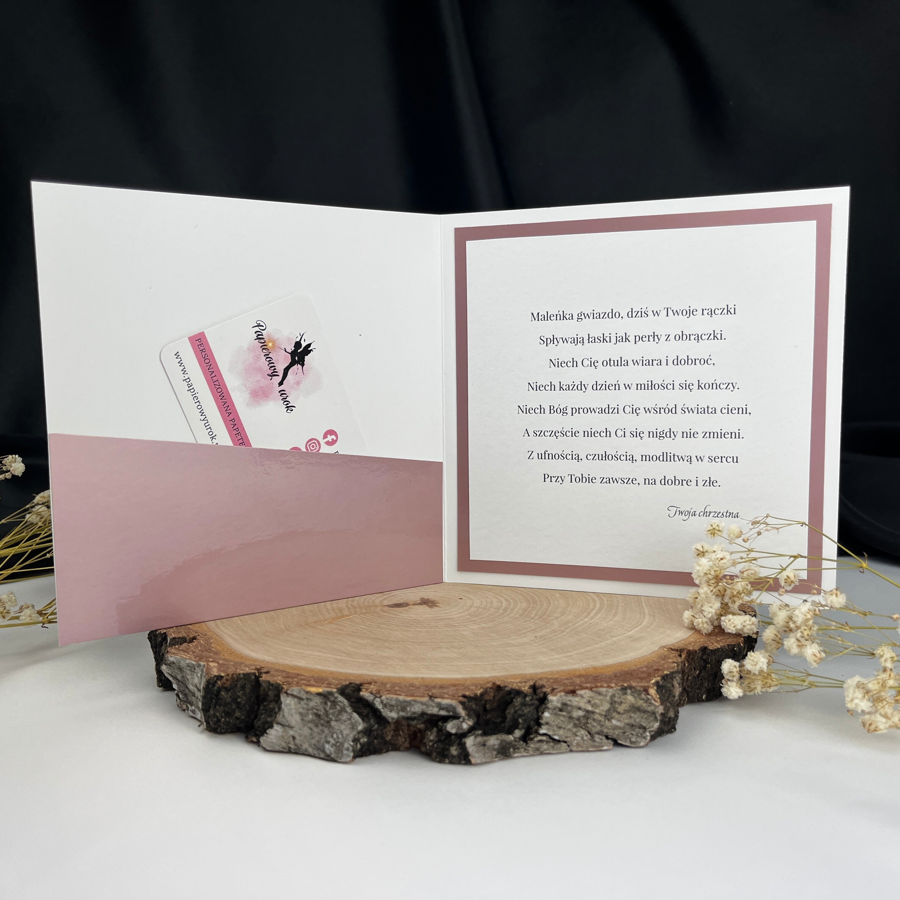 Kartka okolicznościowa to świetny dodatek do prezentu. Jest w pełni personalizowana, dzięki czemu staje się wyjątkowa i idealnie dopasowana do danej osoby. Po lewej stronie można dodać kieszonkę np. na bon podarunkowy.