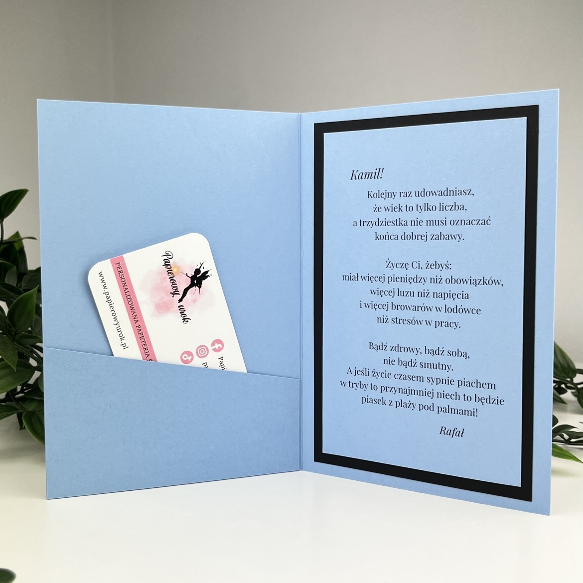 Kartka okolicznościowa to świetny dodatek do prezentu. Jest w pełni personalizowana, dzięki czemu staje się wyjątkowa i idealnie dopasowana do danej osoby. Po lewej stronie można dodać kieszonkę np. na bon podarunkowy.