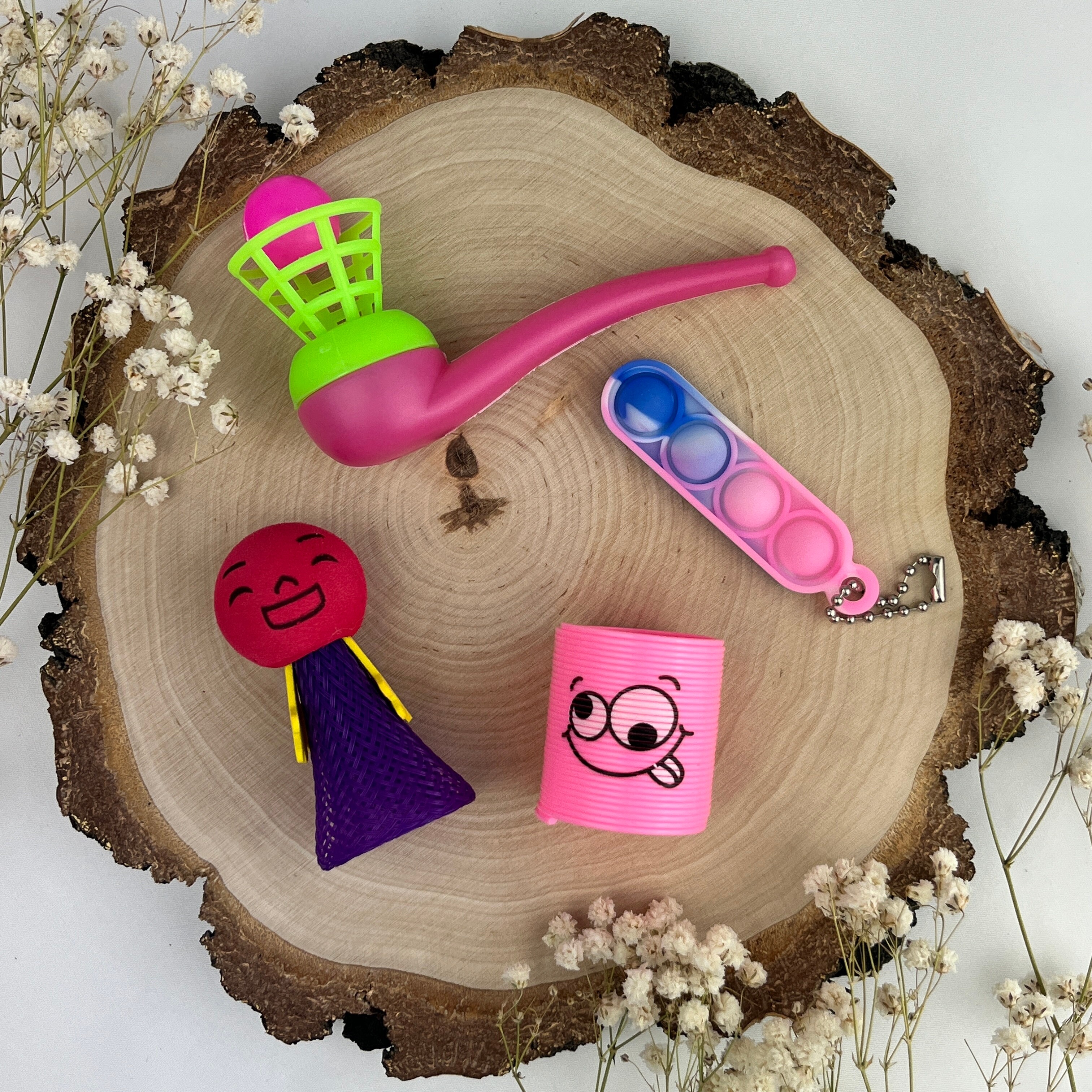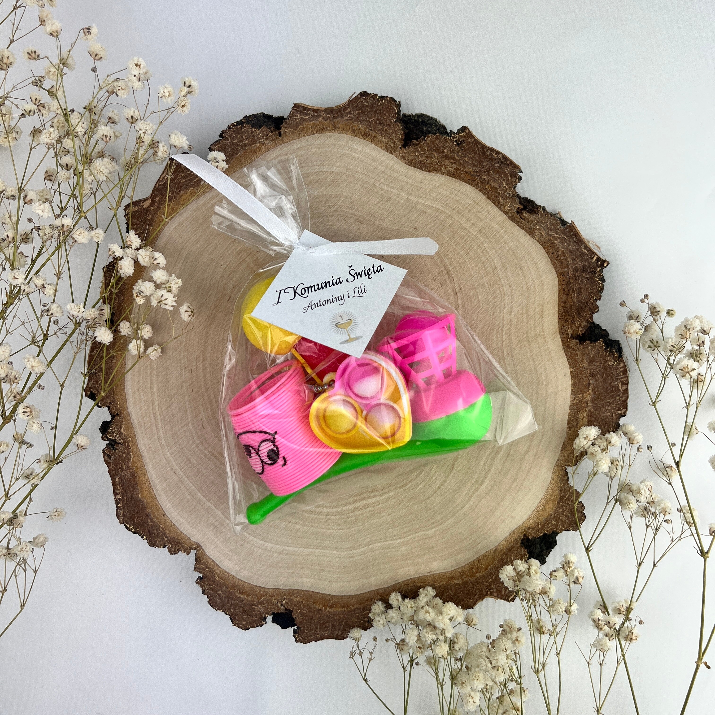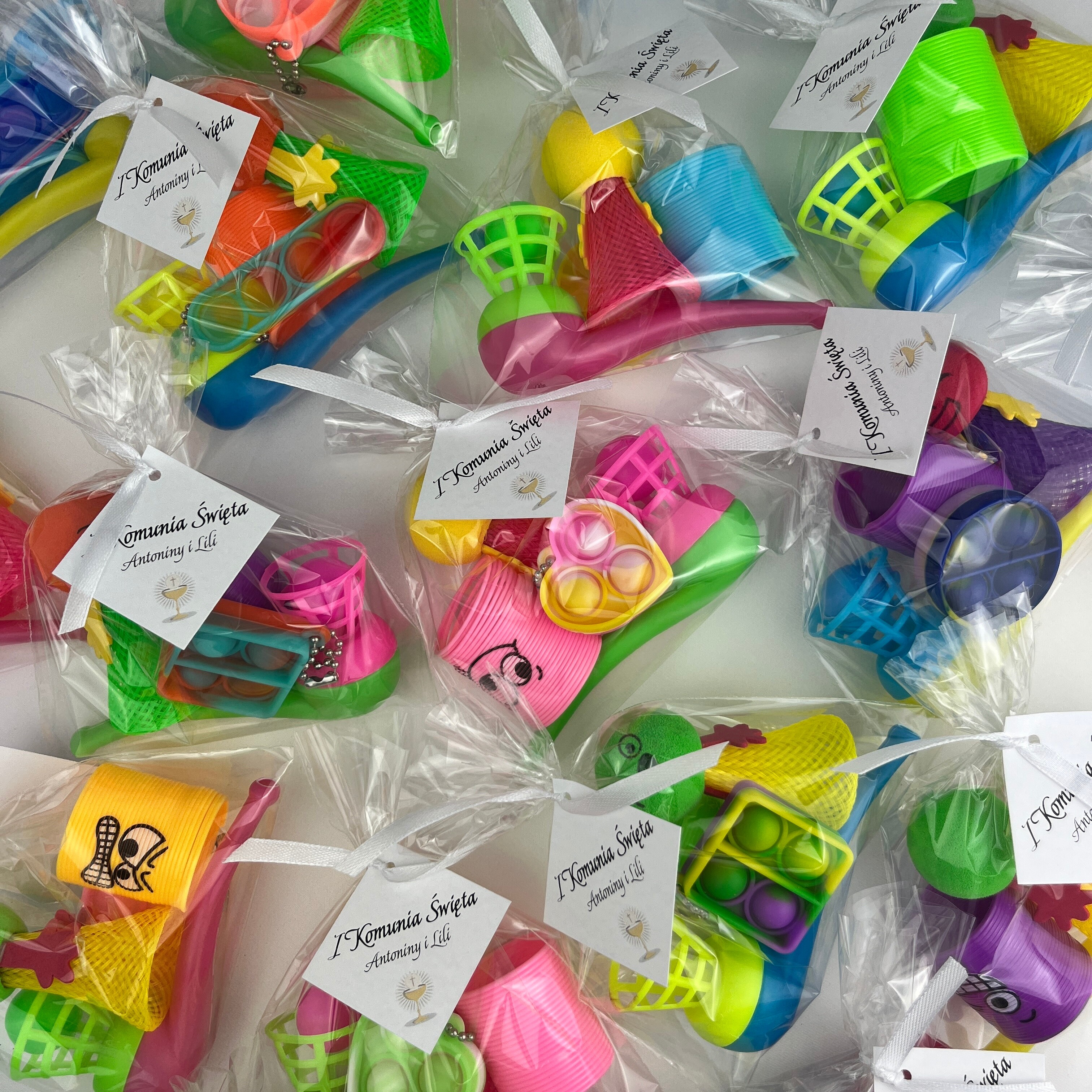 W środku znajdują się cztery LOSOWO wybrane zabawki np. sprężynki, skoczki.