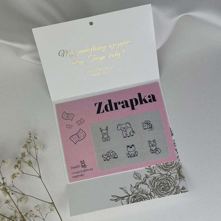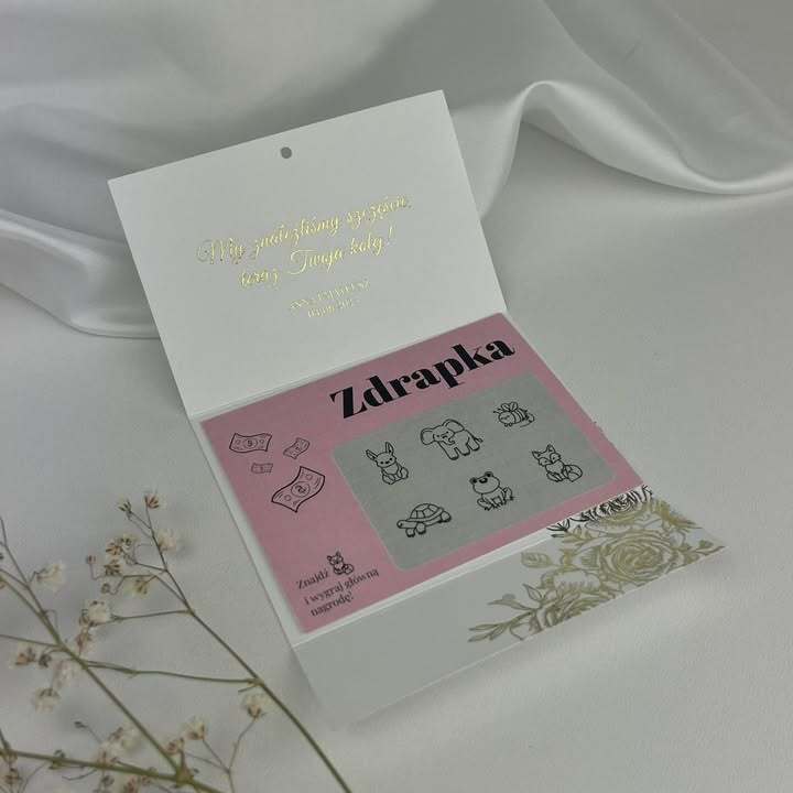- składane etui na zdrapkę o rozmiarze 7 x 10 cm,