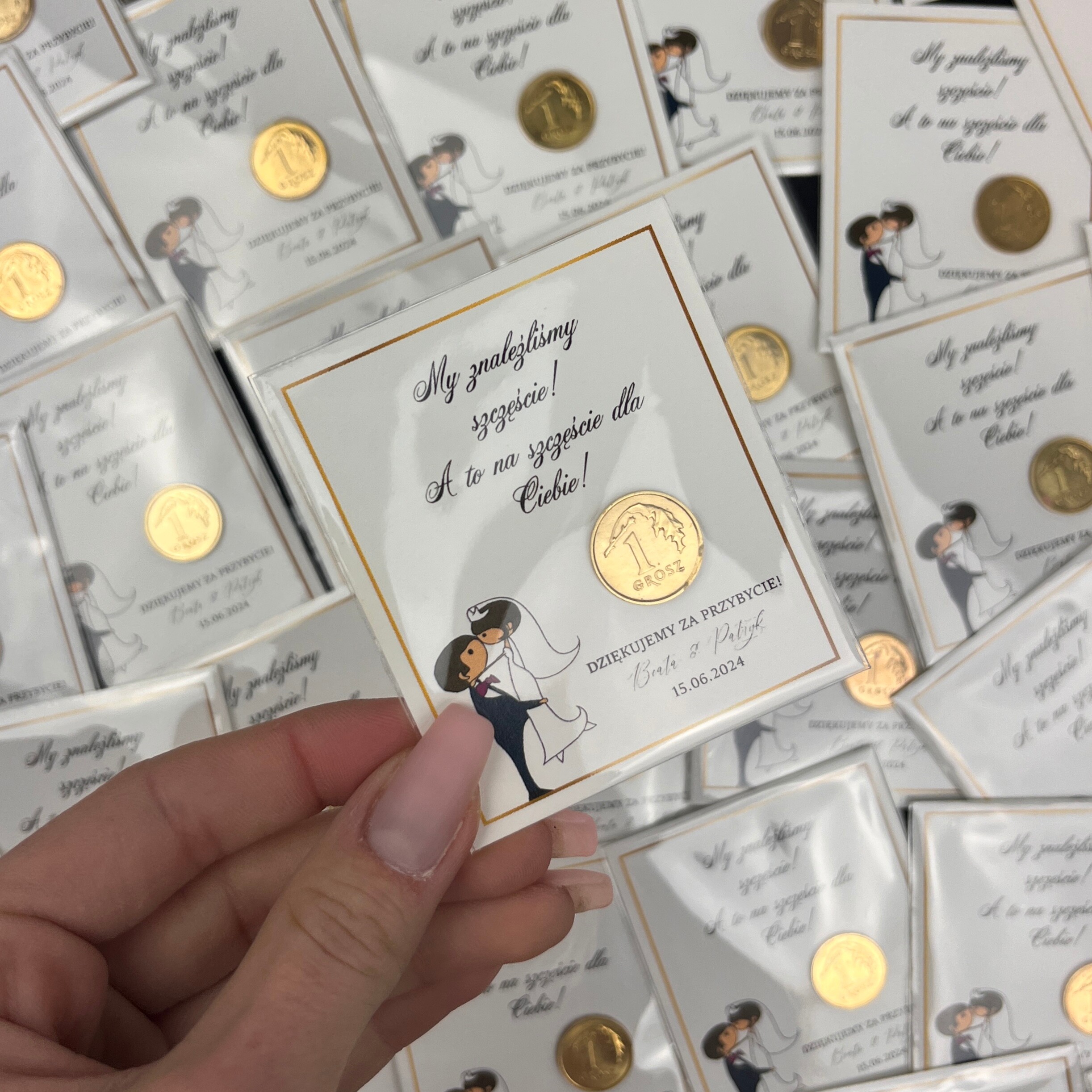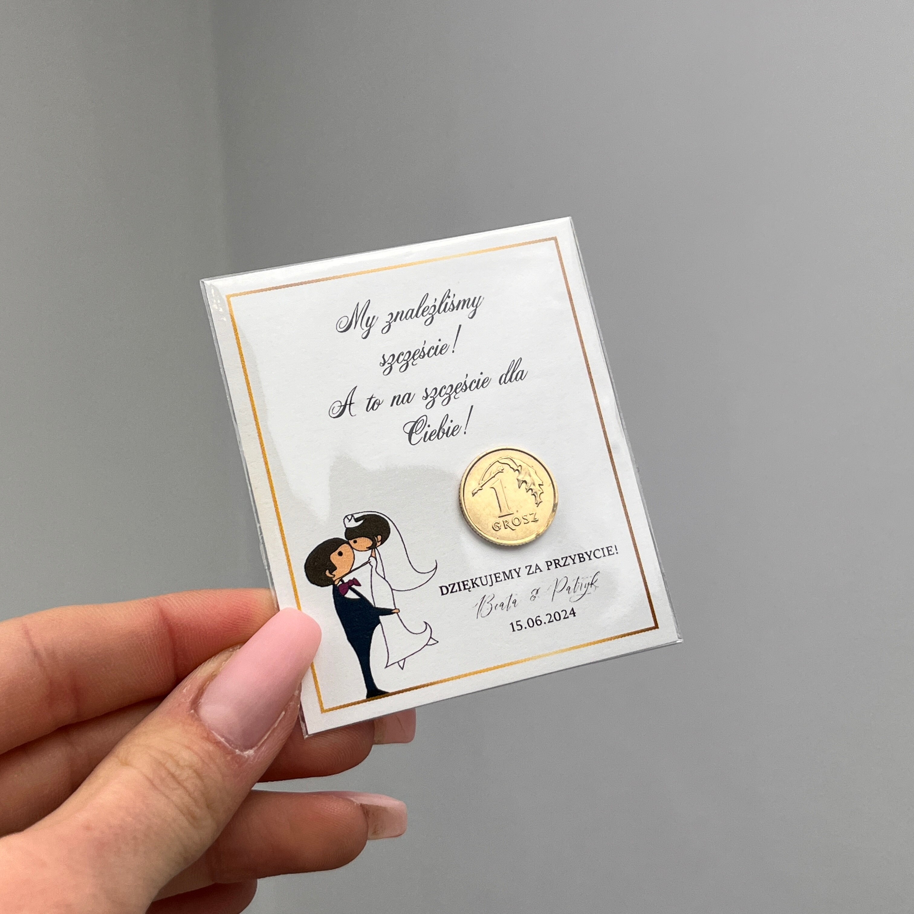Podziękowanie dla gości w formie grosza na szczęście. Karteczka z naklejoną monetą zapakowana jest w małą folijkę, dzięki czemu całość wygląda elegancko.