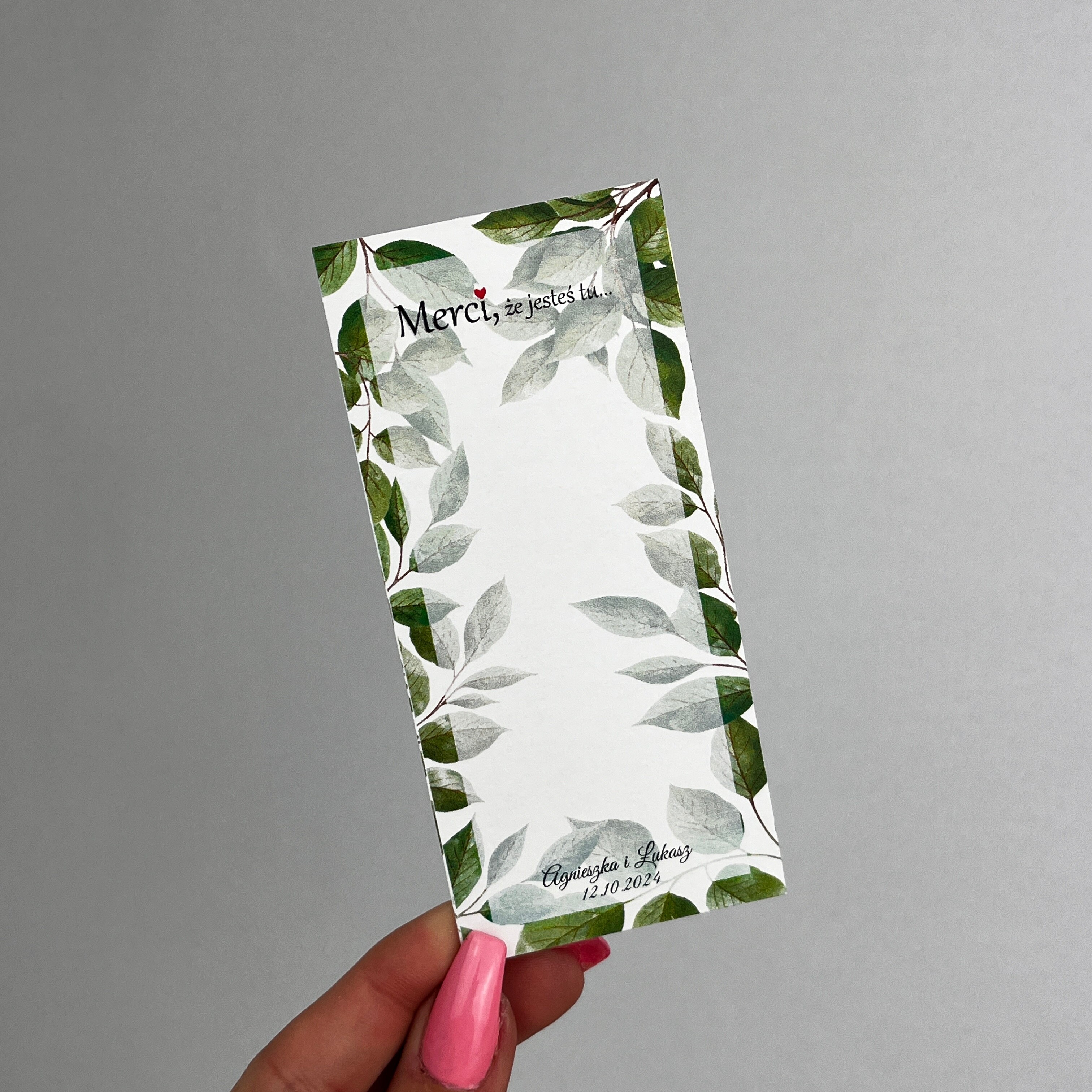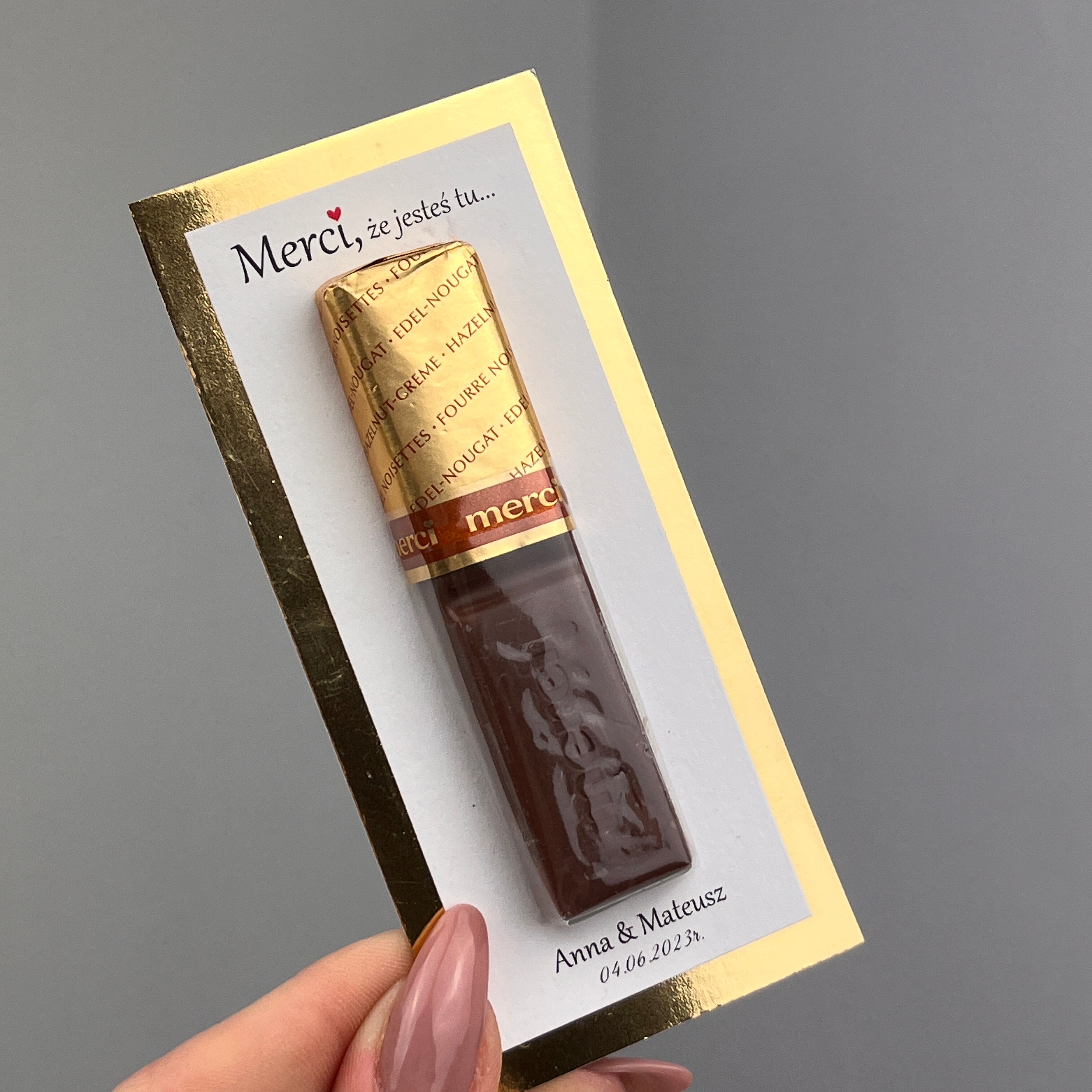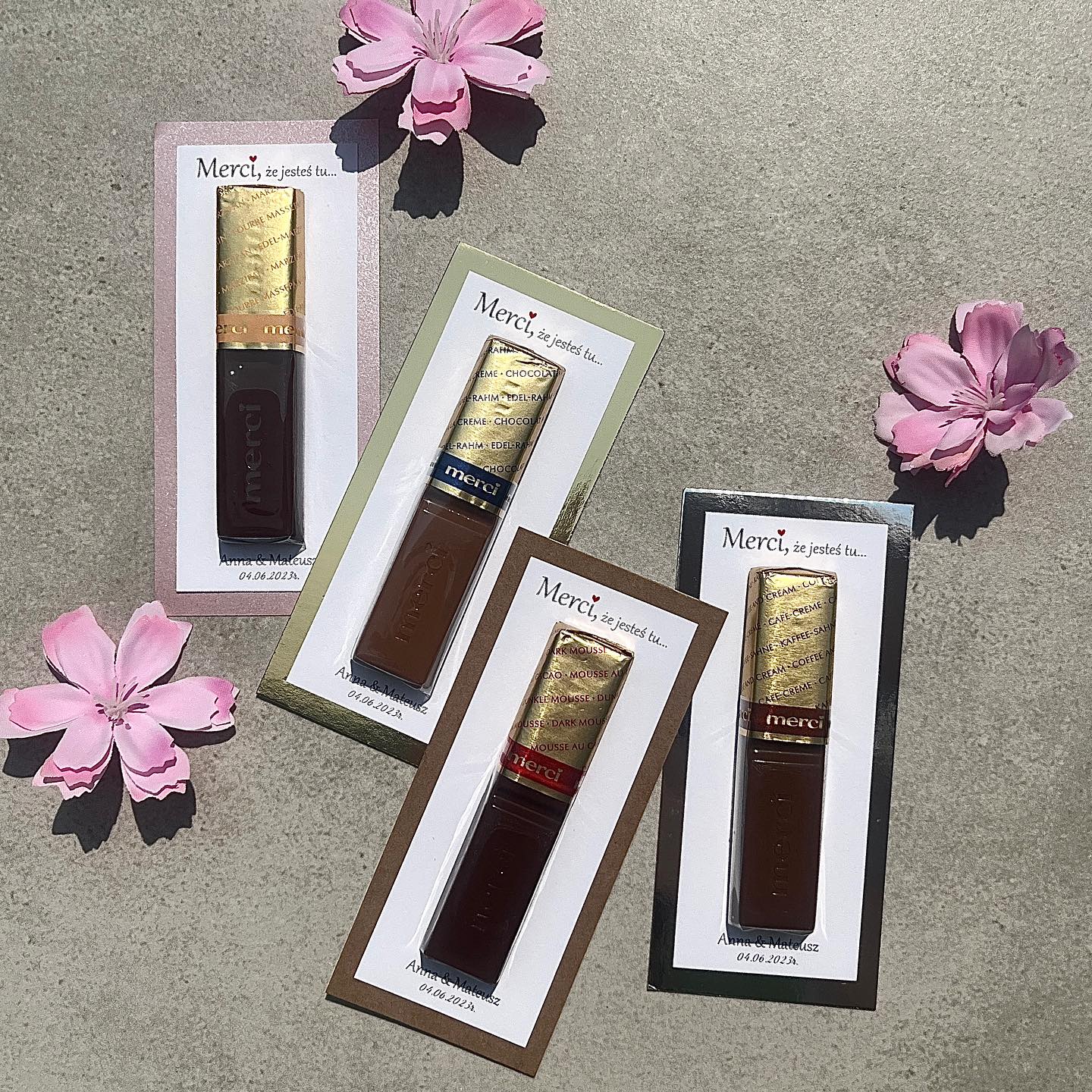 Podziękowanie dla gości w formie karteczki z czekoladką Merci. To ty wybierasz kolor karteczki oraz tekst! Możliwość zmiany Merci np. na czekoladkę Kinder.