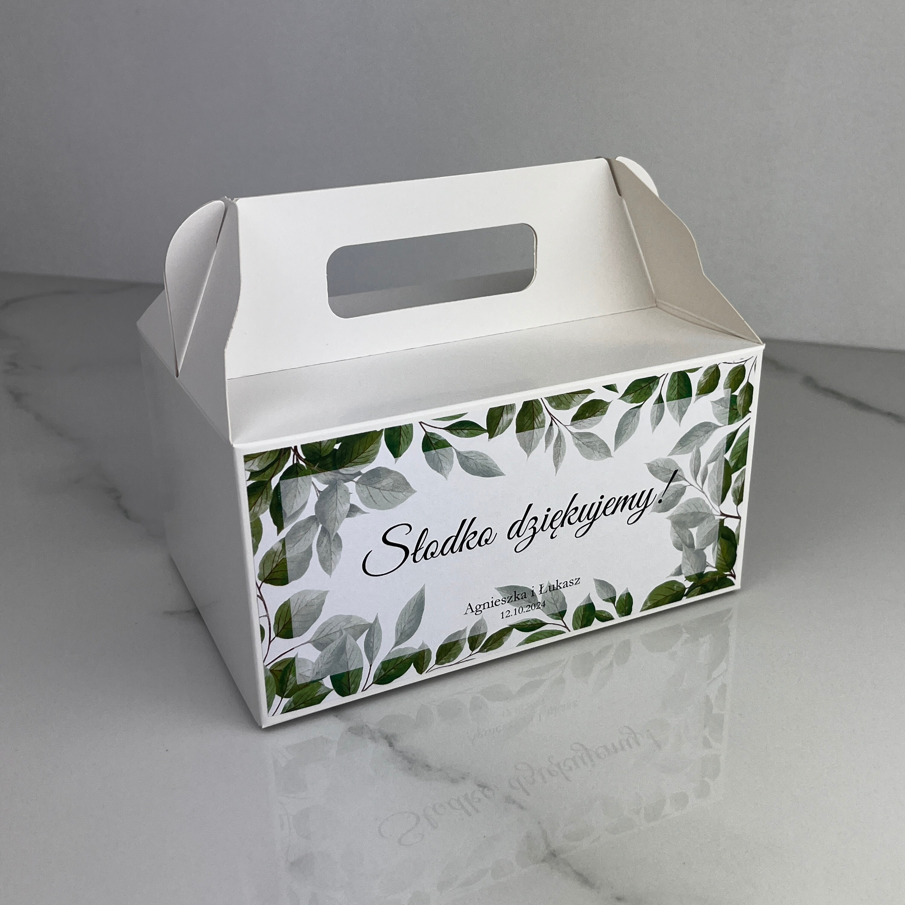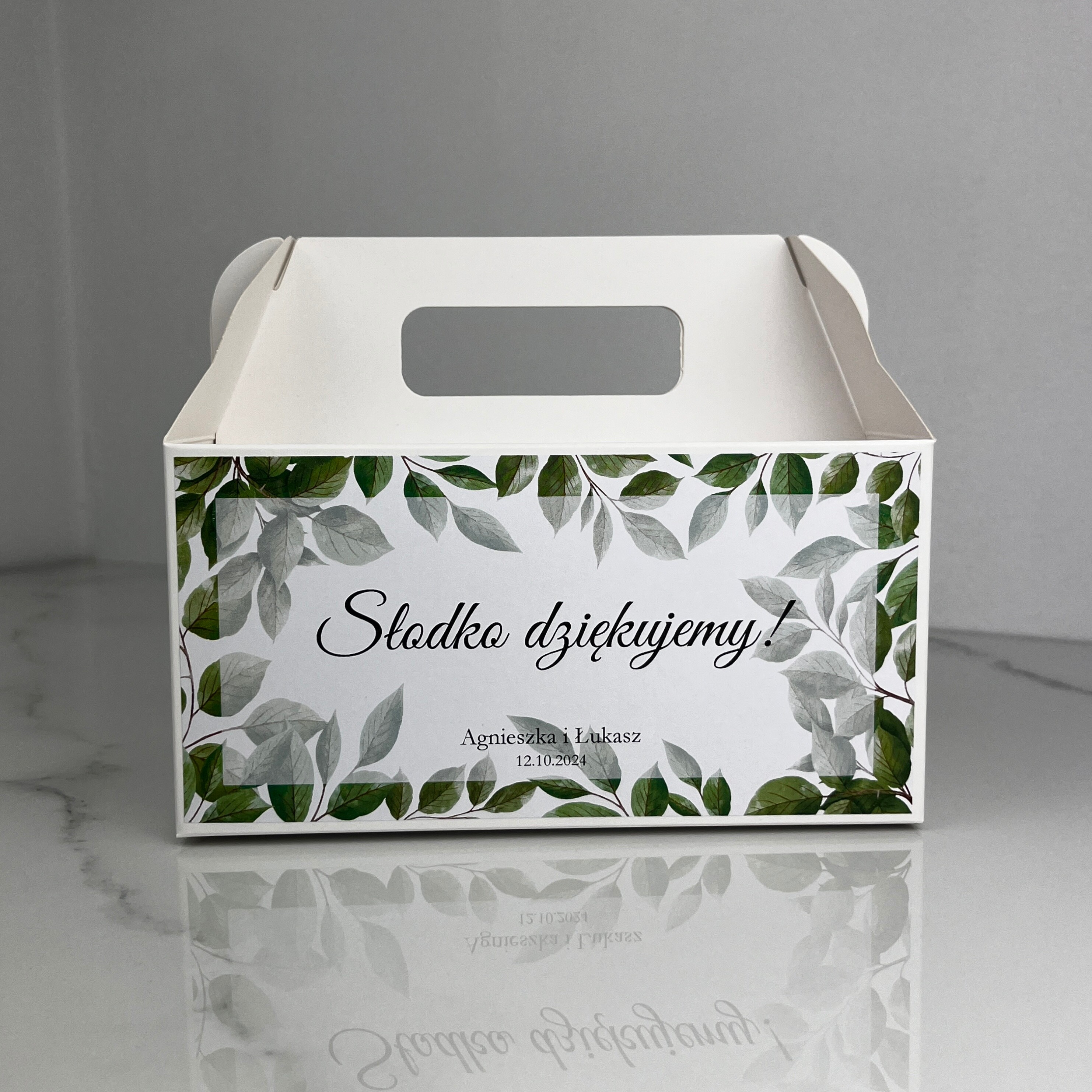Pudełko na ciasto o wymiarach 18,5 x 13x 9,5 cm (bez rączki) z dowolną naklejką.