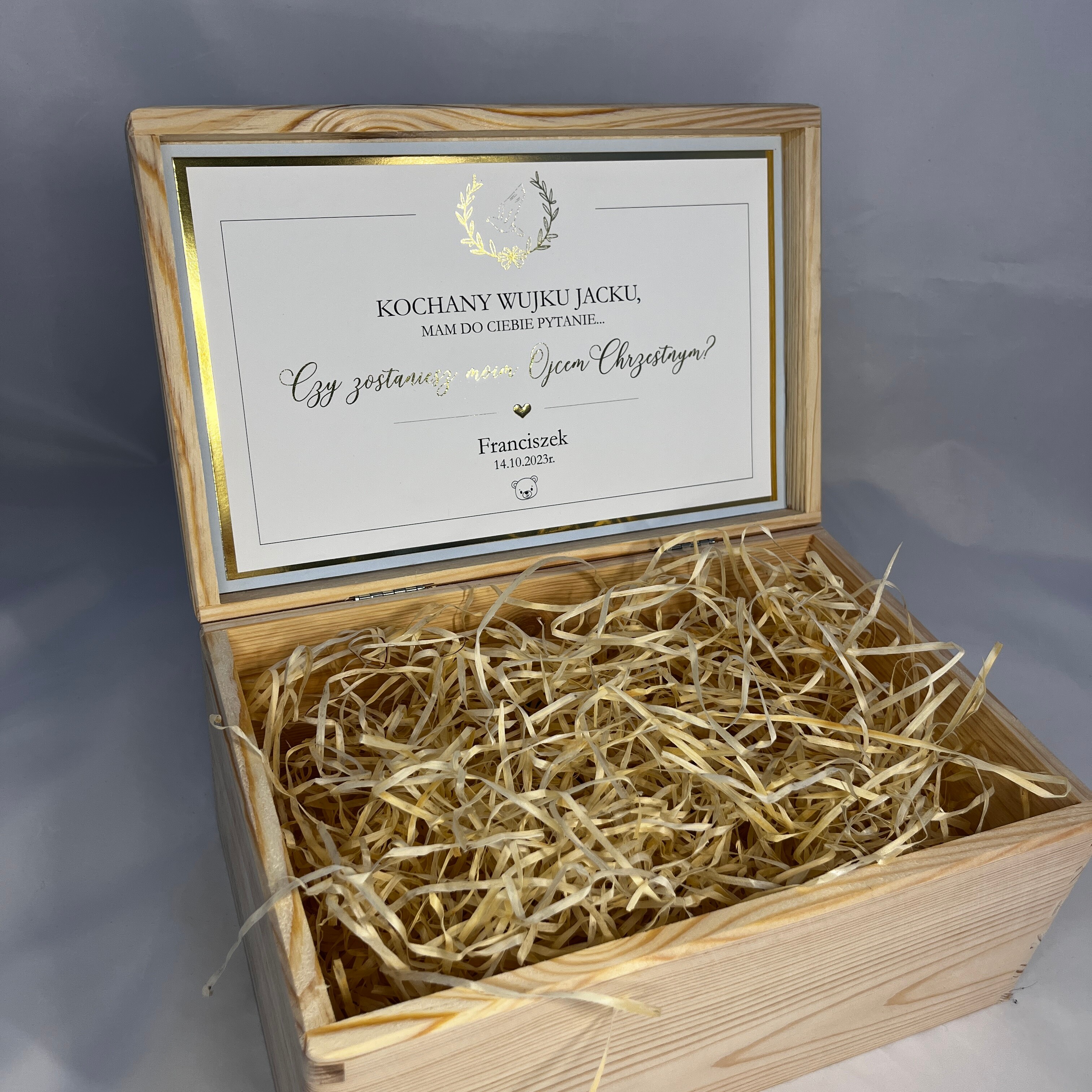 W pełni personalizowana skrzyneczka o wymiarze 30x20x13,5 cm z wypełnieniem w formie sianka. Idealnie sprawdzi się, by poprosić bliską nam osobę o bycie świadkiem, chrzestnym, bądź podarowanie jako wyjątkowy prezent.