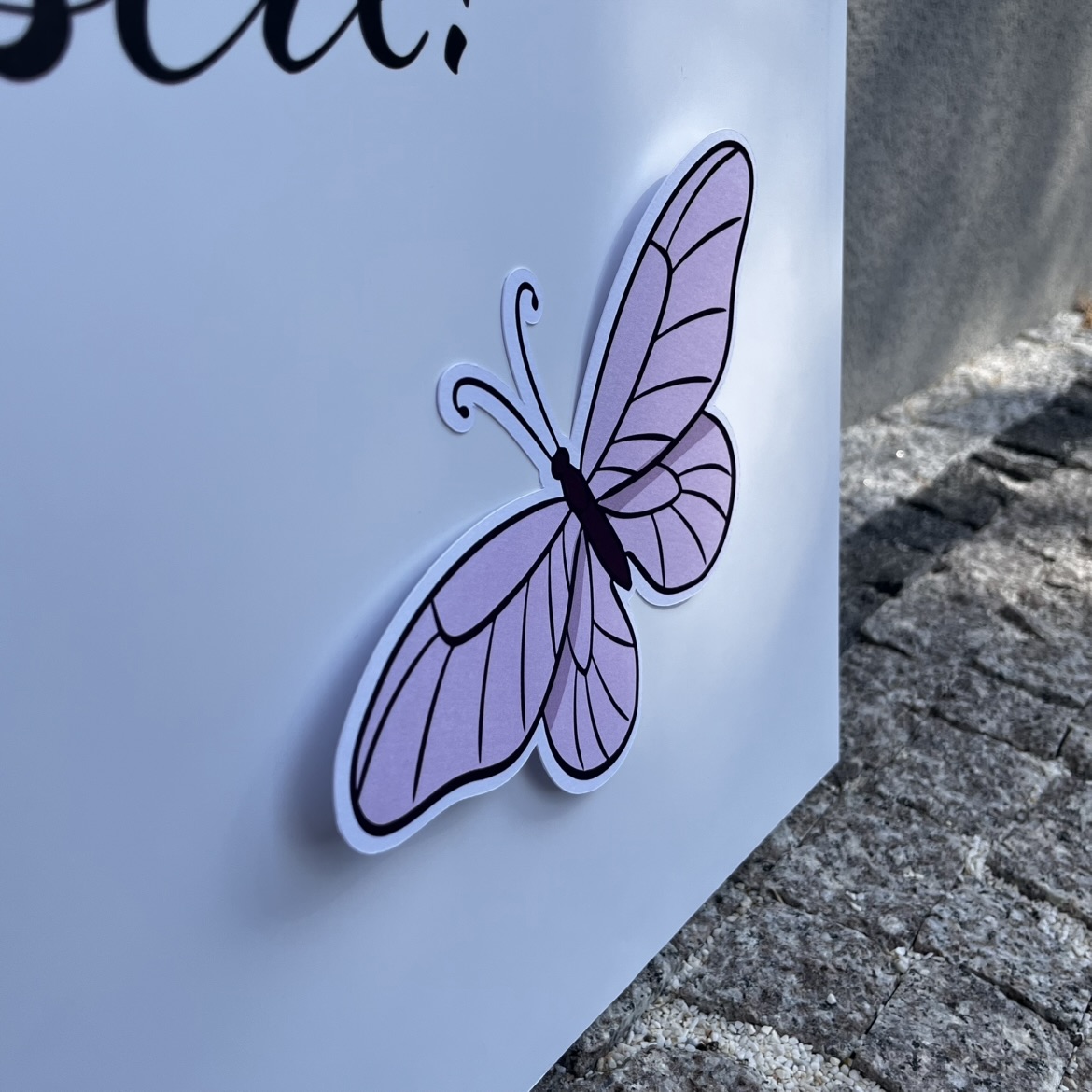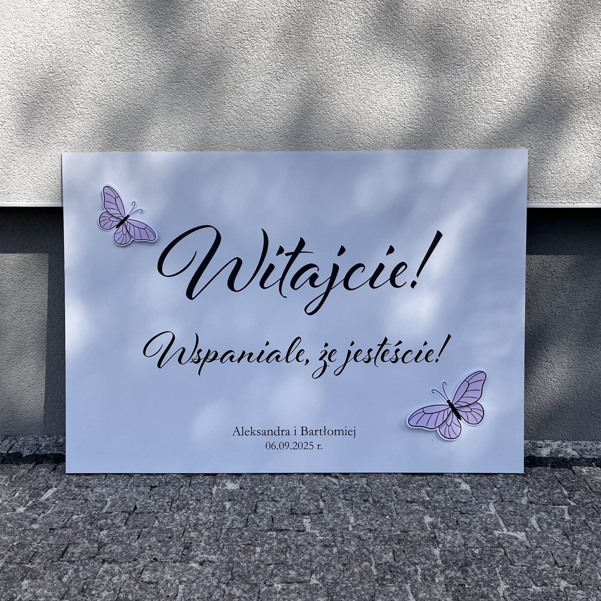Tablica powitalna z własnym napisem oraz motylkami 3D w dowolnym kolorze.