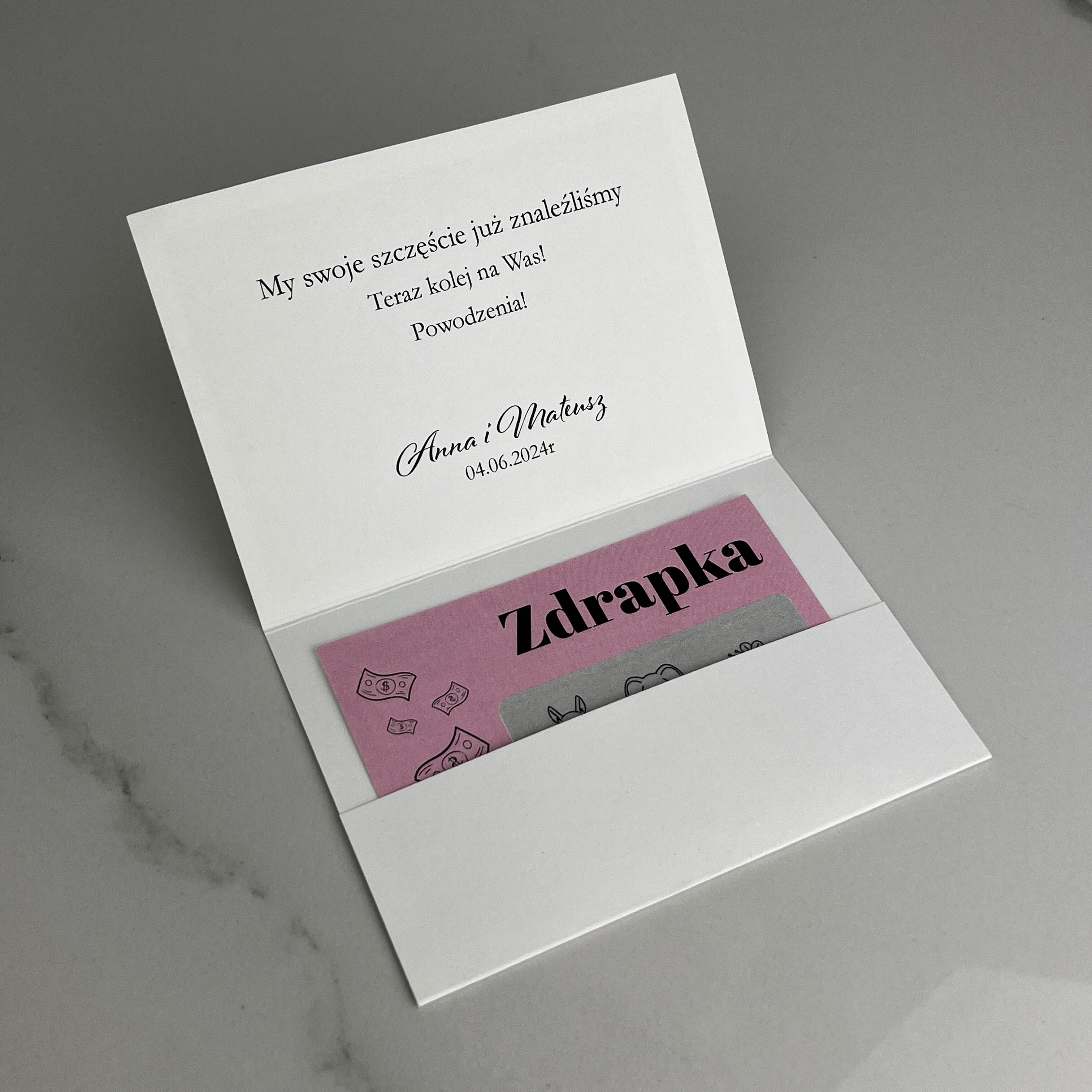 W środku winietki znajduje się mała kieszonka na zdrapkę.