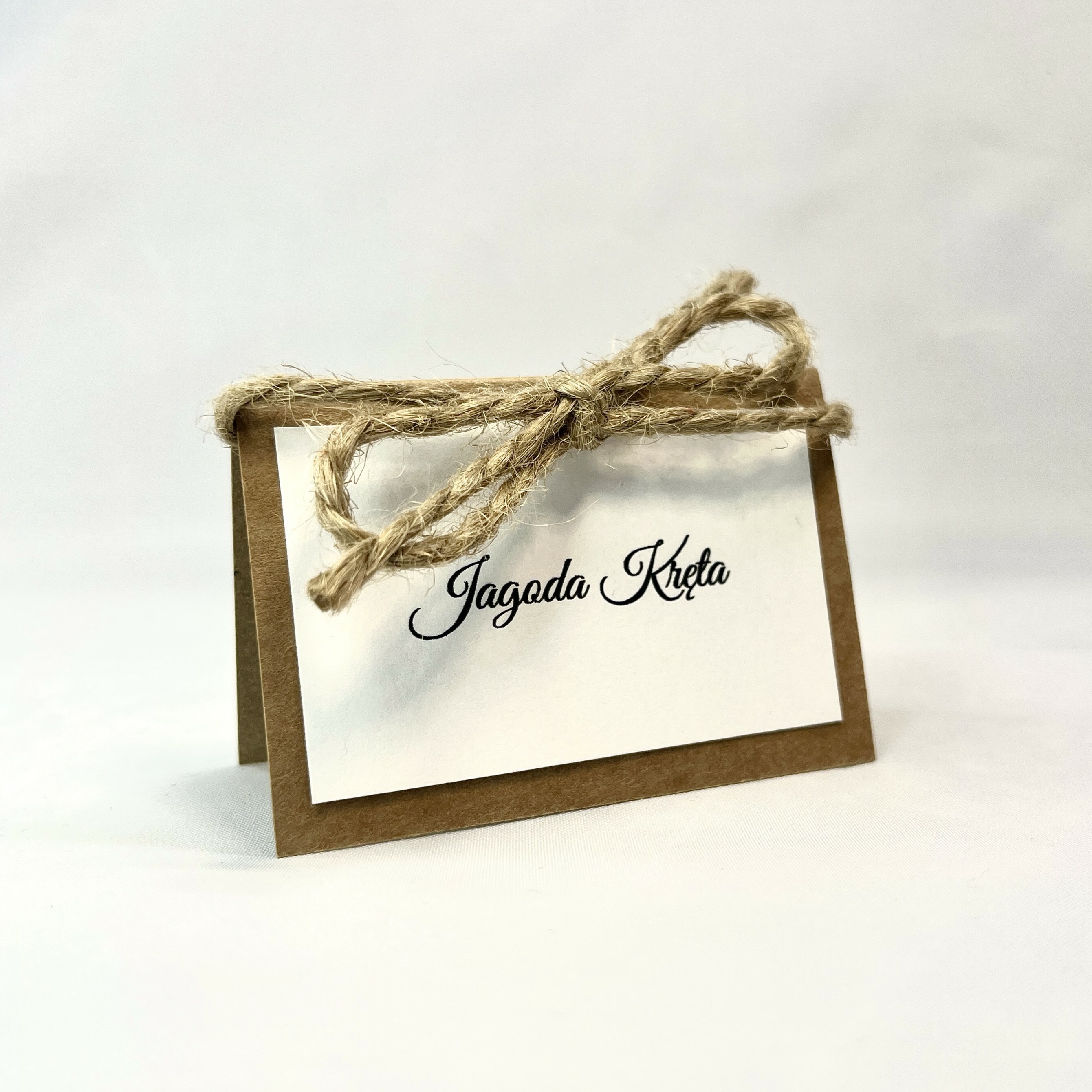 Elegancka winietka w stylu boho/ rustykalnym ze sznurkiem. Baza z ekologicznego, brązowego papieru nadaje szyku, a delikatna biała wklejka lekkości w wyglądzie. Idealna na stoły weselne jak i również na inne przyjęcia okolicznościowe.