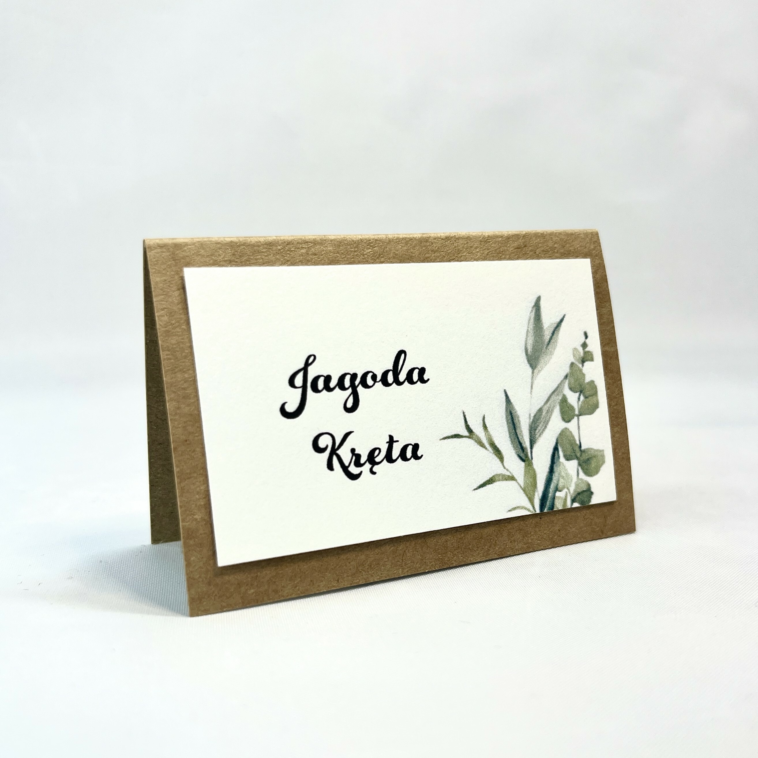 Elegancka winietka w stylu boho/ rustykalnym z motywem liści idealnie pasująca do zaproszeń. Baza z ekologicznego, brązowego papieru nadaje szyku, a delikatna biała wklejka lekkości w wyglądzie. Idealna na stoły weselne jak i również na inne przyjęcia okolicznościowe.