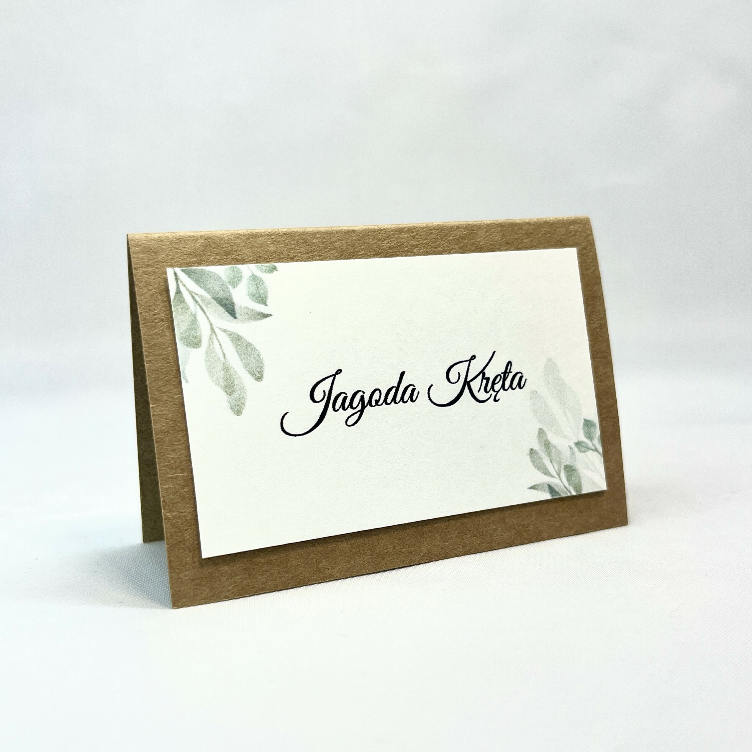Elegancka winietka w stylu boho/ rustykalnym z motywem liści idealnie pasująca do zaproszeń. Baza z ekologicznego, brązowego papieru nadaje szyku, a delikatna biała wklejka lekkości w wyglądzie. Idealna na stoły weselne jak i również na inne przyjęcia okolicznościowe.