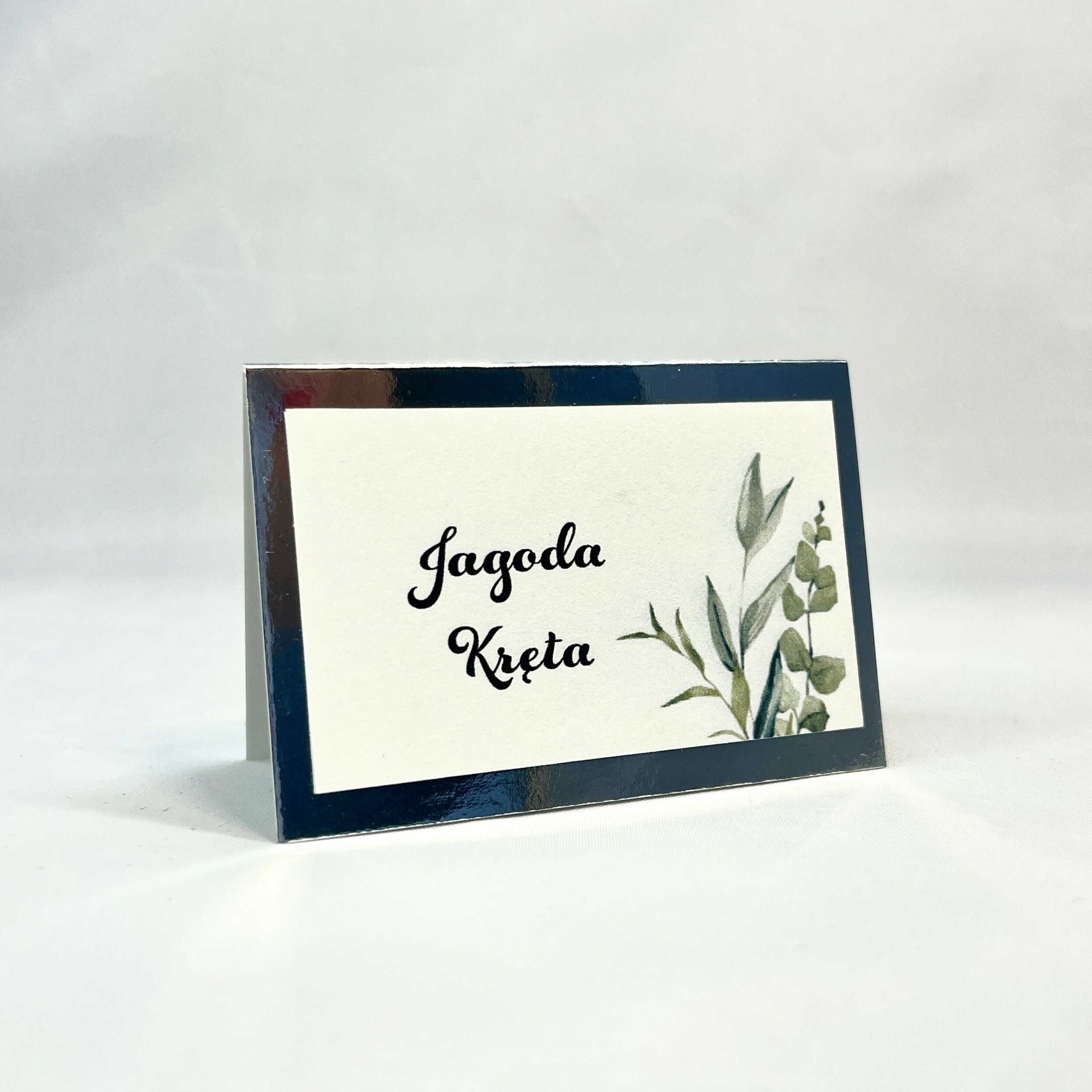 Elegancka winietka w stylu glamour z motywem liści idealnie pasująca do zaproszeń. Srebrna baza nadaje szyku, a delikatna biała wklejka lekkości w wyglądzie. Idealna na stoły weselne jak i również na inne przyjęcia okolicznościowe.