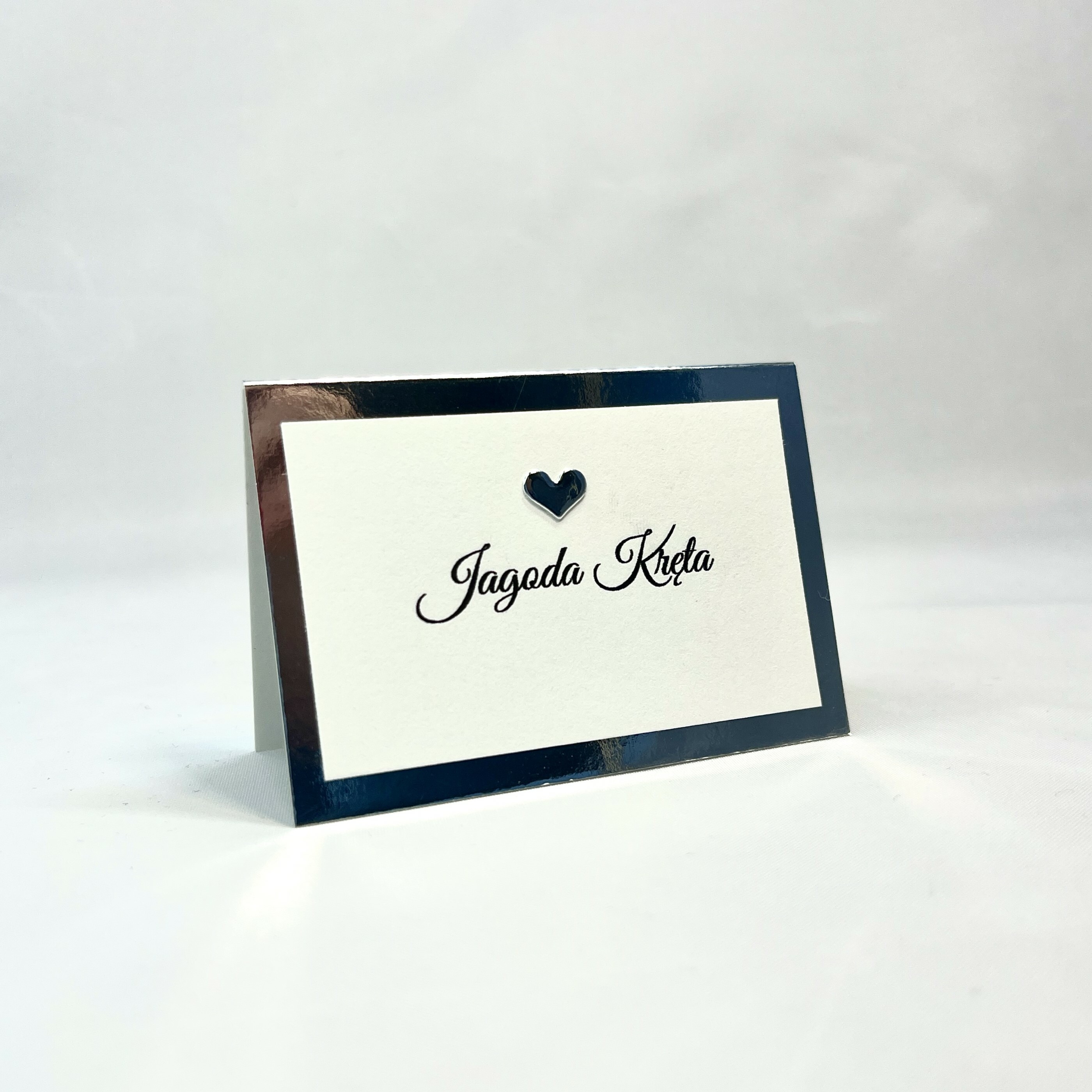 Elegancka, minimalistyczna winietka w stylu glamour z naklejanym serduszkiem. Srebrna baza nadaje szyku, a delikatna biała wklejka lekkości w wyglądzie. Idealna na stoły weselne jak i również na inne przyjęcia okolicznościowe.