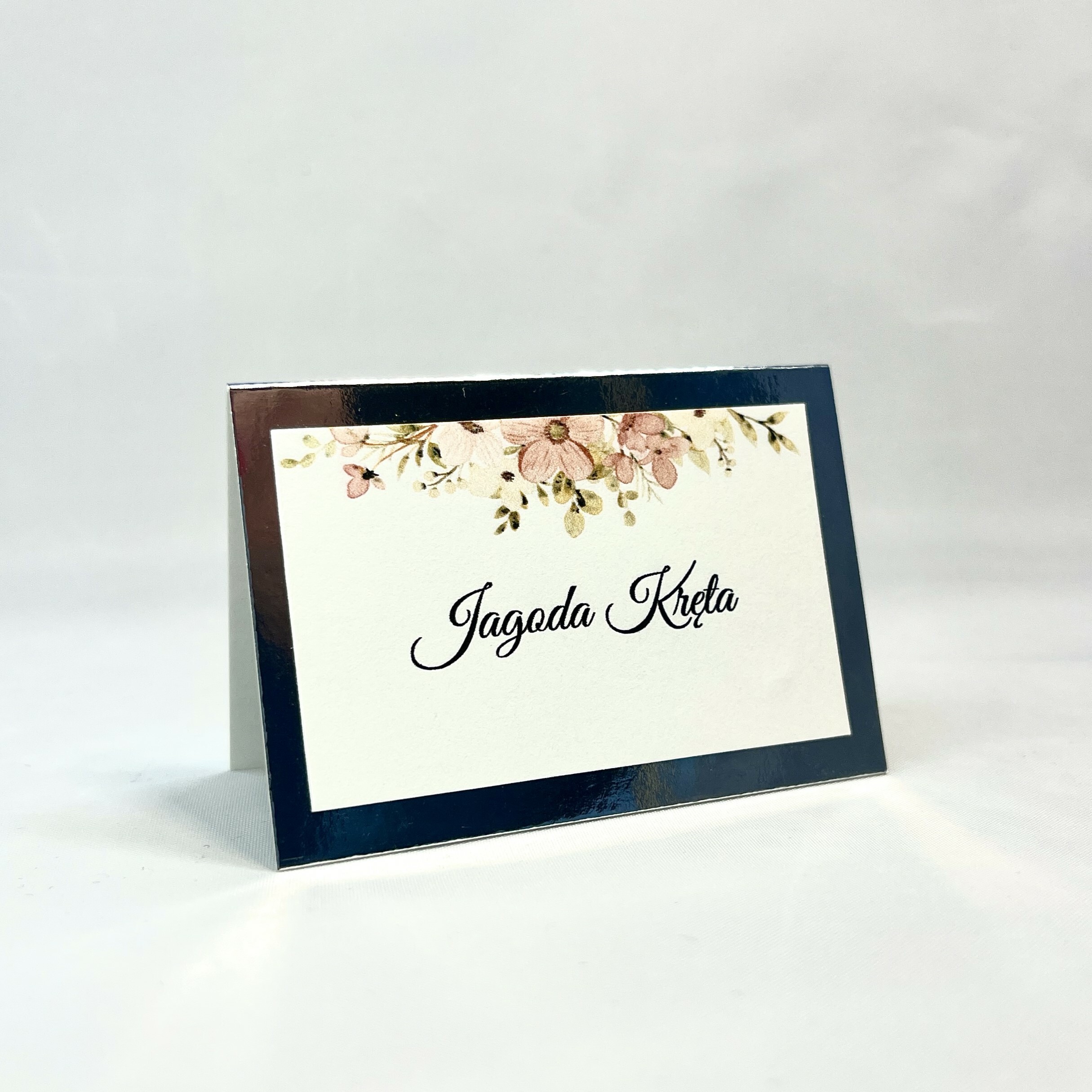 Elegancka winietka w stylu glamour z motywem kwiatów idealnie pasująca do zaproszeń. Srebrna baza nadaje szyku, a delikatna biała wklejka lekkości w wyglądzie. Idealna na stoły weselne jak i również na inne przyjęcia okolicznościowe.