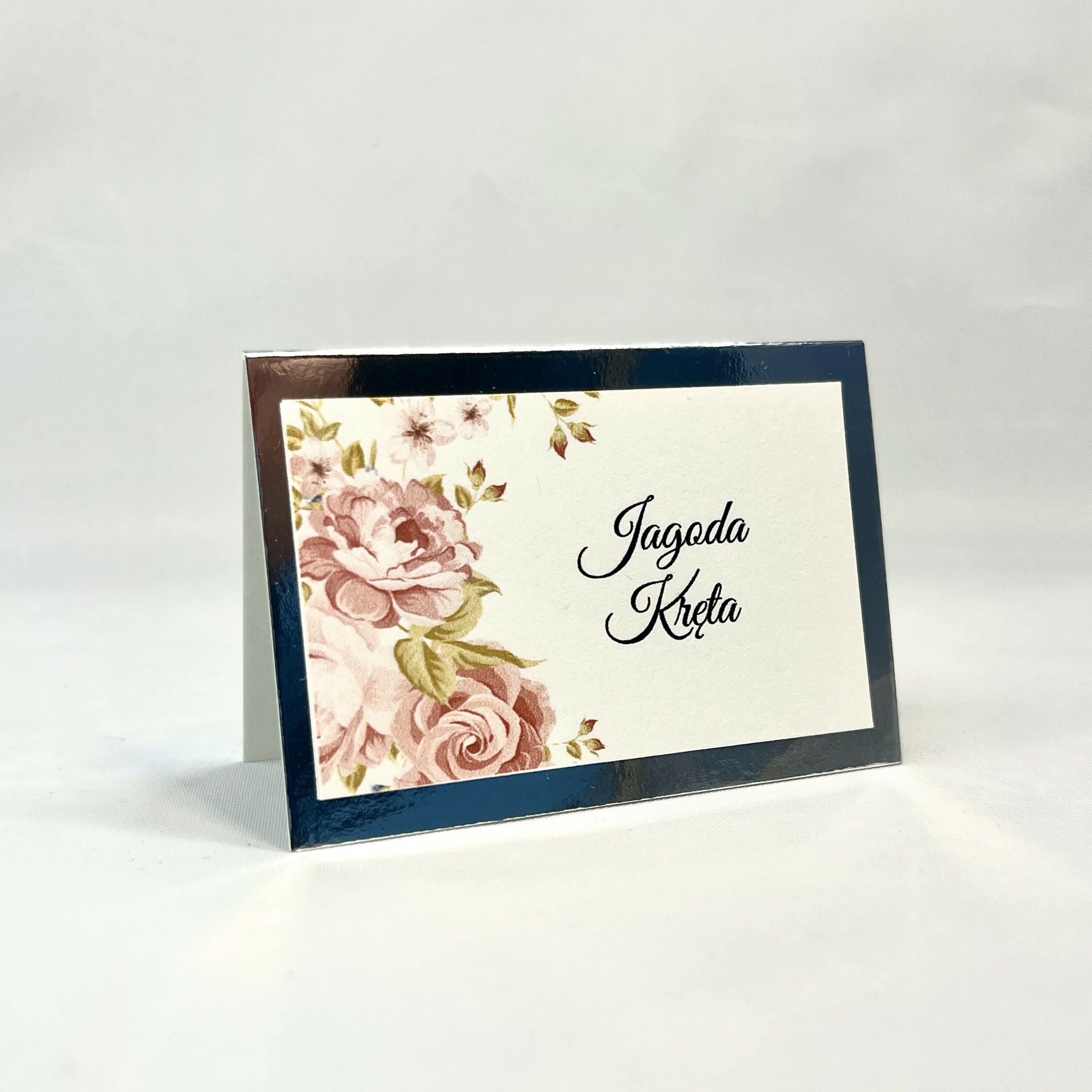 Elegancka winietka w stylu glamour z motywem kwiatów idealnie pasująca do zaproszeń. Srebrna baza nadaje szyku, a delikatna biała wklejka lekkości w wyglądzie. Idealna na stoły weselne jak i również na inne przyjęcia okolicznościowe.