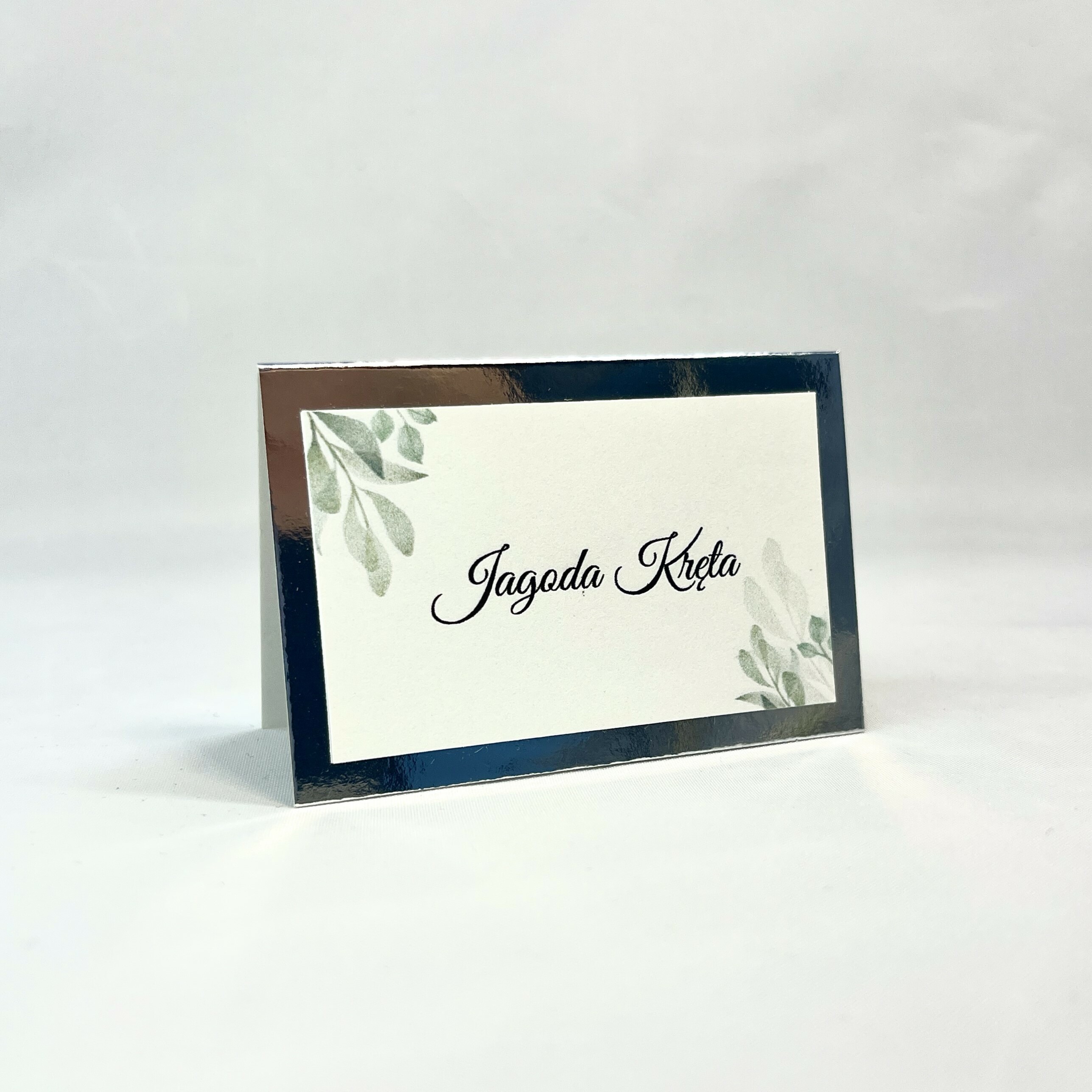 Elegancka winietka w stylu glamour z motywem liści idealnie pasująca do zaproszeń. Srebrna baza nadaje szyku, a delikatna biała wklejka lekkości w wyglądzie. Idealna na stoły weselne jak i również na inne przyjęcia okolicznościowe.