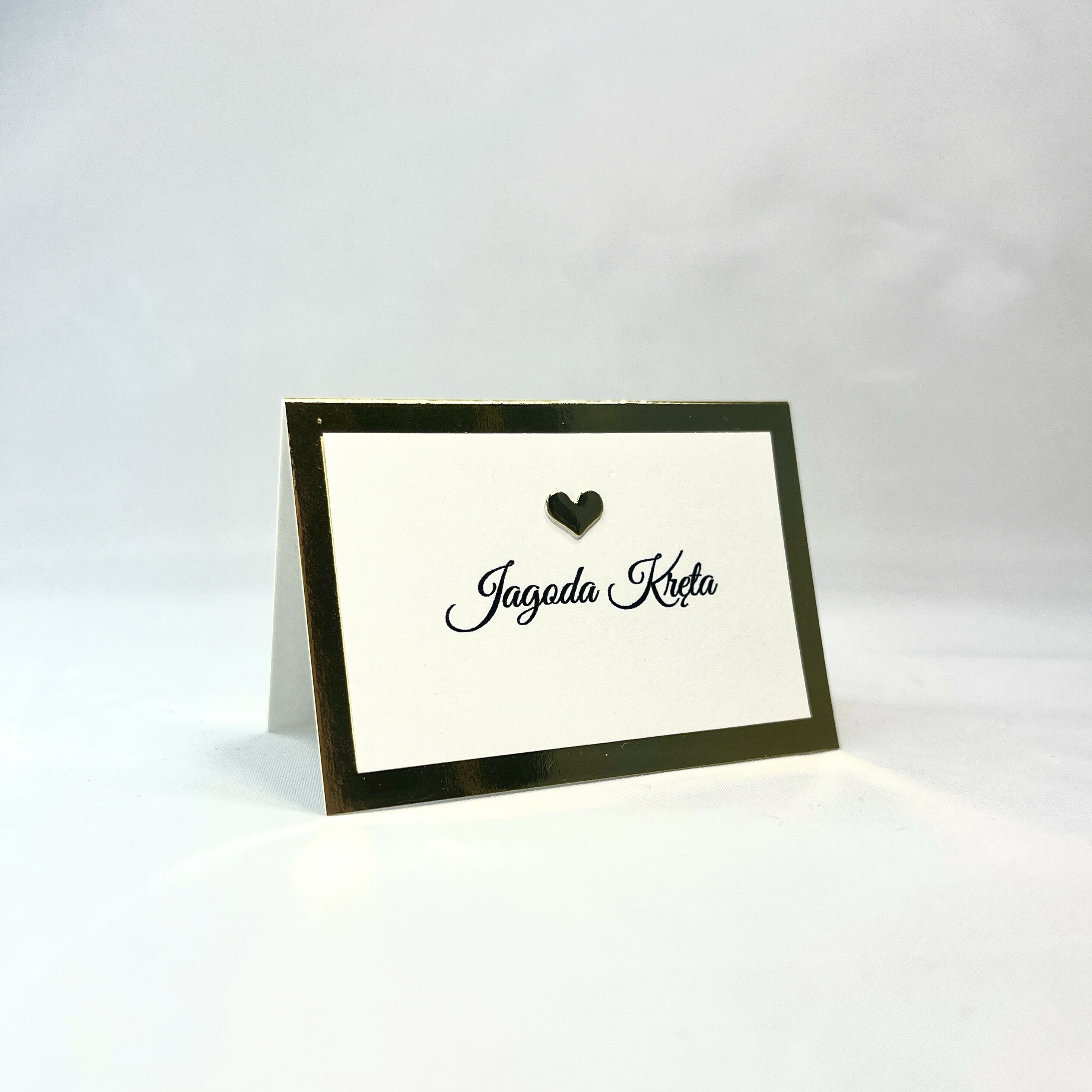 Elegancka, minimalistyczna winietka w stylu glamour z naklejanym serduszkiem. Złota baza nadaje szyku, a delikatna biała wklejka lekkości w wyglądzie. Idealna na stoły weselne jak i również na inne przyjęcia okolicznościowe.
