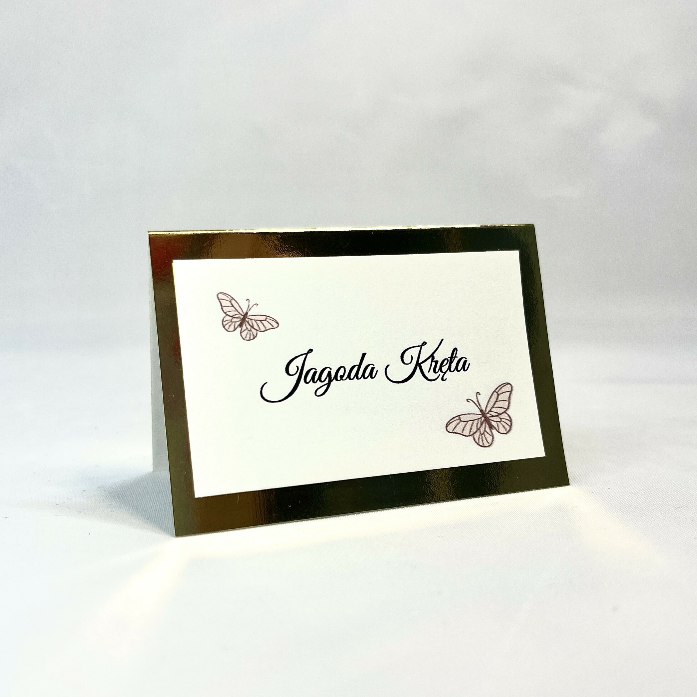 Elegancka winietka w stylu glamour z motylkami idealnie pasująca do zaproszeń. Złota baza nadaje szyku, a delikatna biała wklejka lekkości w wyglądzie. Idealna na stoły weselne jak i również na inne przyjęcia okolicznościowe.