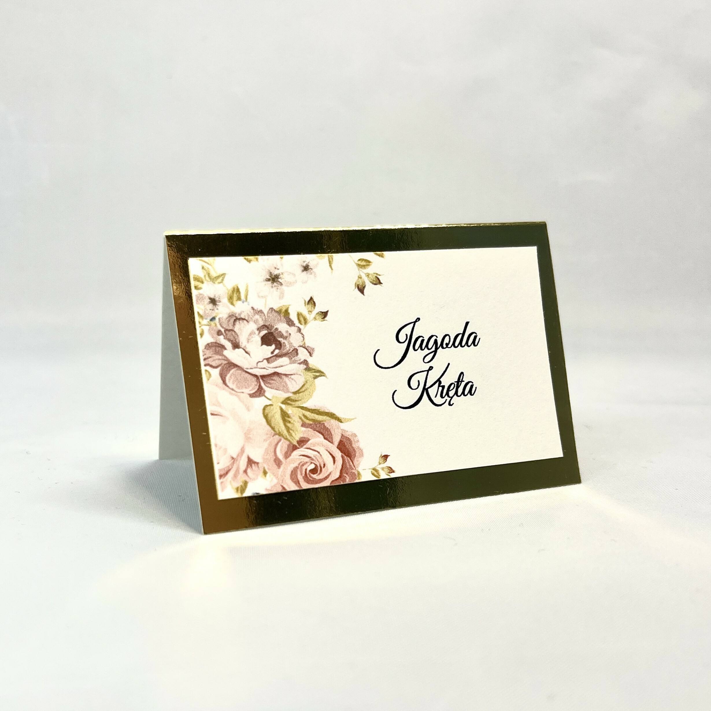 Elegancka winietka w stylu glamour z motywem kwiatów idealnie pasująca do zaproszeń. Złota baza nadaje szyku, a delikatna biała wklejka lekkości w wyglądzie. Idealna na stoły weselne jak i również na inne przyjęcia okolicznościowe.