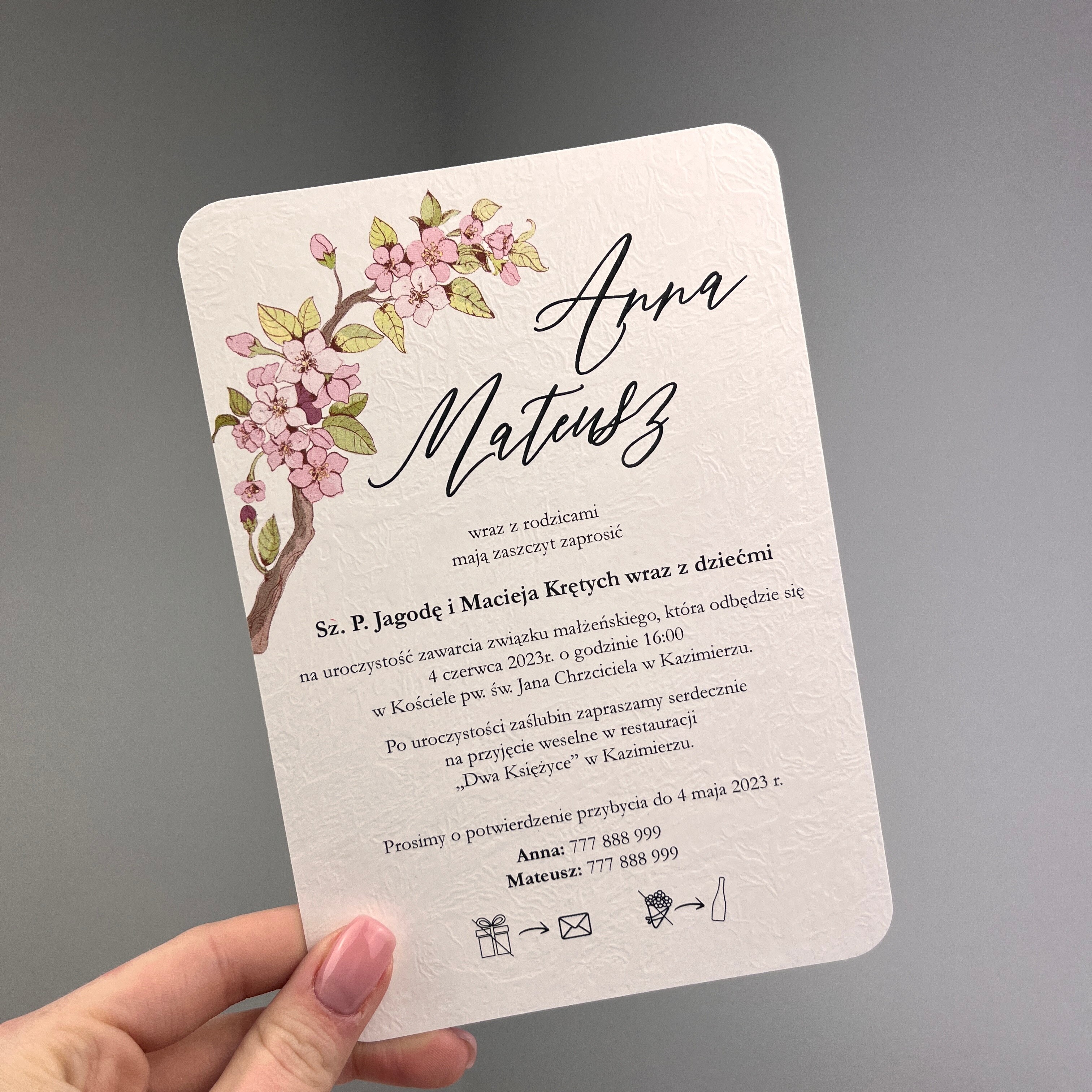Zaproszenie jednokartkowe z kwiatami. Papier o teksturze skóry, nadaje uroku oraz unikalności, a zaokrąglane rogi zaproszenia wyglądają delikatnie i dopełniają całość.