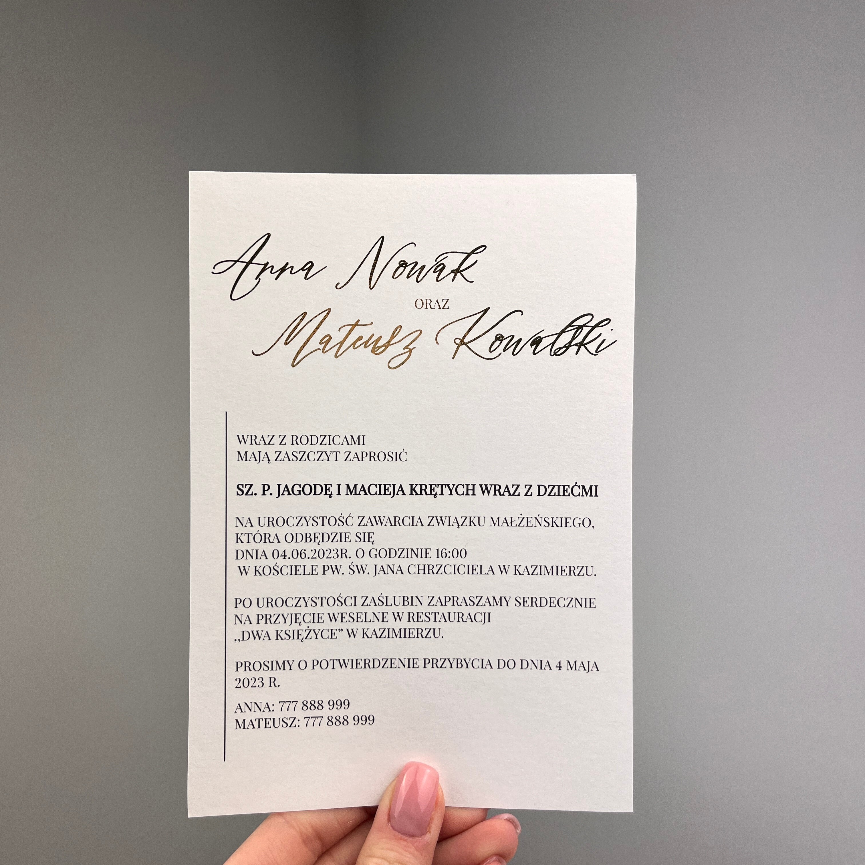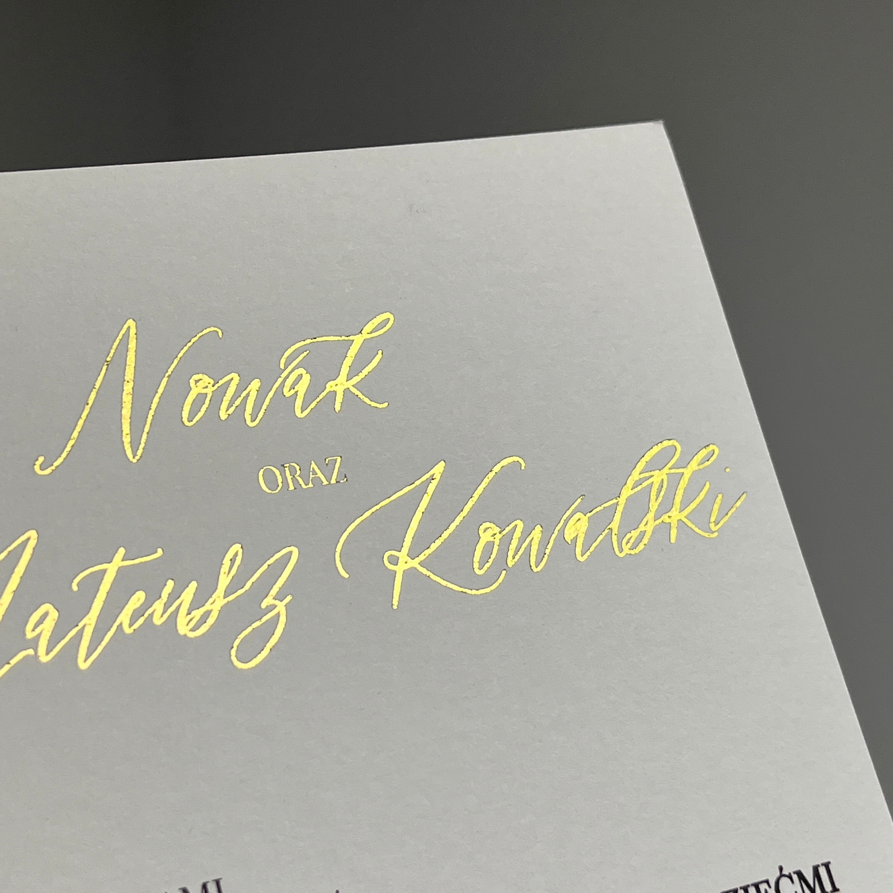 Zaproszenie jednokartkowe ze złoconym lub posrebrzanym napisem. Zaproszenie jest minimalistyczne, ale mieniące się detale nadają mu uroku.