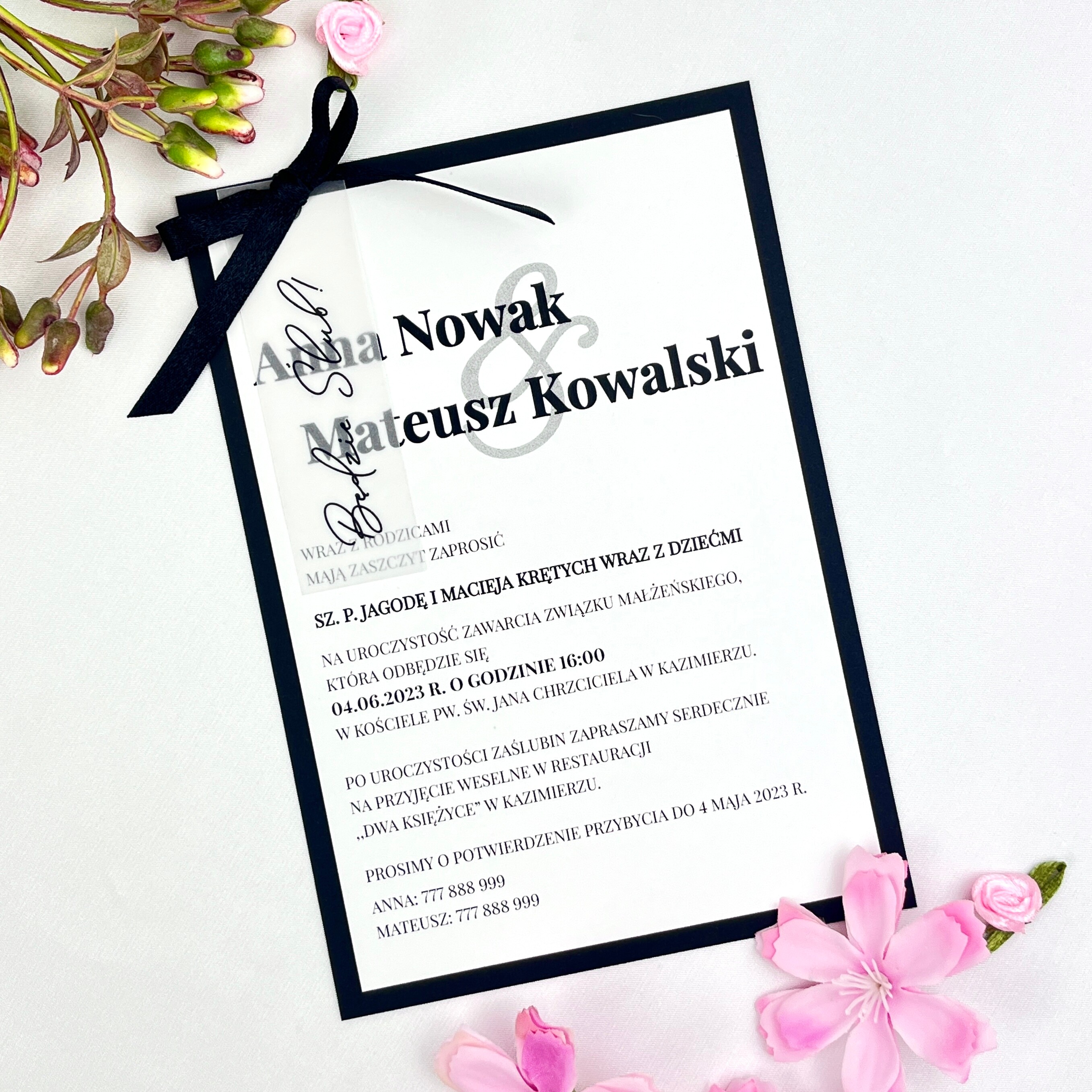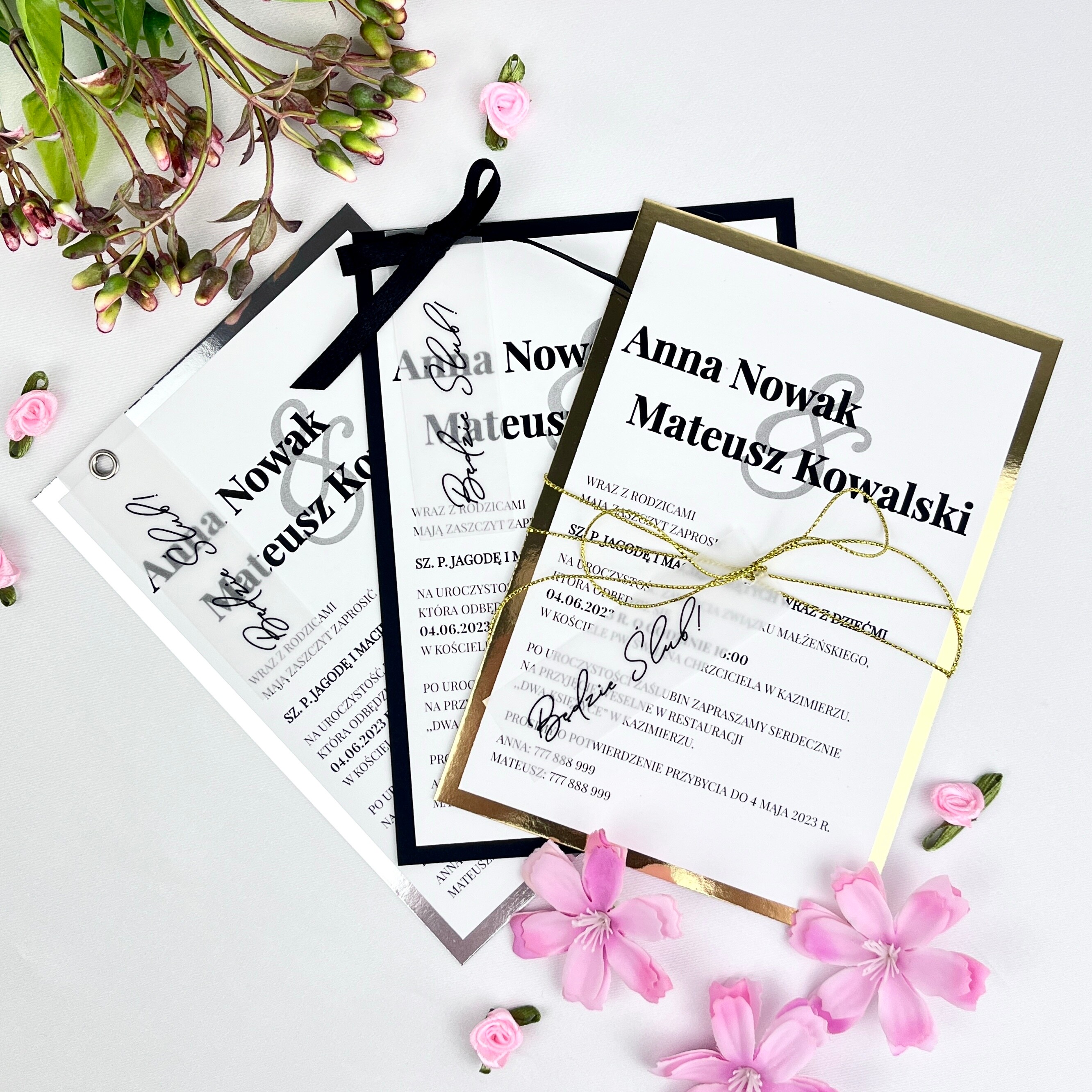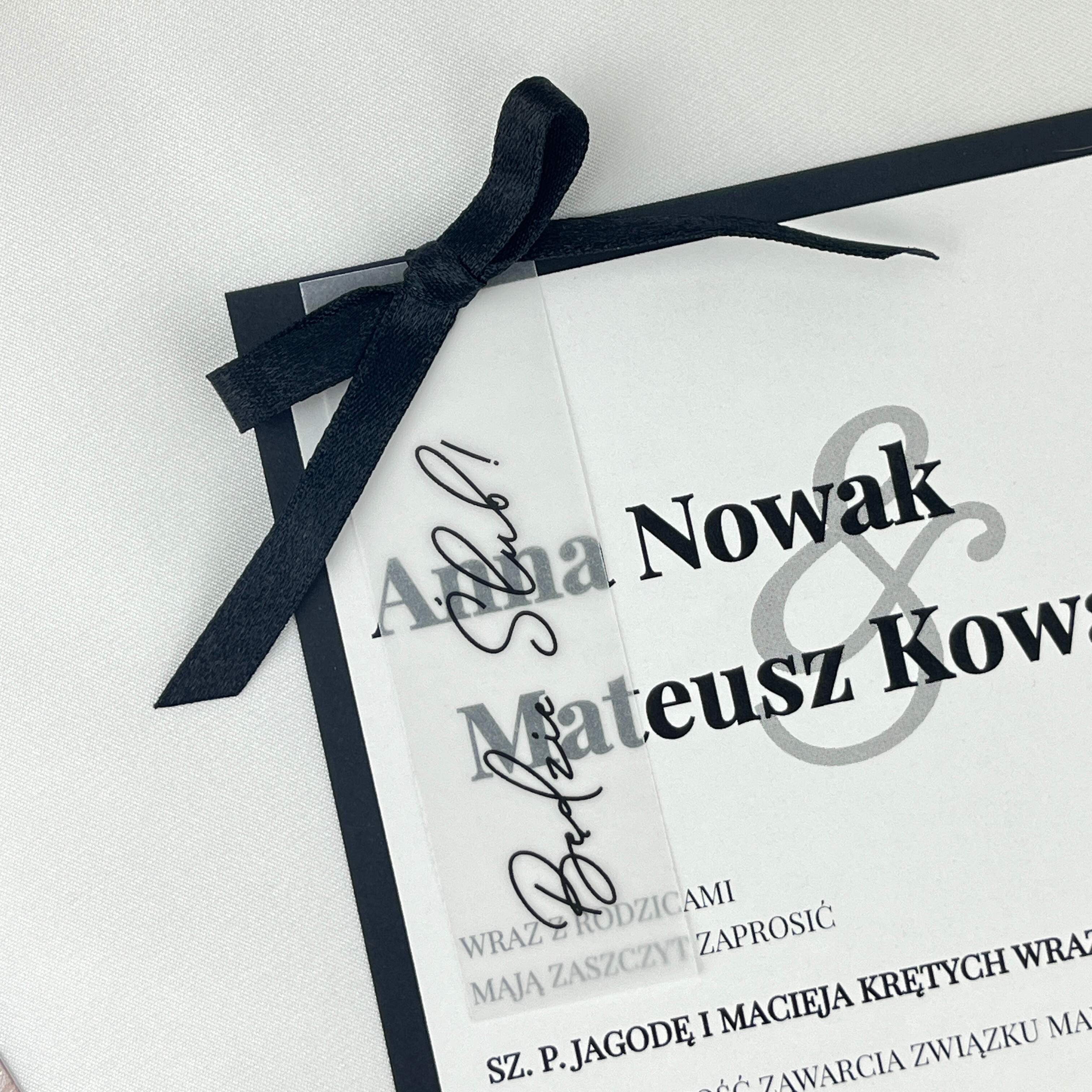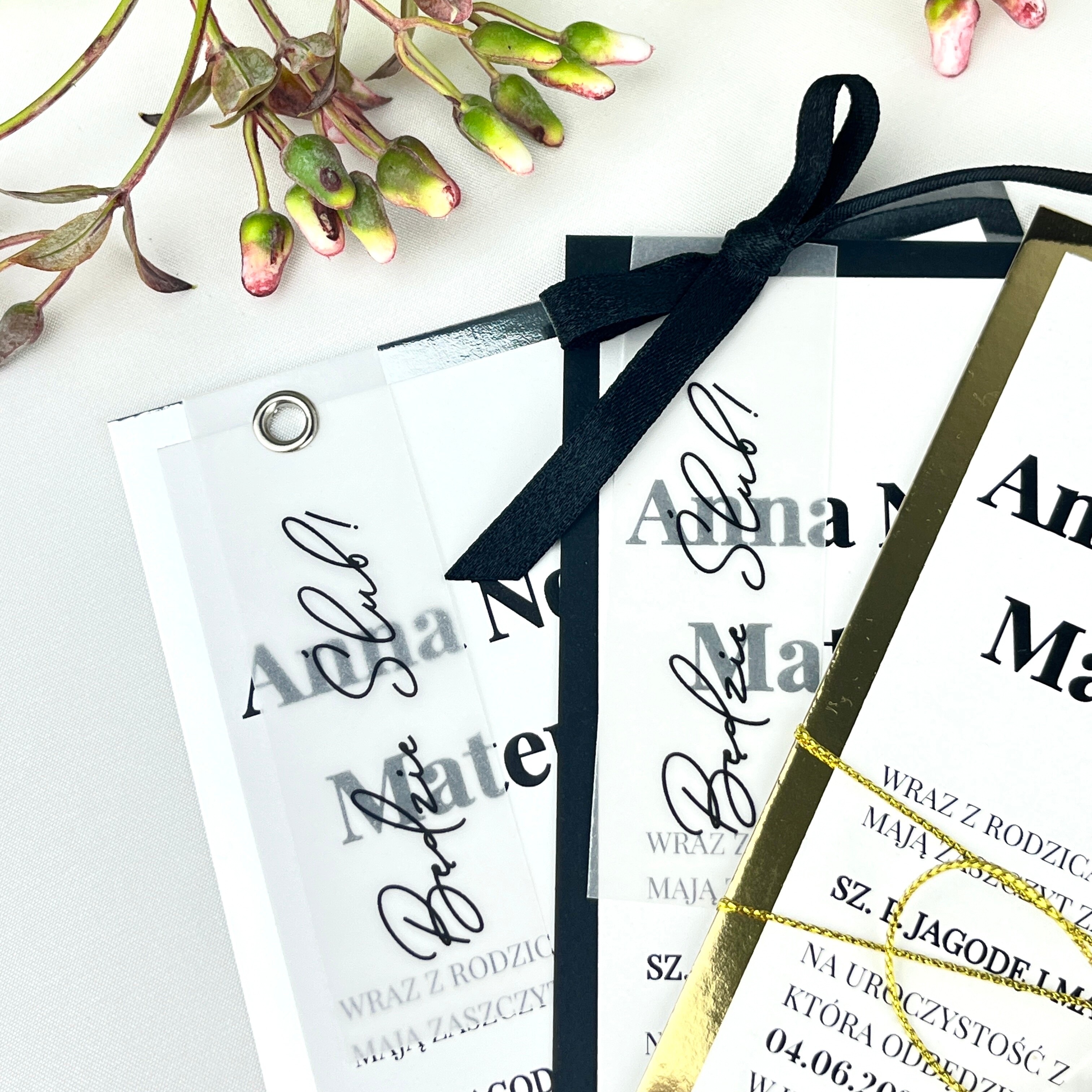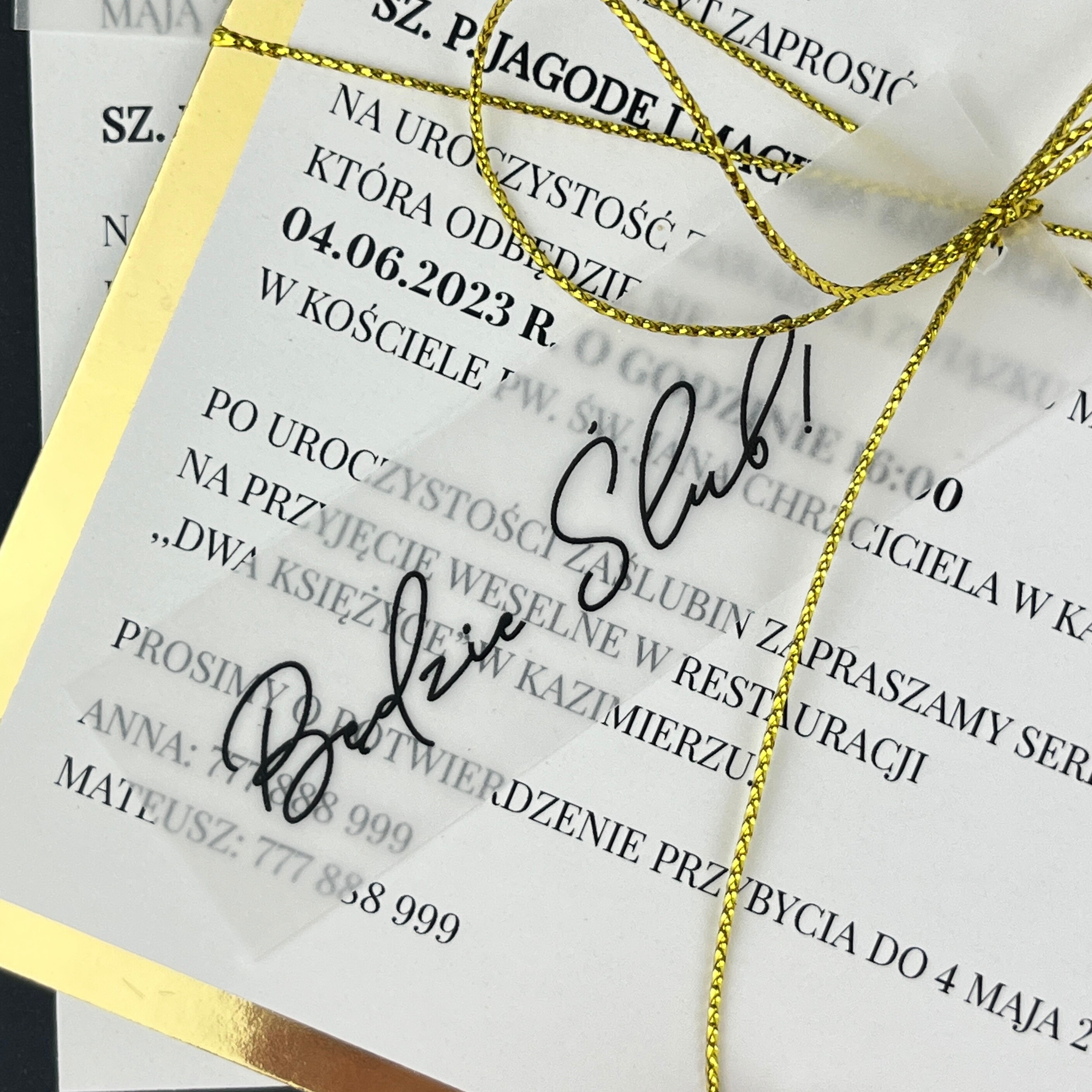 2) Zaproszenie z kokardką oraz małą karteczką z dowolnym napisem;