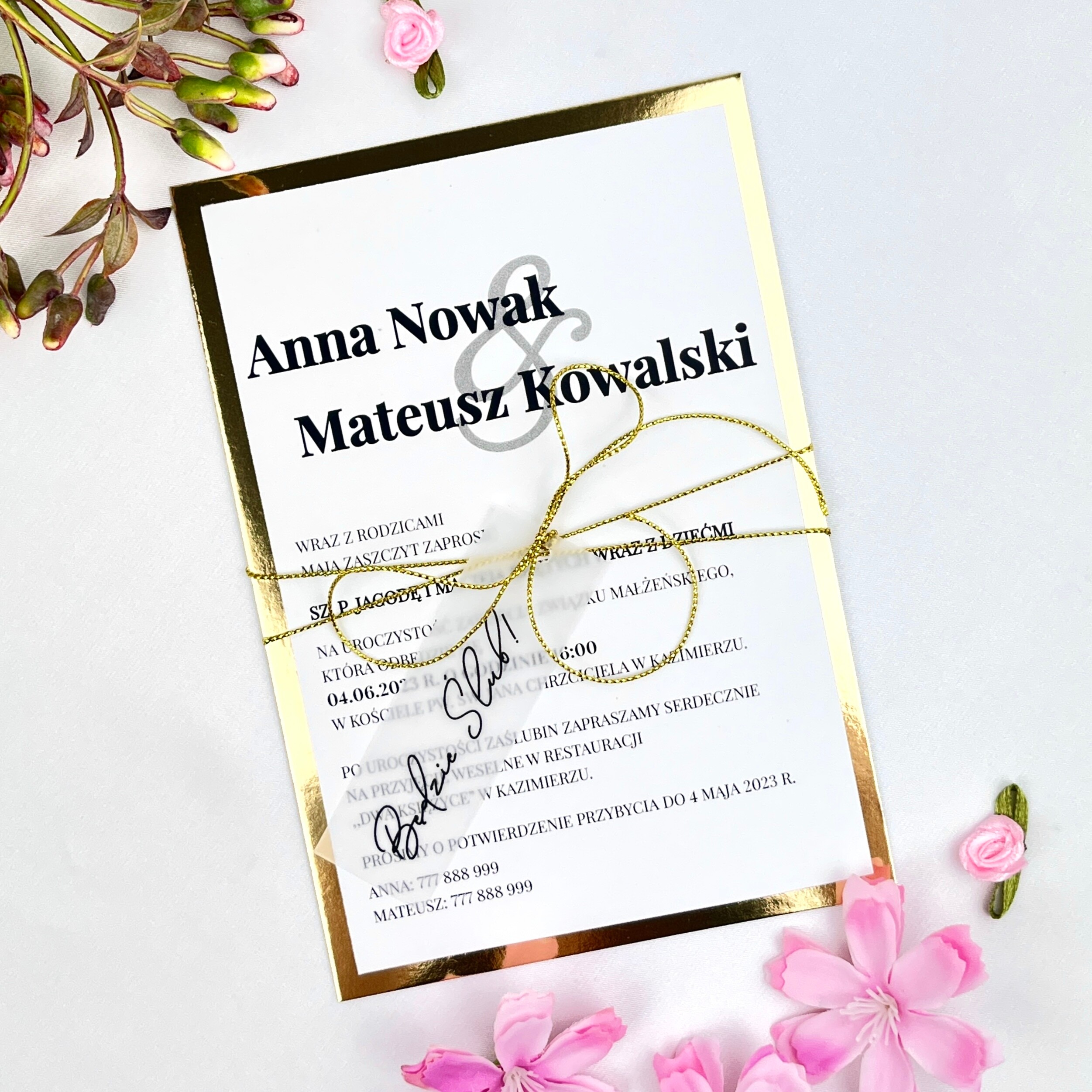 Zaproszenie jednokartkowe z dowolnego koloru ramką oraz dodatkami.