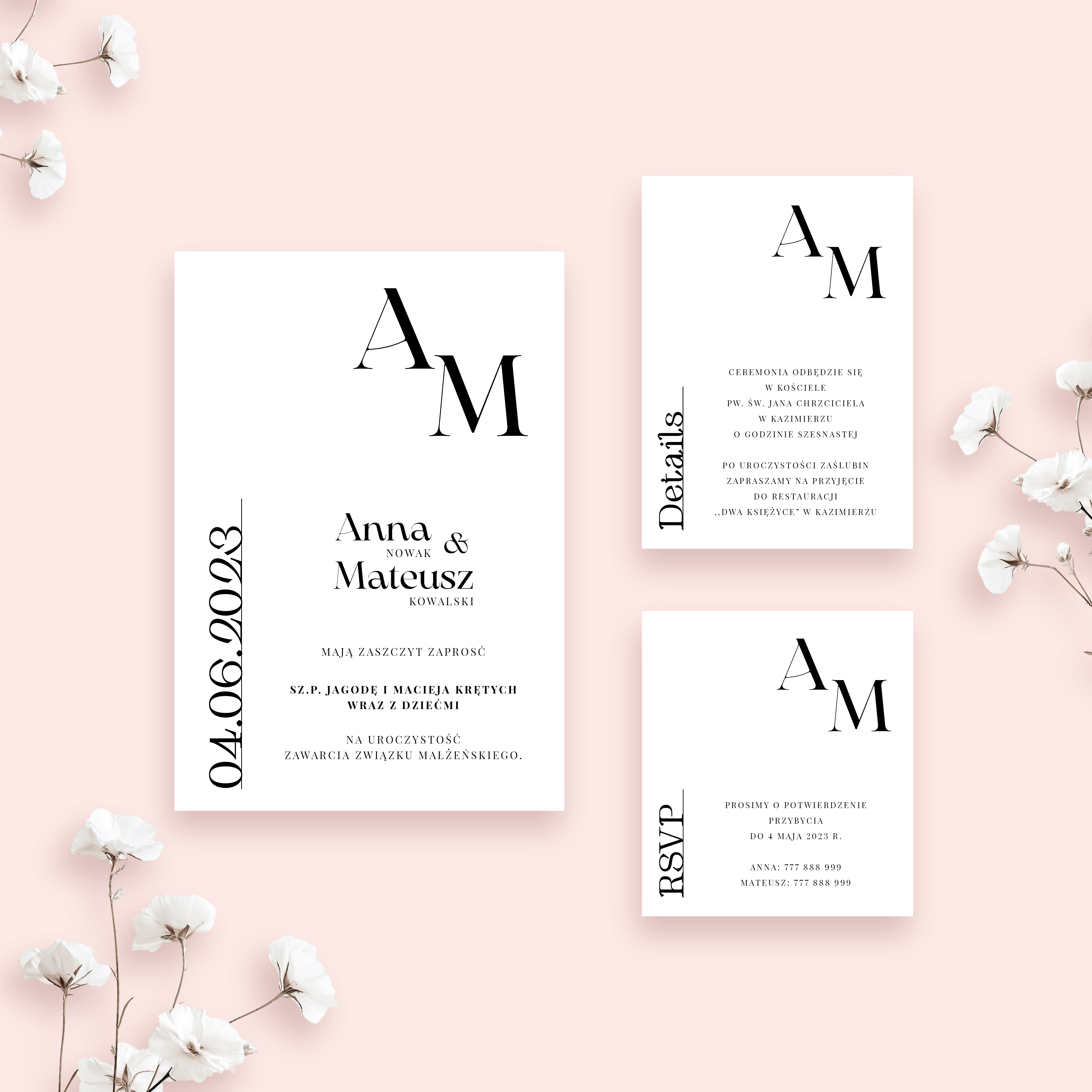 Eleganckie zaproszenie jednokartkowe z dwoma dodatkowymi bilecikami. Na jednym z nich znajdują się szczegóły tj. godzina i miejsce ceremonii oraz miejsce przyjęcia, natomiast na drugim - RSVP, czyli prośba o potwierdzenie przybycia.
