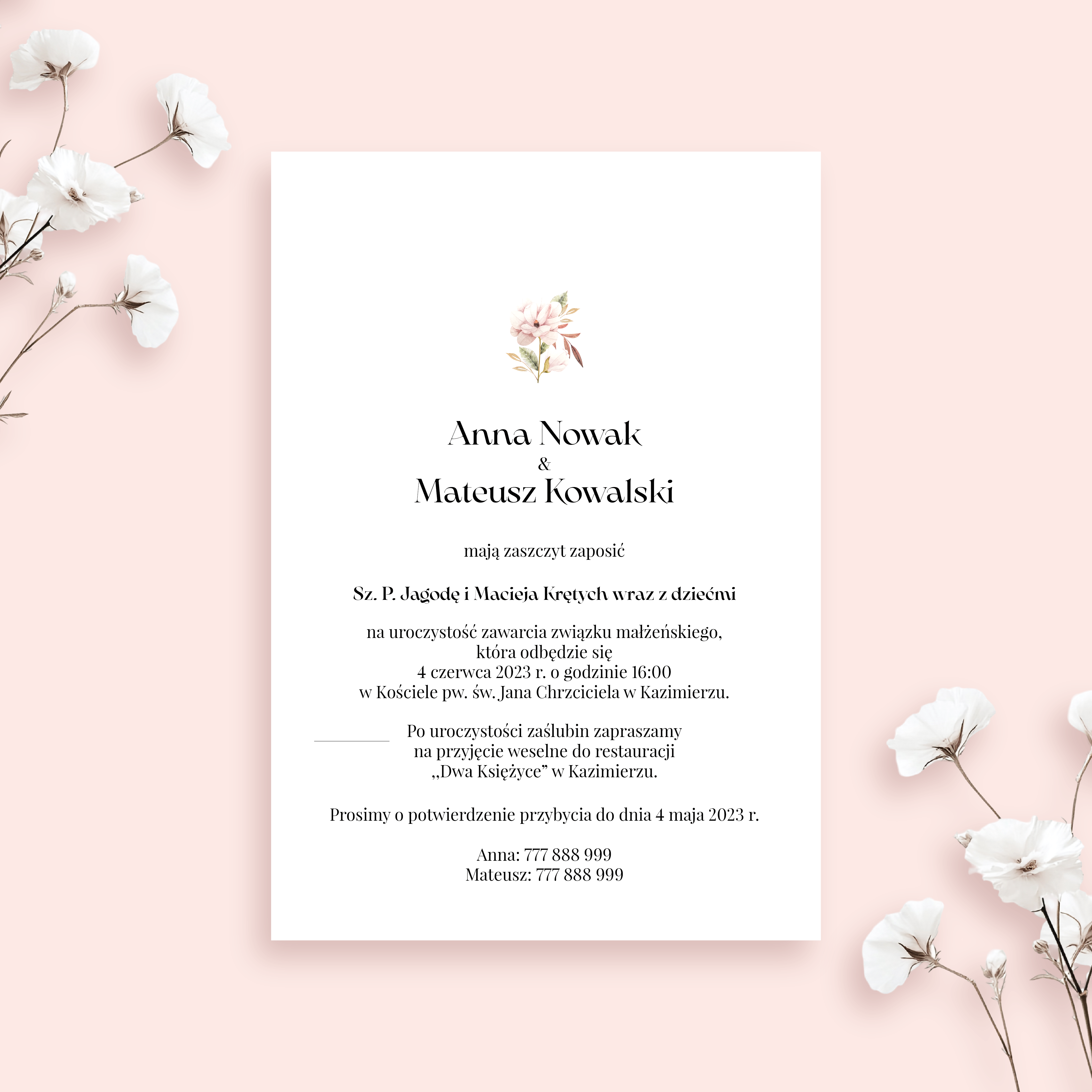 Delikatne zaproszenie jednokartkowe z kwiatem sprawdzi się idealnie dla osób ceniących prostotę i elegancję.