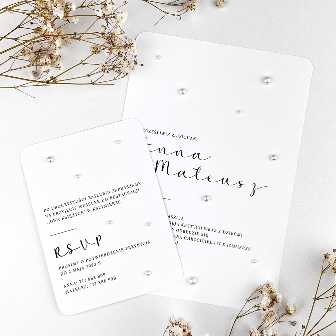 Zaproszenie jednokartkowe z bilecikiem oraz delikatnymi perełkami z pewnością przypadnie do gustu niejednej osobie, a zaokrąglane rogi kartek dodają całości uroku.