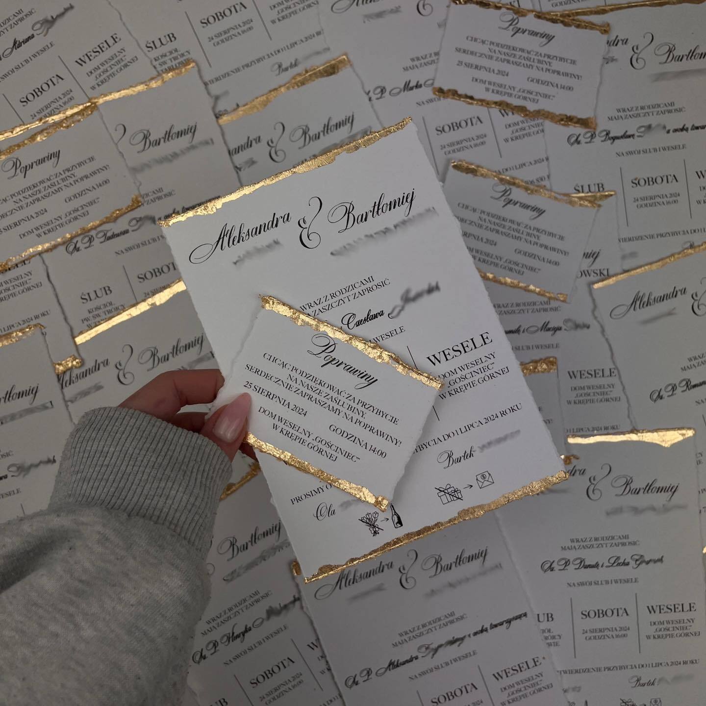 Zaproszenie i bilecik z rwanymi brzegami oraz delikatnym złoceniem/srebrzeniem zdecydowanie zwraca na siebie uwagę.