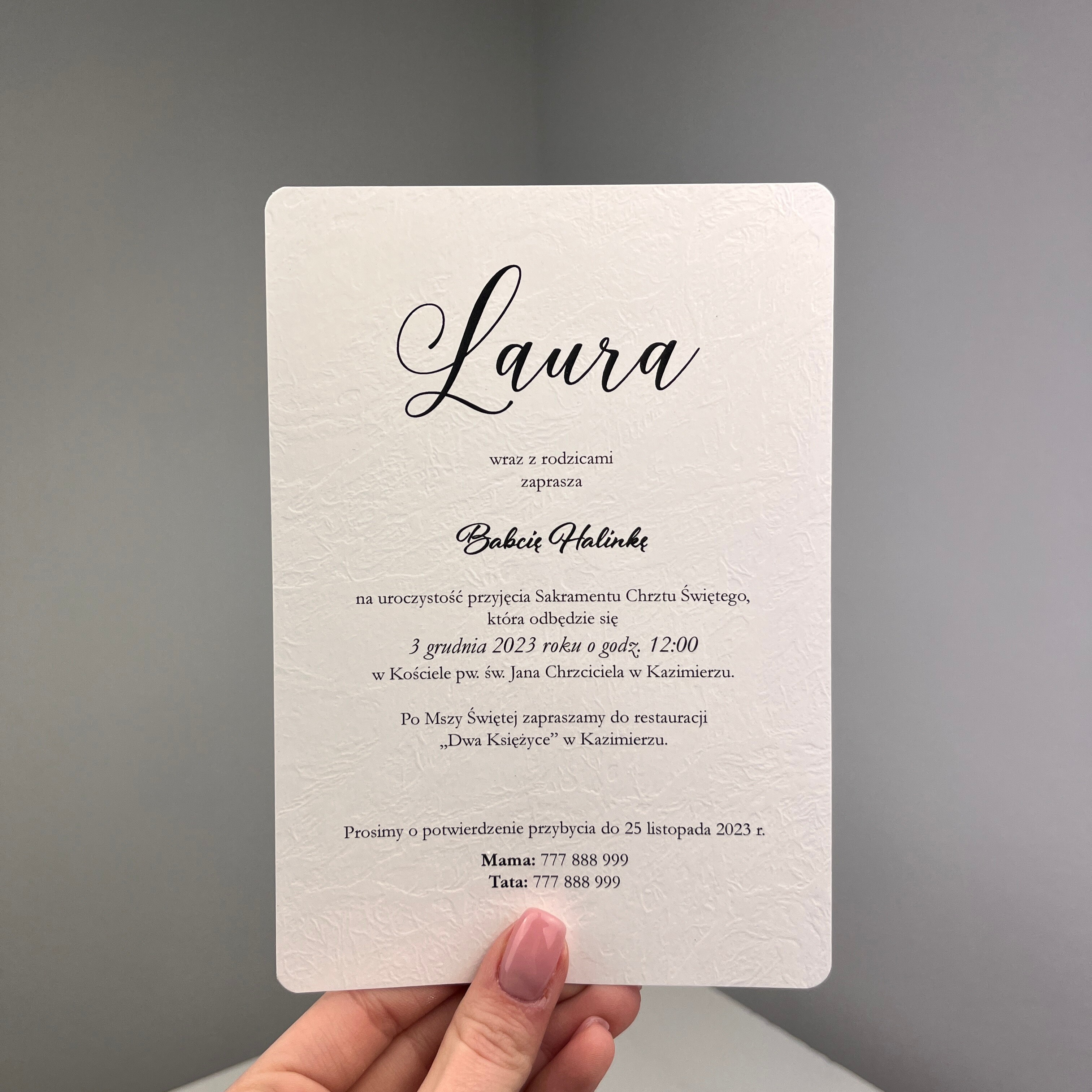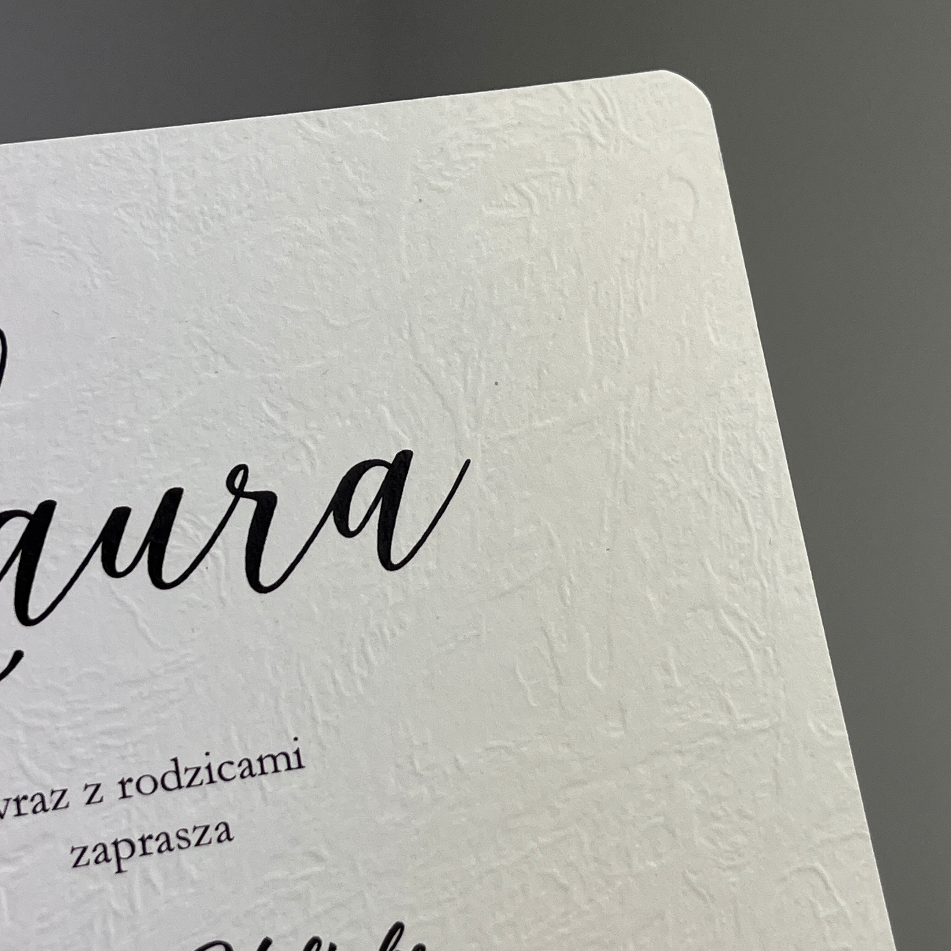 Zaproszenie jednokartkowe na dowolną okazję. Papier o teksturze skóry nadaje wyjątkowości, a zaokrąglone rogi delikatności i elegancji. Możliwość dowolnych modyfikacji.