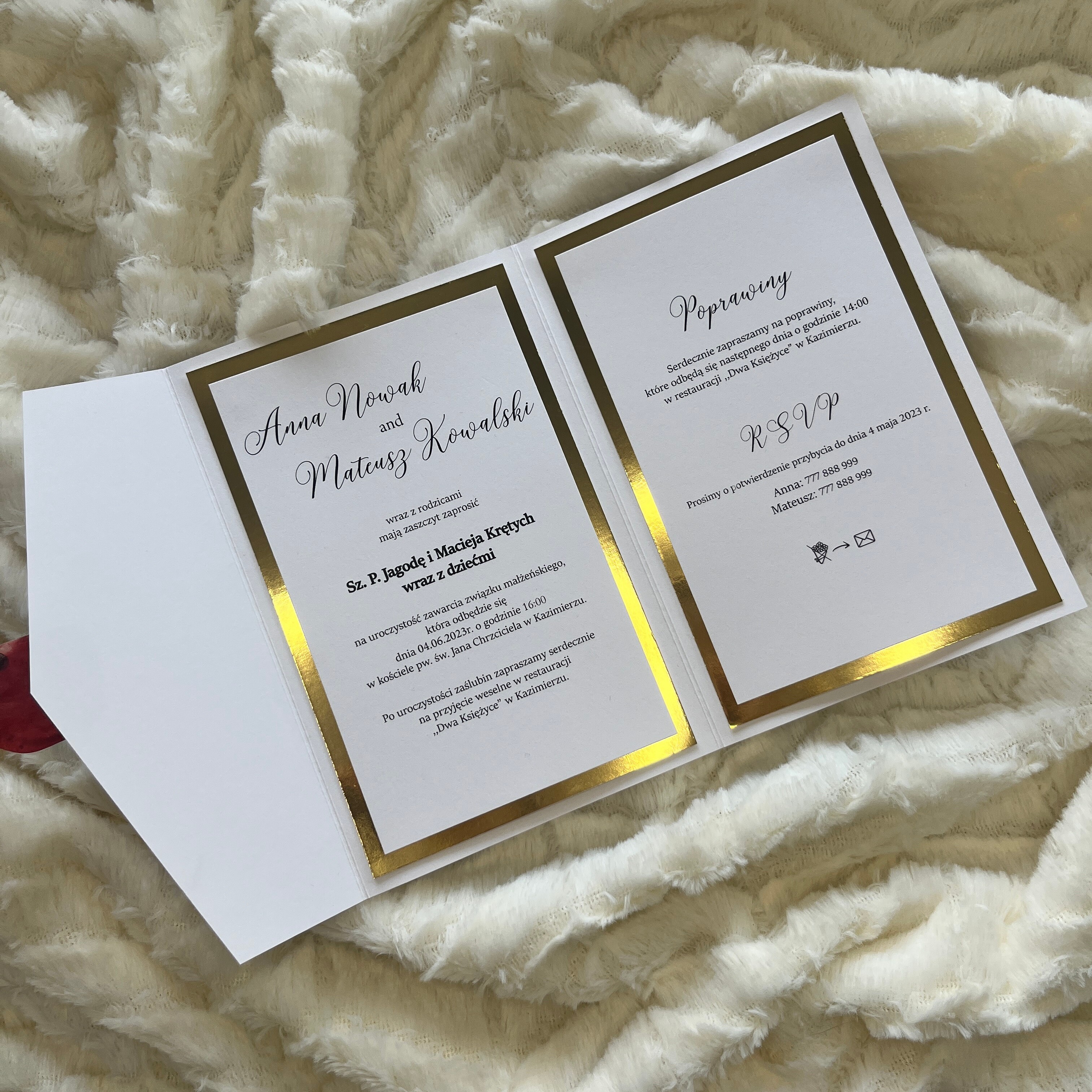 Eleganckie zaproszenie Ślubne w formie folderu. Delikatna złota, bądź srebrna rameczka idealnie dopełnia całość, a pieczątka nadaje klasy i szyku.