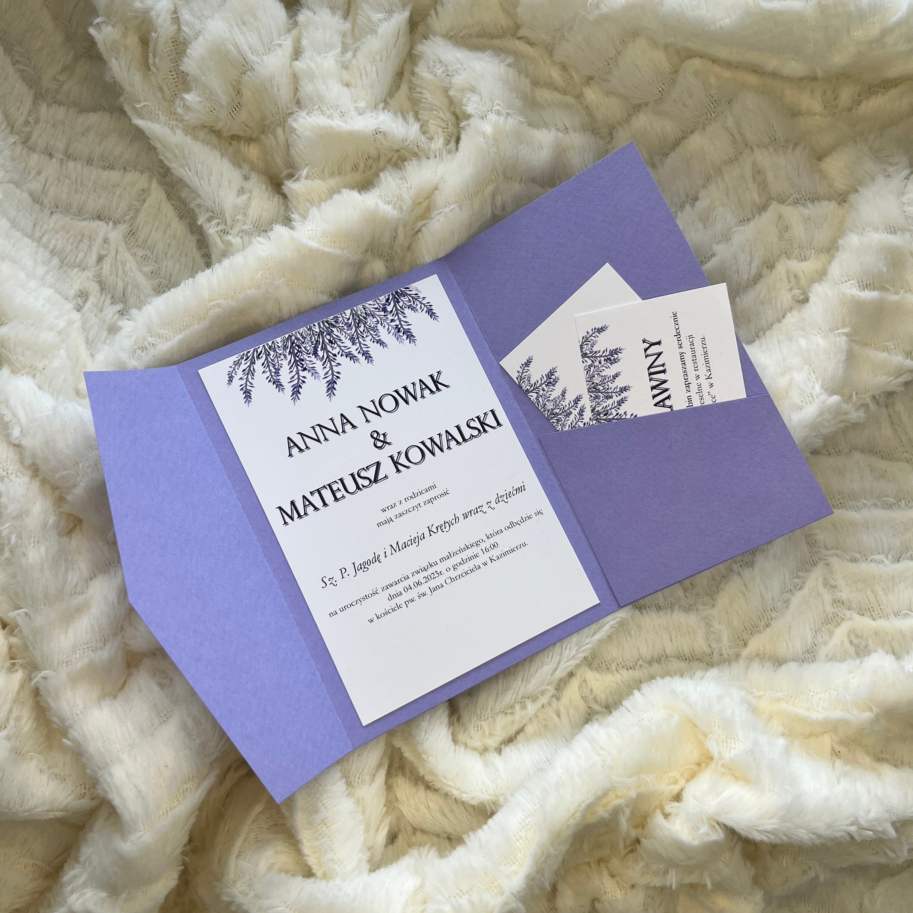 Zaproszenie Ślubne folderowe w kolorach delikatnego fioletu. Kwiaty lawendy spodobają się niejednemu miłośnikowi tej rośliny. Po prawej stronie znajduje się kieszonka na bileciki z informacją o przyjęciu oraz prośbą o potwierdzenie przybycia.