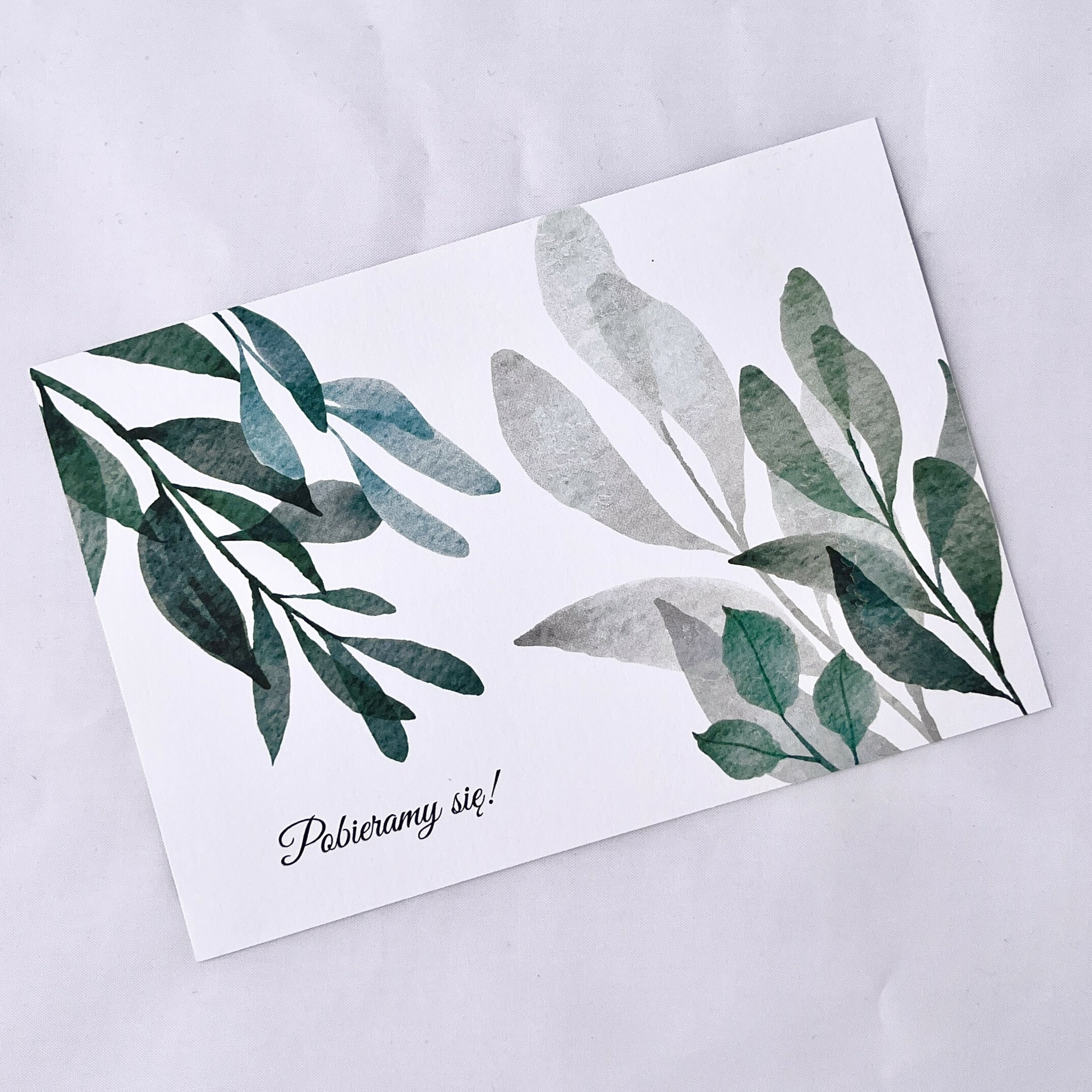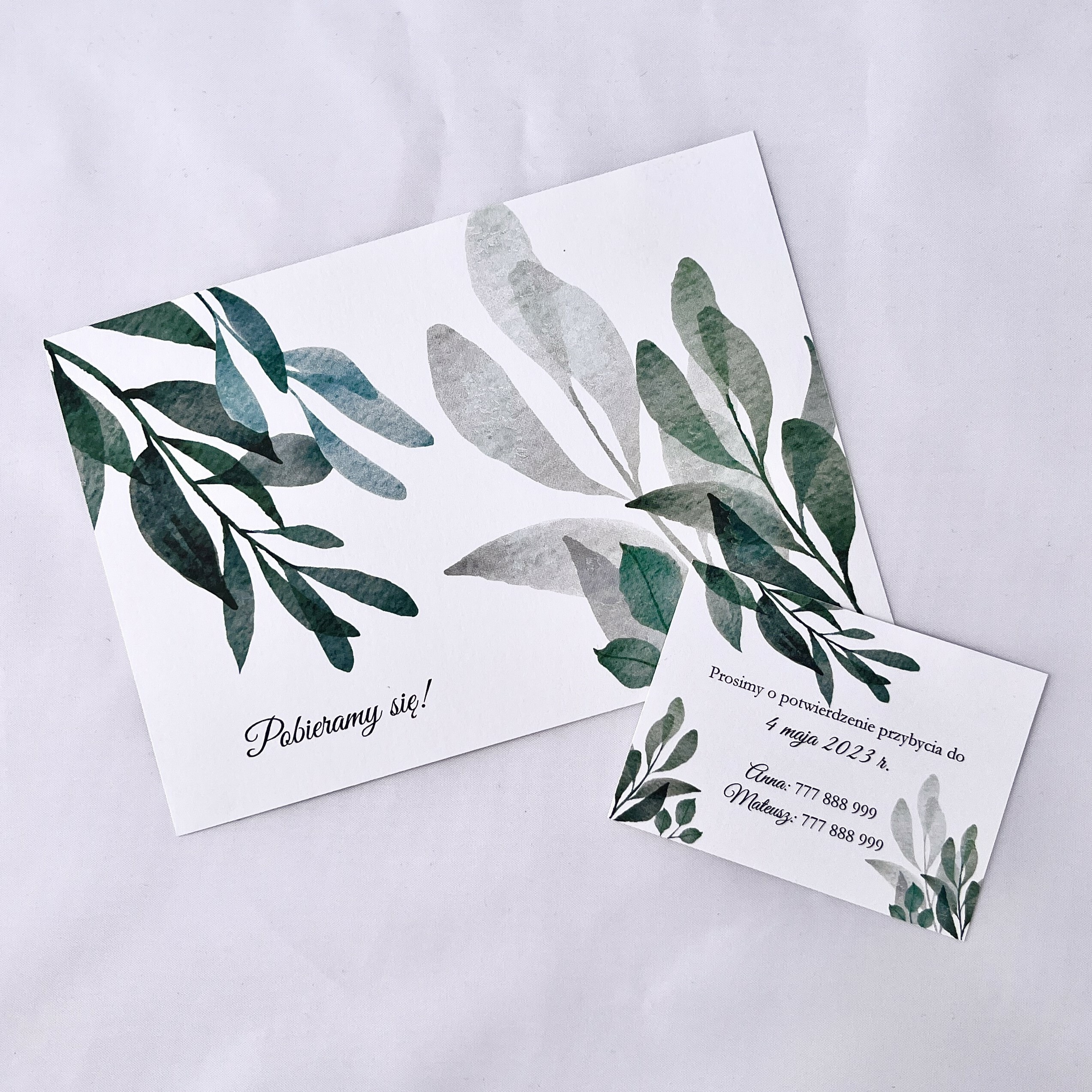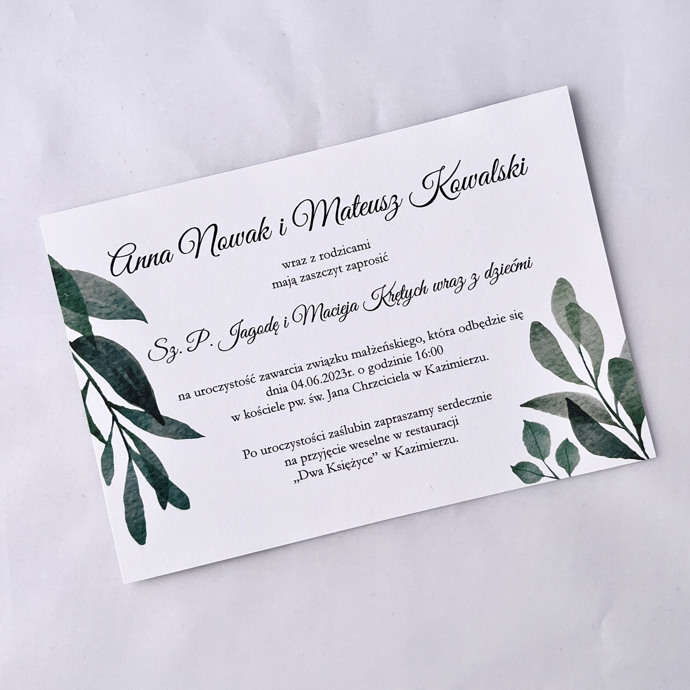 Zaproszenie Ślubne jednokartkowe idealnie nadaje się do wręczenia osobom, dzięki którym ten magiczny dzień stanie się jeszcze piękniejszy. Motyw liści jest elegancki, bez efektu przepychu.