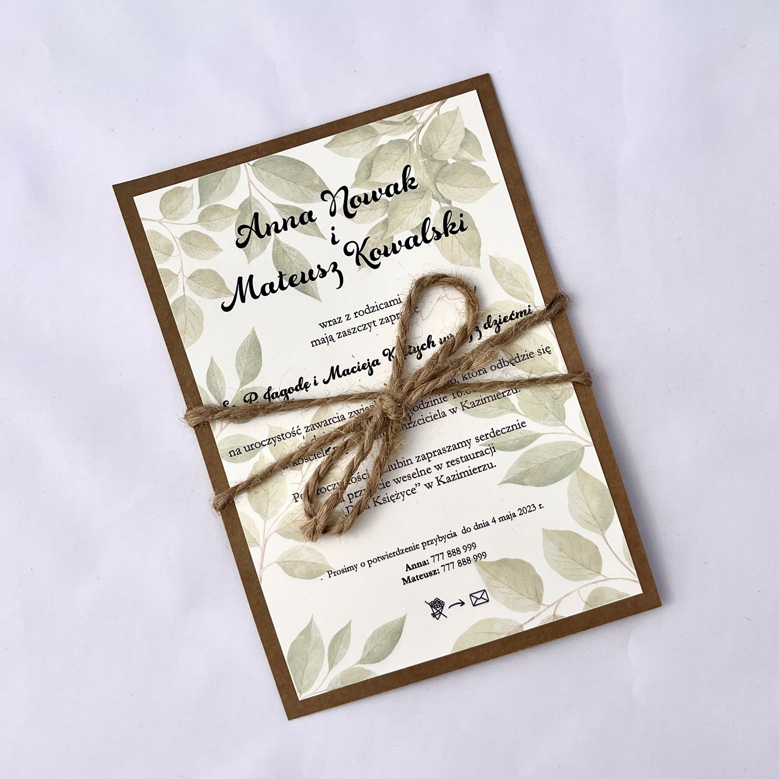 Zaproszenie Ślubne jednokartkowe idealnie nadaje się do wręczenia osobom, dzięki którym ten magiczny dzień stanie się jeszcze piękniejszy. Rustykalny styl jest elegancki jak i bardziej przyjazny środowisku ze względu na wykonanie z brązowego, eko papieru. Boho sznurek sprawnie przyciąga wzrok, a liście w tle urozmaicają całość. W innych aukcjach dostępne są dodatki, które idealnie nadadzą wszystkiemu spójności tworząc śliczny zestaw.