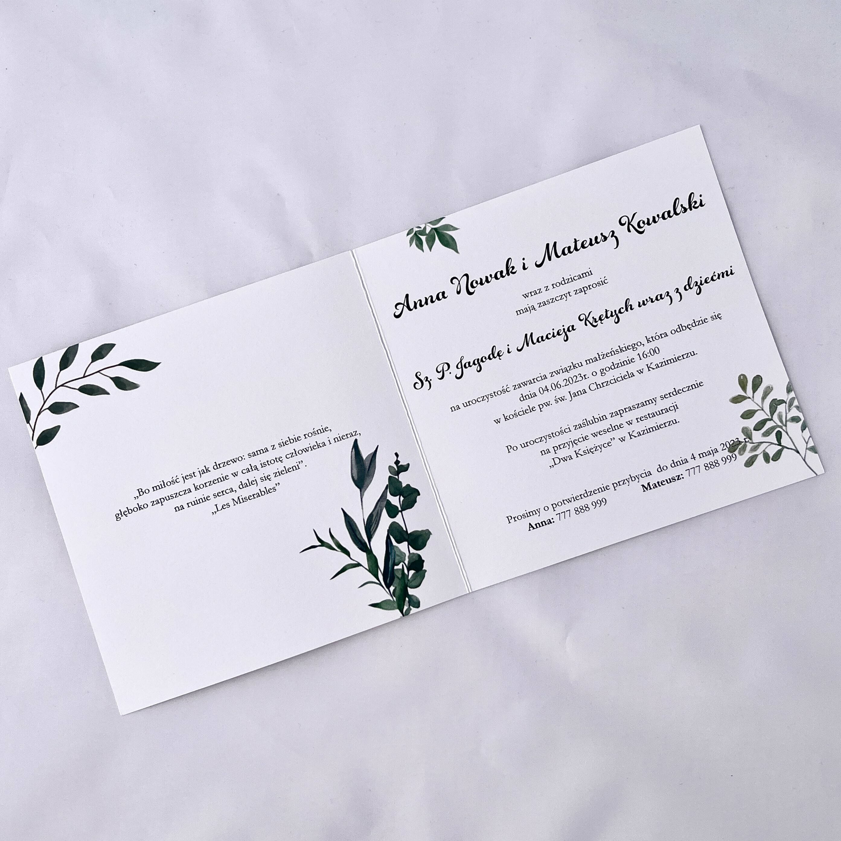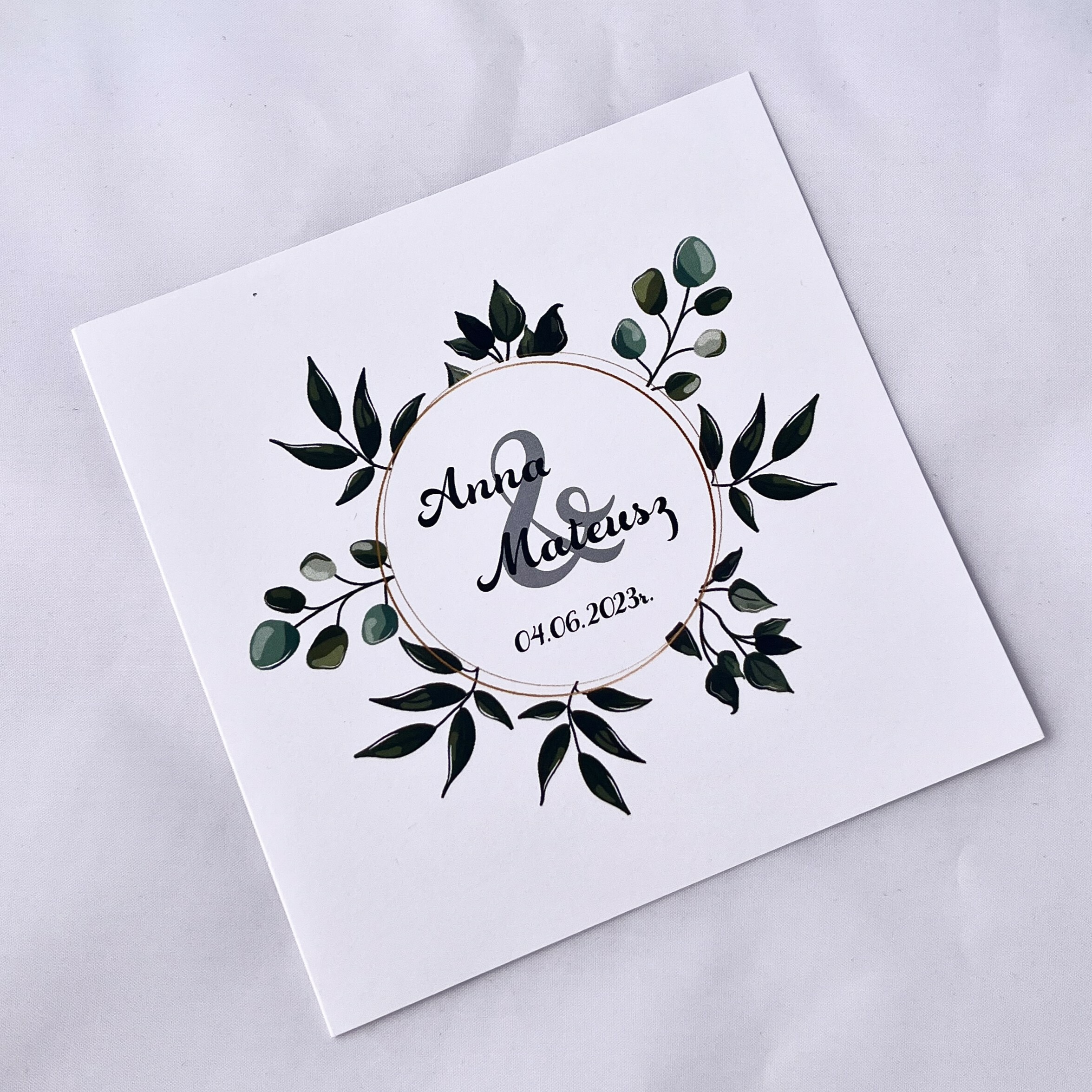 Zaproszenie Ślubne w kwadratowym formacie idealnie nadaje się do wręczenia osobom, dzięki którym ten magiczny dzień stanie się jeszcze piękniejszy. Motyw liści jest elegancki, bez efektu przepychu. W innych aukcjach dostępne są dodatki, które idealnie nadadzą wszystkiemu spójności tworząc śliczny zestaw.
