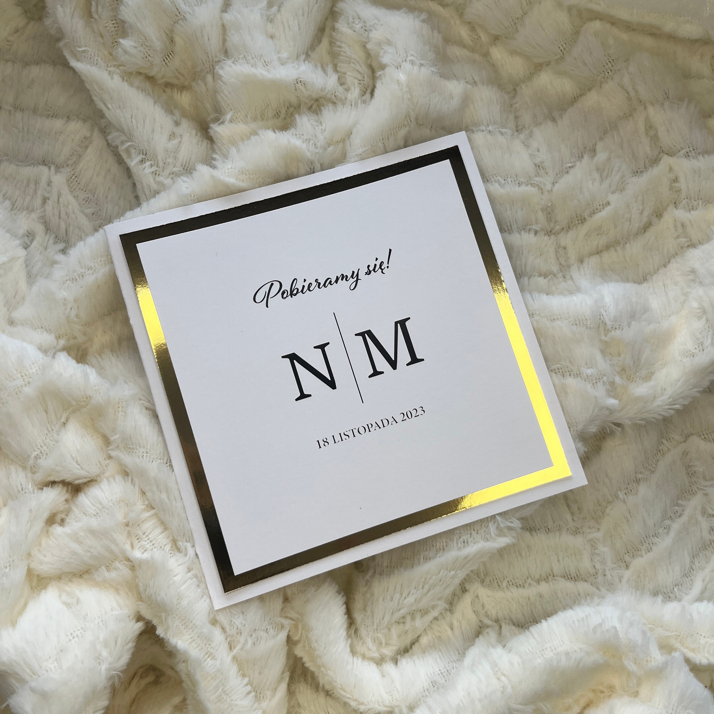 Eleganckie zaproszenie Ślubne o wymiarze 14x14cm. Delikatne złote, bądź srebrne rameczki nadają elegancji.