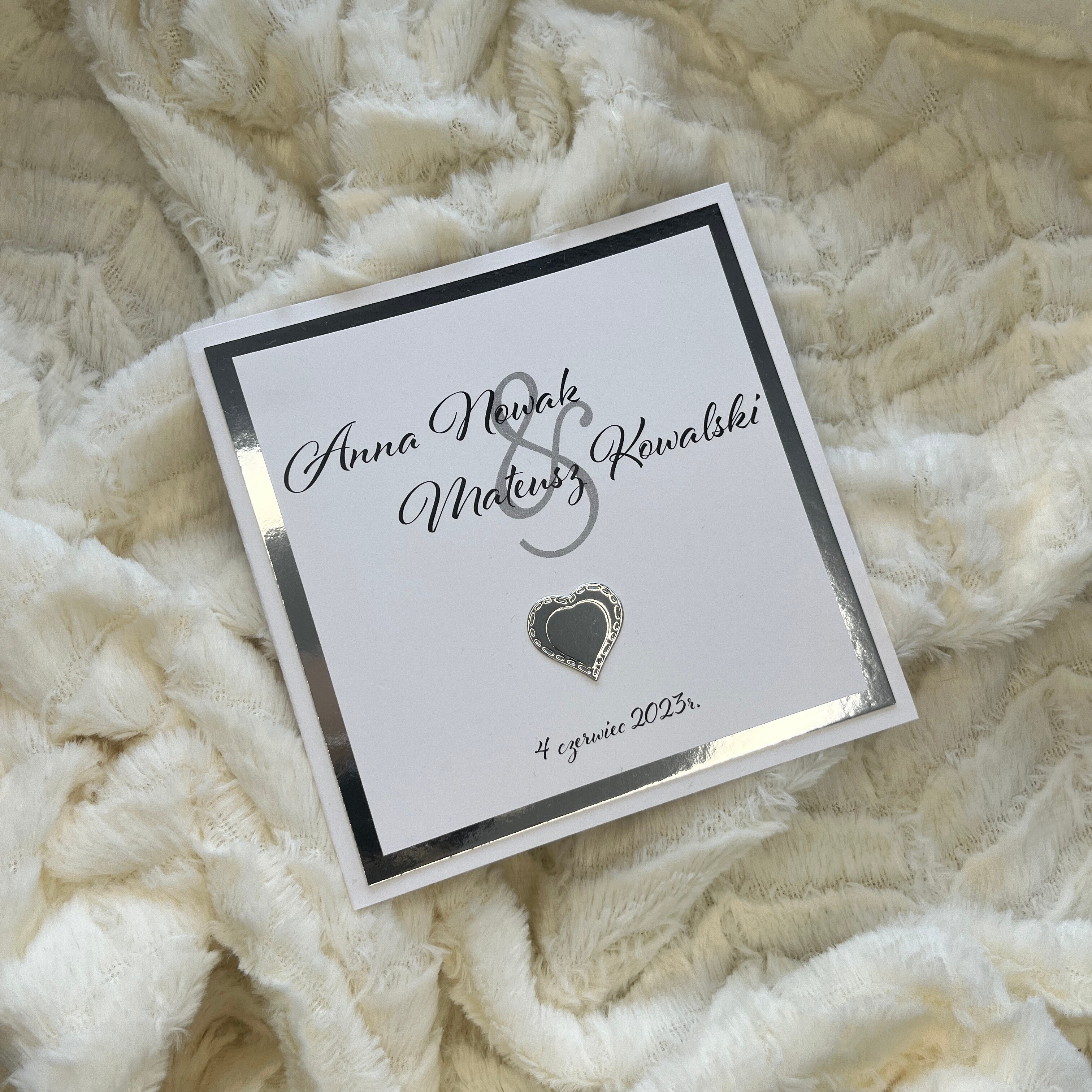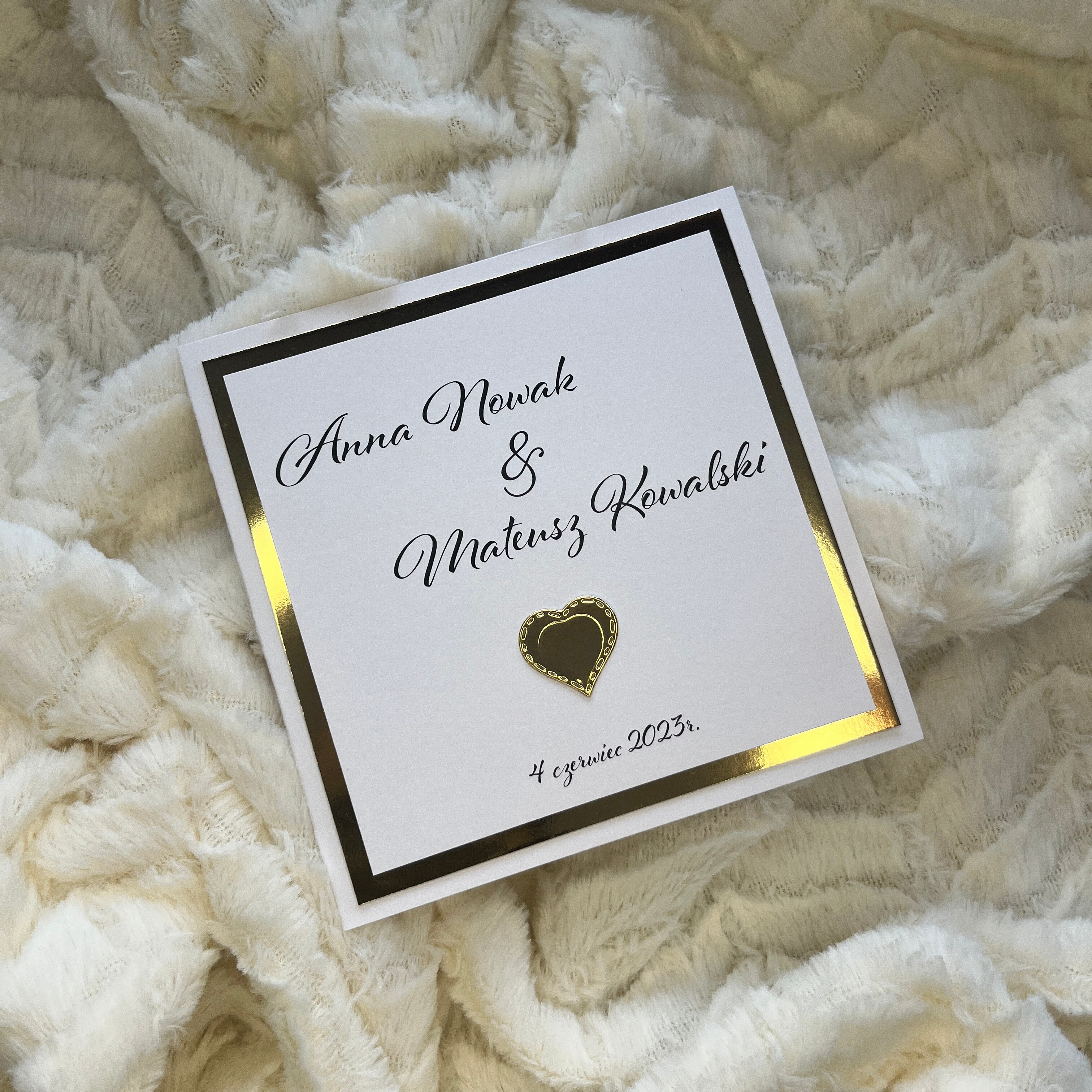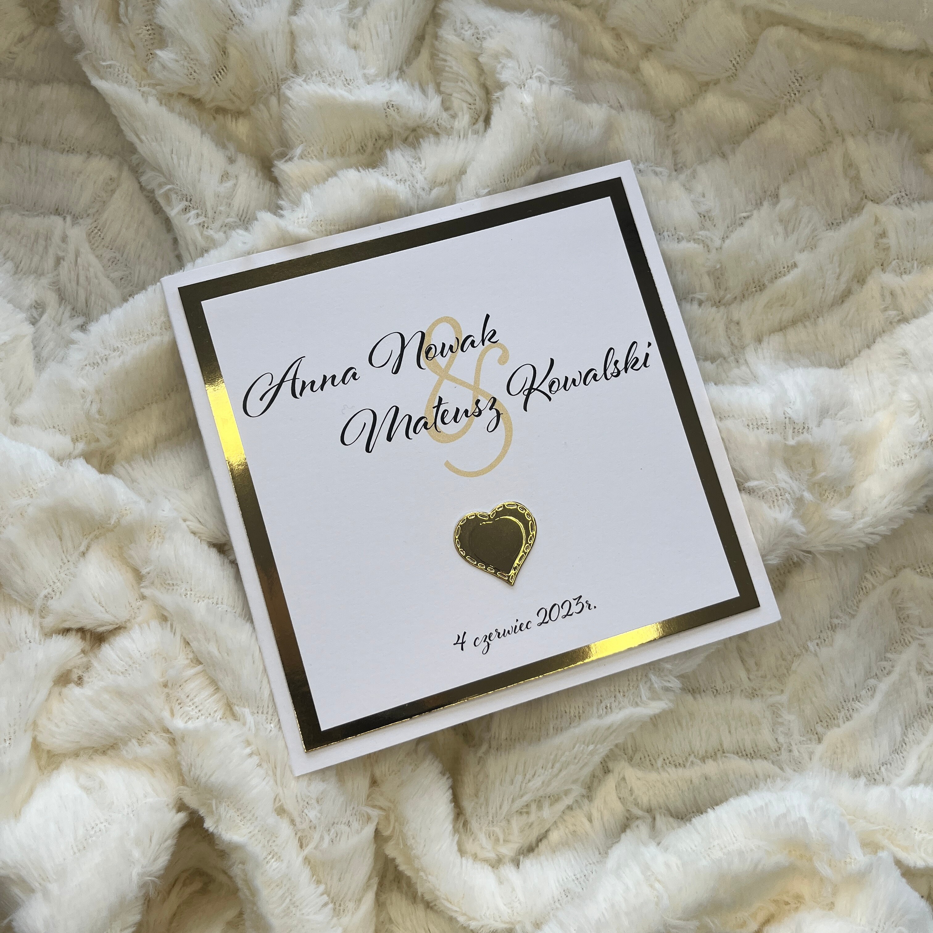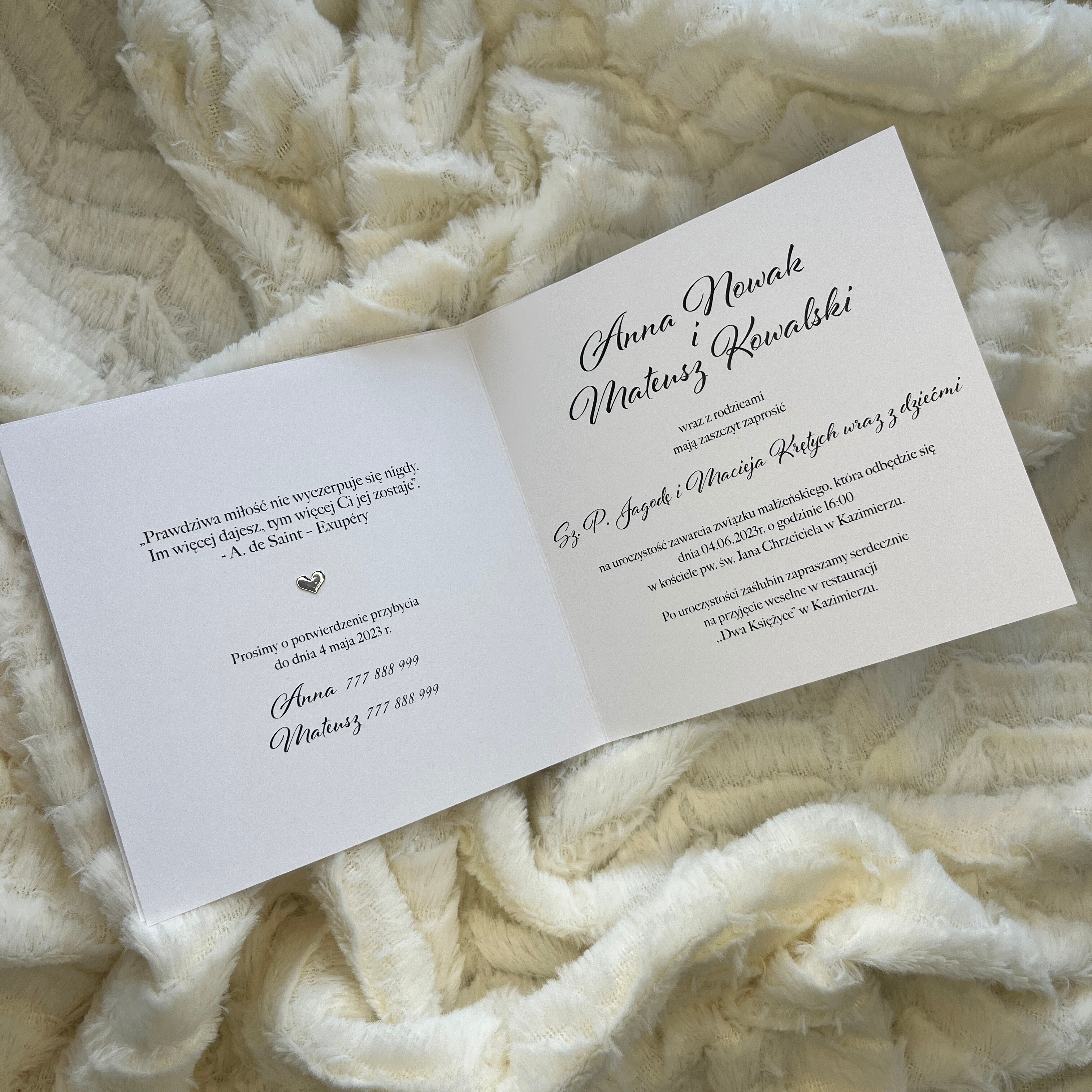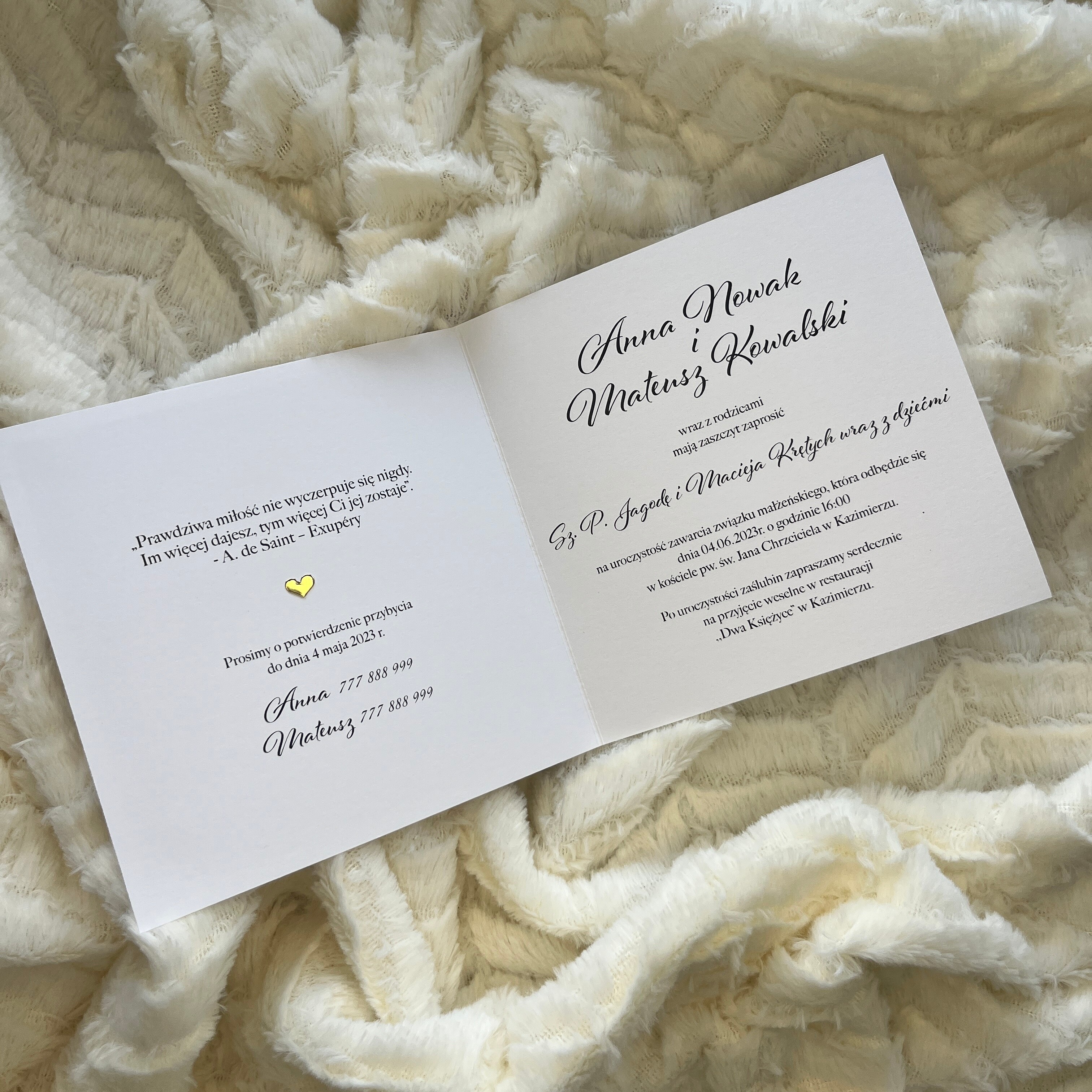 Eleganckie zaproszenie Ślubne o wymiarze 14x14cm. Delikatna złota, bądź srebrna rameczka nadaje elegancji. Kilka rodzajów frontów pozwoli wpasować się we wszystkie gusta.