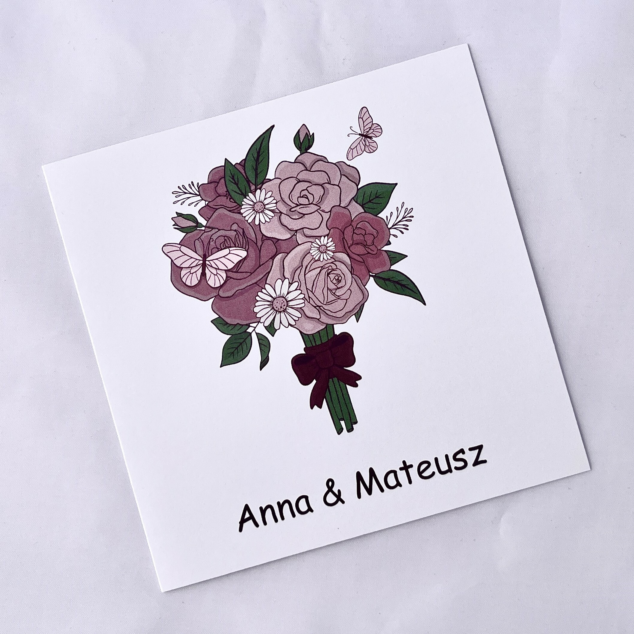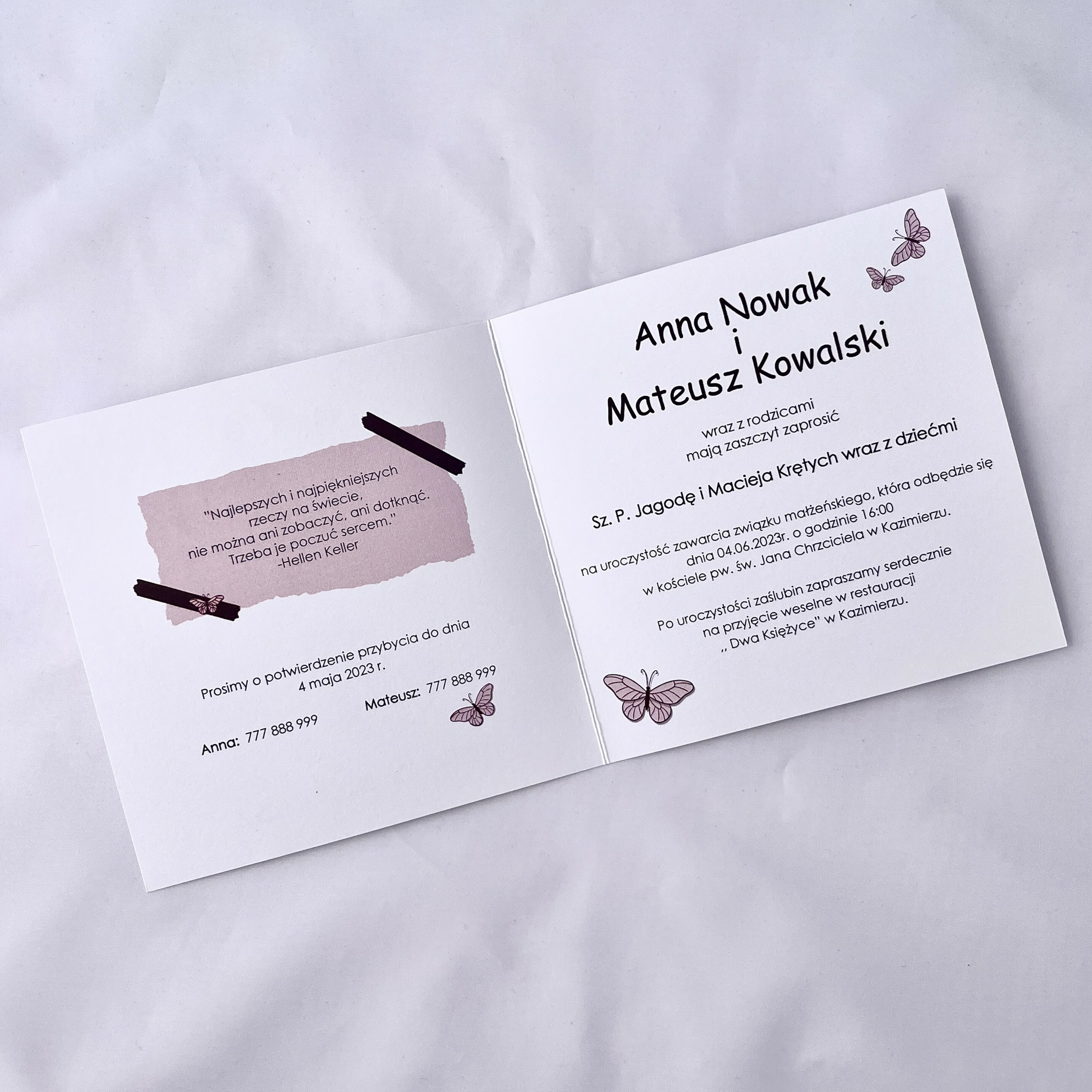 Zaproszenie Ślubne w kwadratowym formacie idealnie nadaje się do wręczenia osobom, dzięki którym ten magiczny dzień stanie się jeszcze piękniejszy. Motyw kwiatów oraz delikatnych motyli jest elegancki i uroczy, bez efektu przepychu. W innych aukcjach dostępne są dodatki, które idealnie nadadzą wszystkiemu spójności tworząc śliczny zestaw.