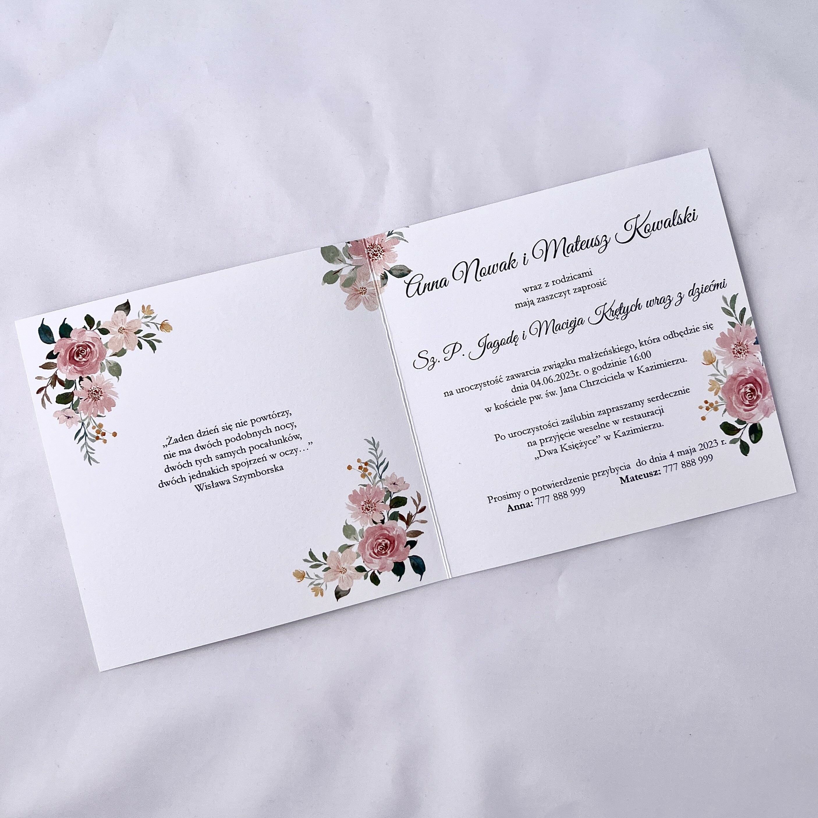 Zaproszenie Ślubne w kwadratowym formacie idealnie nadaje się do wręczenia osobom, dzięki którym ten magiczny dzień stanie się jeszcze piękniejszy. Motyw kwiatów jest elegancki, bez efektu przepychu. W innych aukcjach dostępne są dodatki, które idealnie nadadzą wszystkiemu spójności tworząc śliczny zestaw.