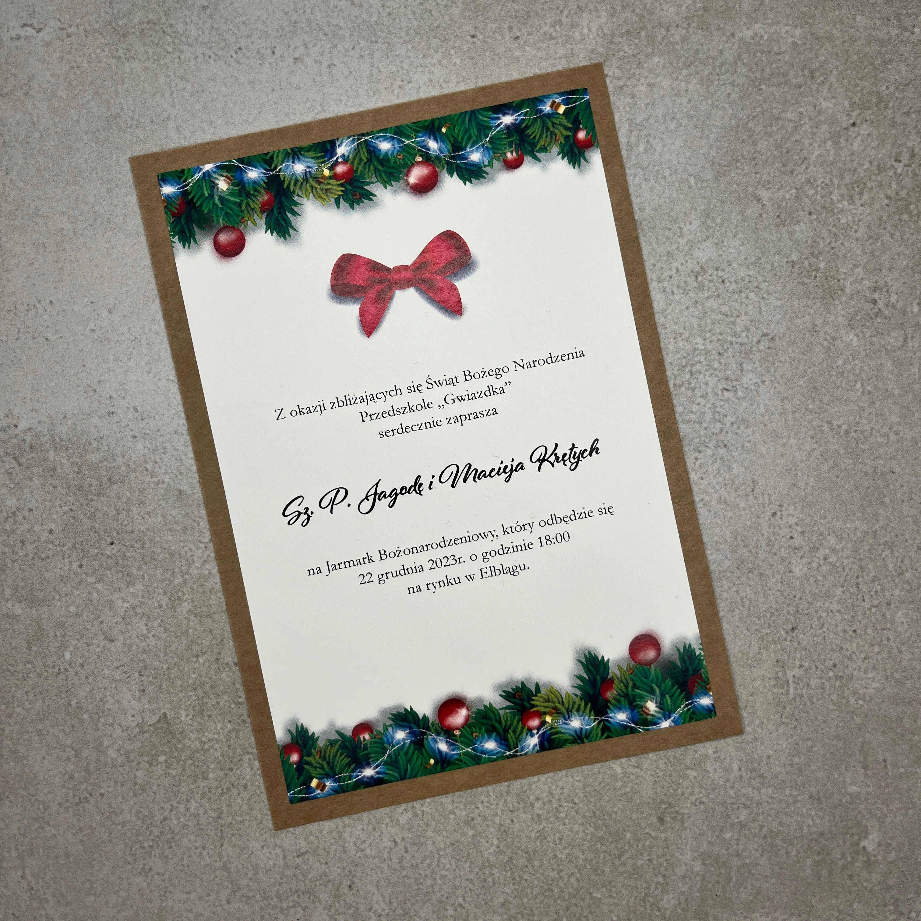 Jednokartkowe zaproszenie z motywem świątecznym idealnie sprawdzi się na spotkanie, jasełka lub jarmark świąteczny.