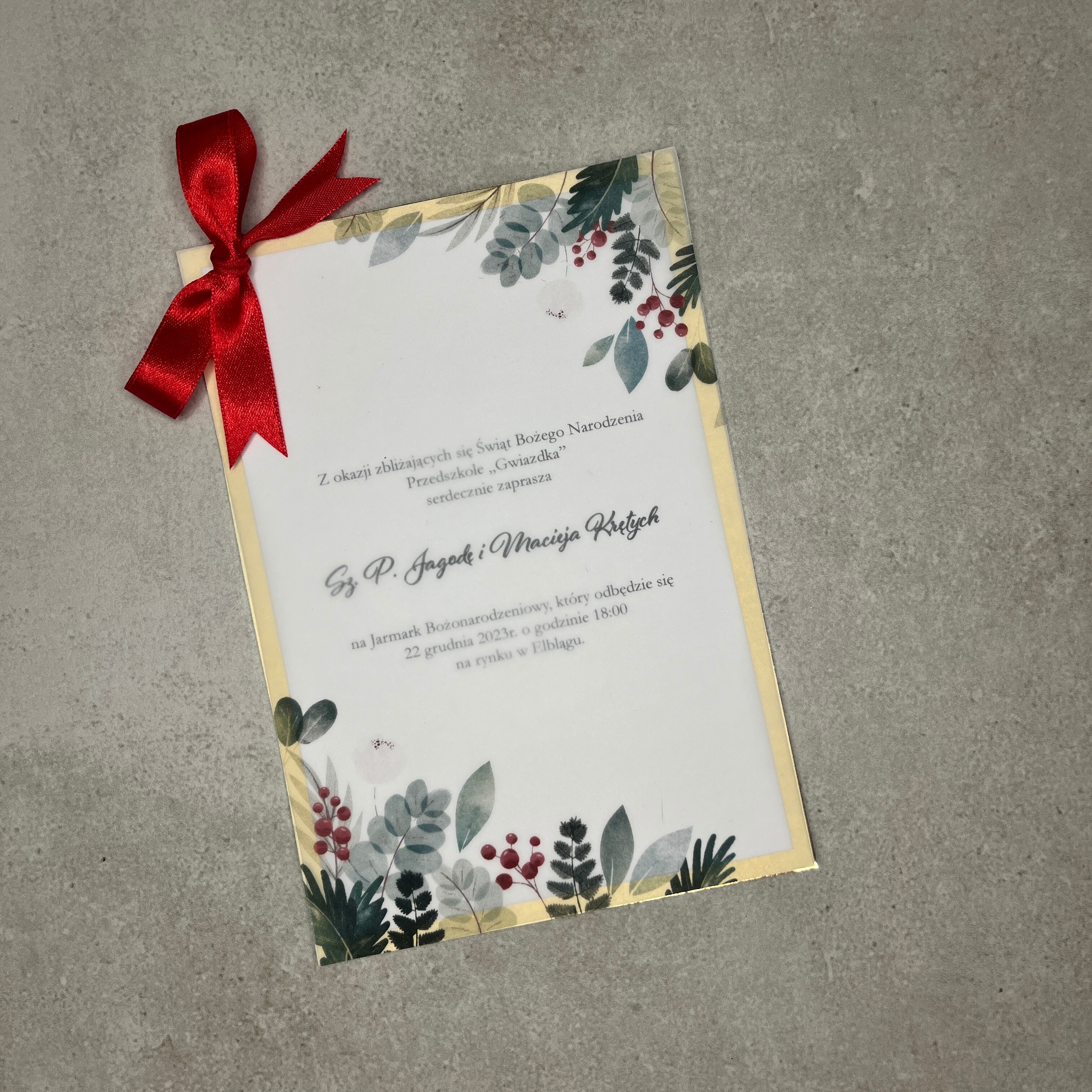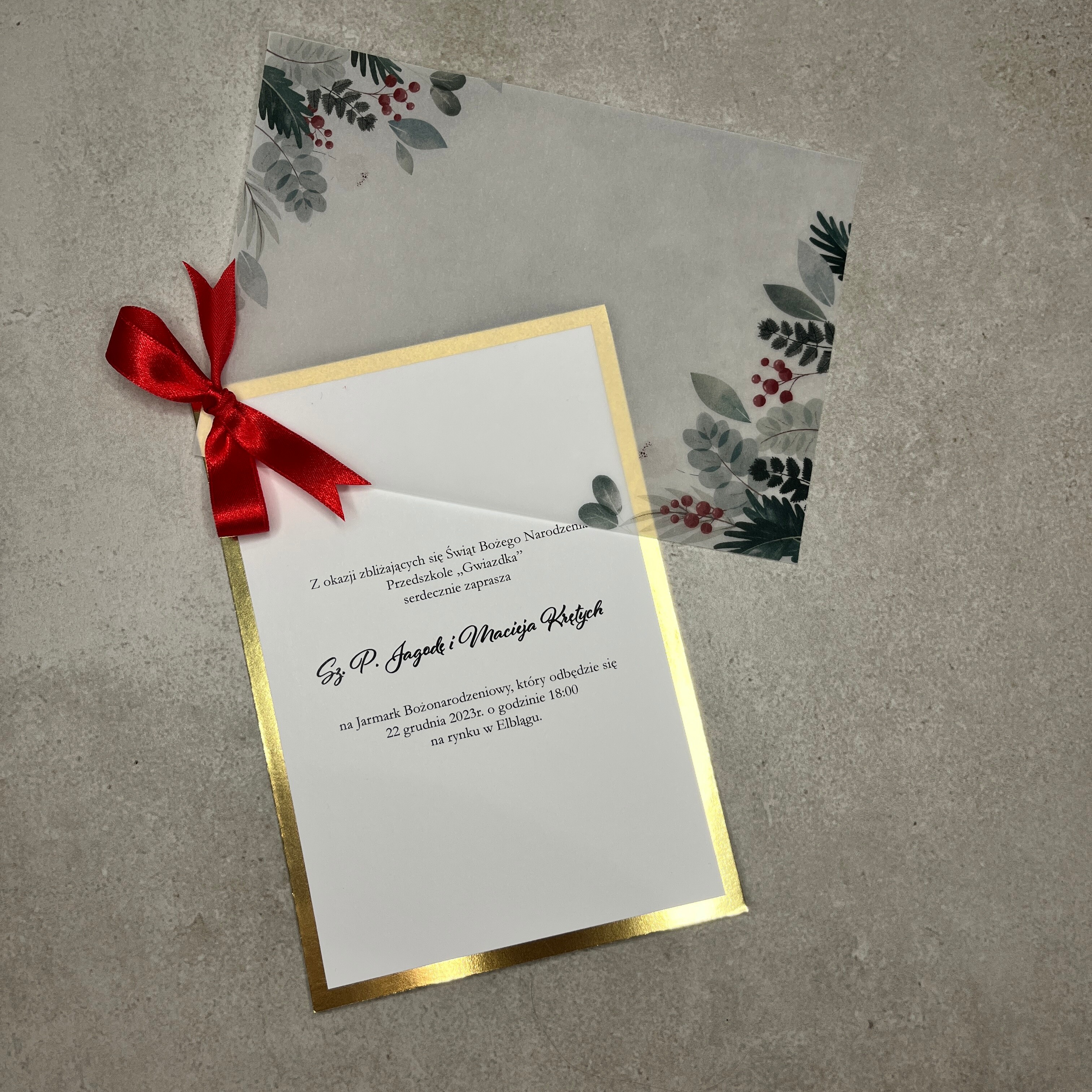 Zaproszenie jednokartkowe z motywem świątecznym. Złota lub srebrna baza z wklejką świetnie komponuje się z kalką oraz czerwoną wstążeczką. Idealnie sprawdzi się na wigilię, jasełka, bądź jarmark świąteczny.