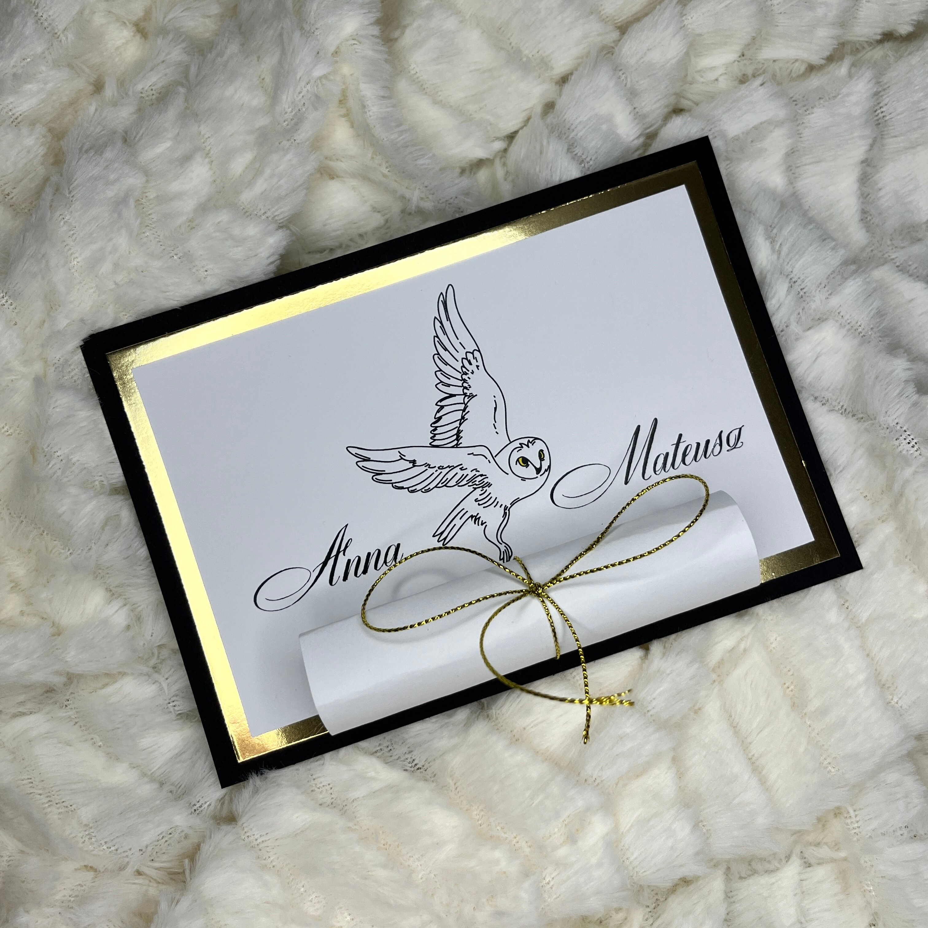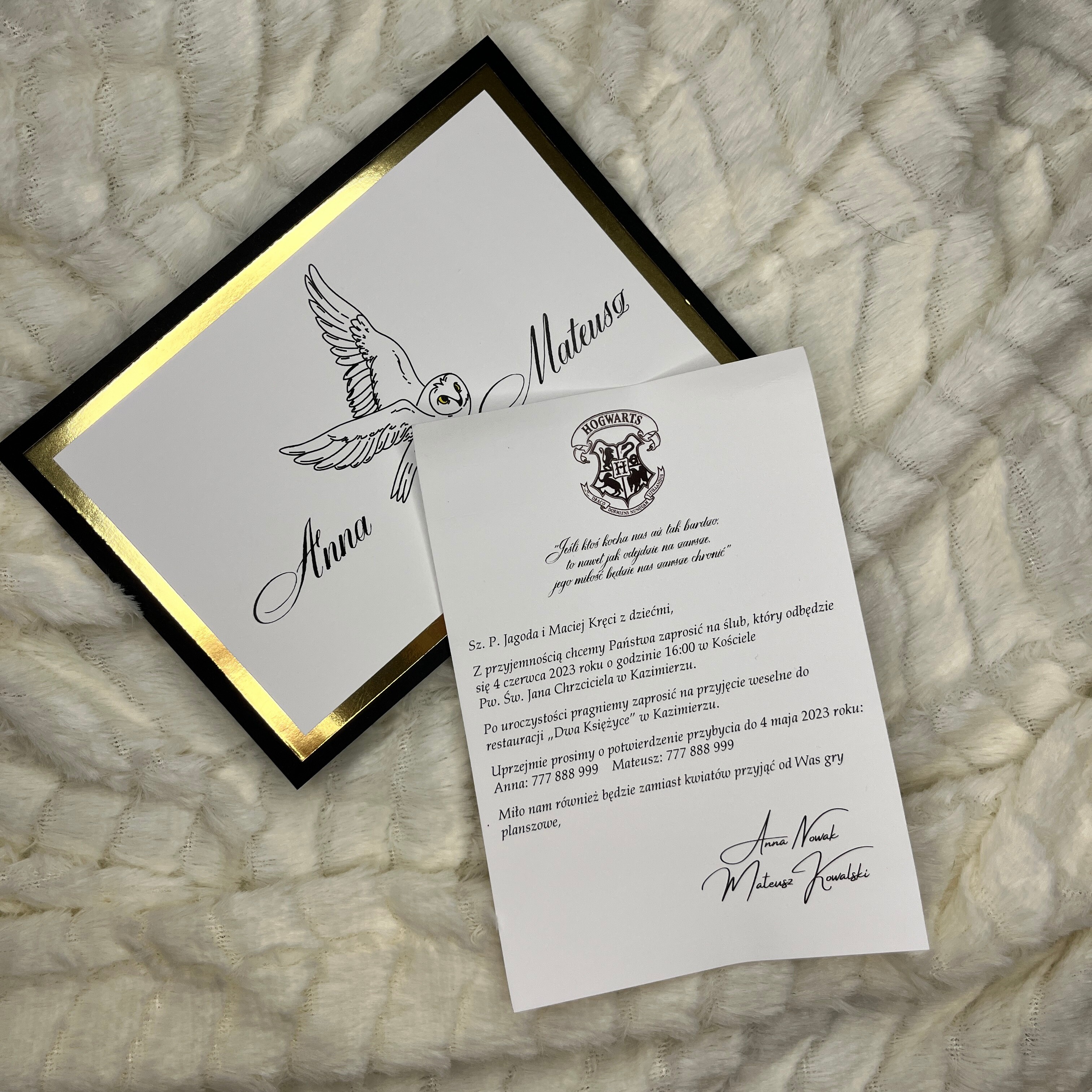 Zaproszenie Ślubne z motywem Harrego Pottera idealnie sprawdzi się dla jego fanów. Czarno- złota baza (możliwość modyfikacji) nadaje elegancji i świetnie wpasowuje się w całość.