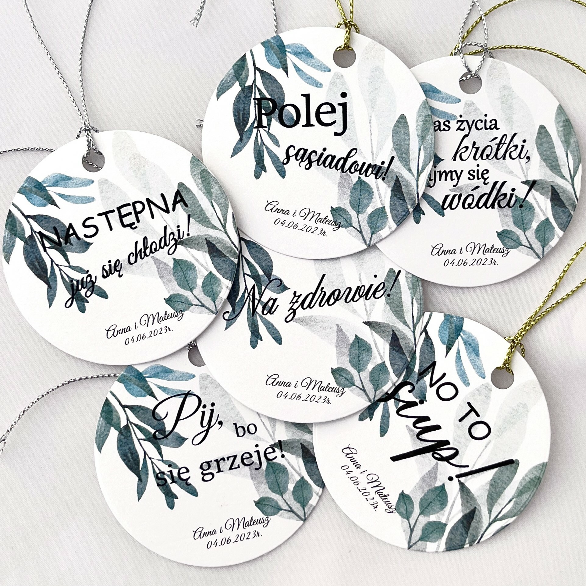 Zawieszka na alkohol to fajny sposób na dopełnienie wyglądu sali. Teksty umieszczone na nich mogą umilić czas gości, a co najważniejsze zachęcić do wspólnej zabawy! Zawieszki stworzone są w taki sposób, by pasowały nie tylko do wcześniej rozdanych zaproszeń, ale także do innych dodatków będących już na stole.