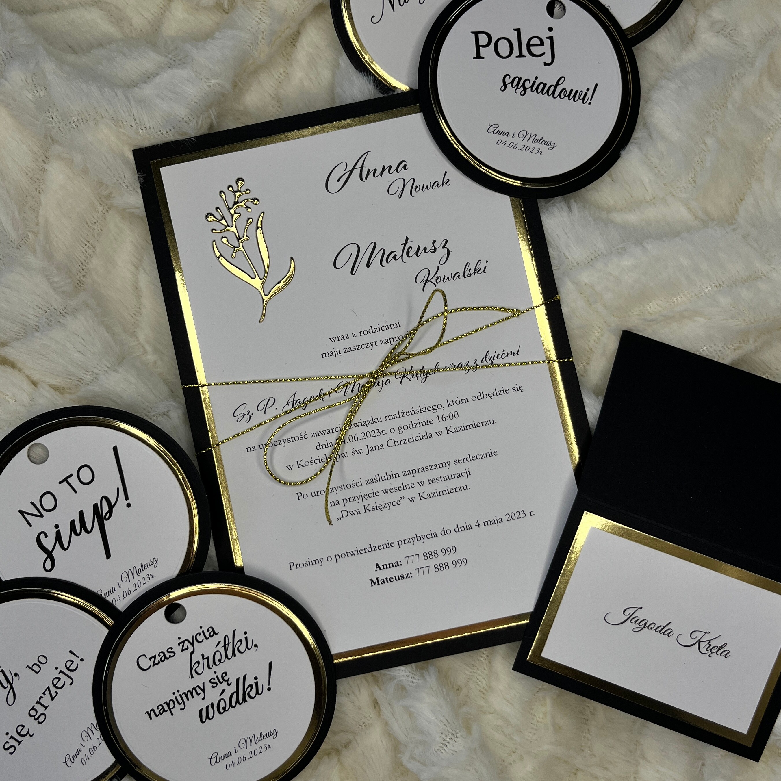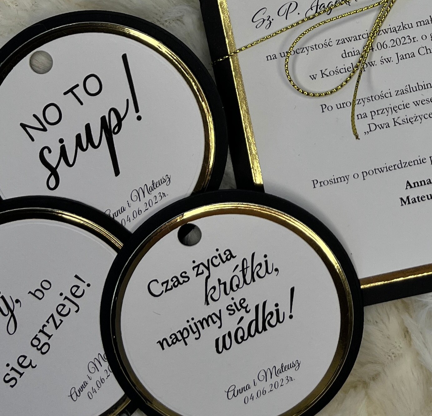 Zawieszka na alkohol to fajny sposób na dopełnienie wyglądu sali. Teksty umieszczone na nich mogą umilić czas gości, a co najważniejsze zachęcić do wspólnej zabawy! Zawieszki stworzone są w taki sposób, by pasowały nie tylko do wcześniej rozdanych zaproszeń, ale także do innych dodatków będących już na stole.