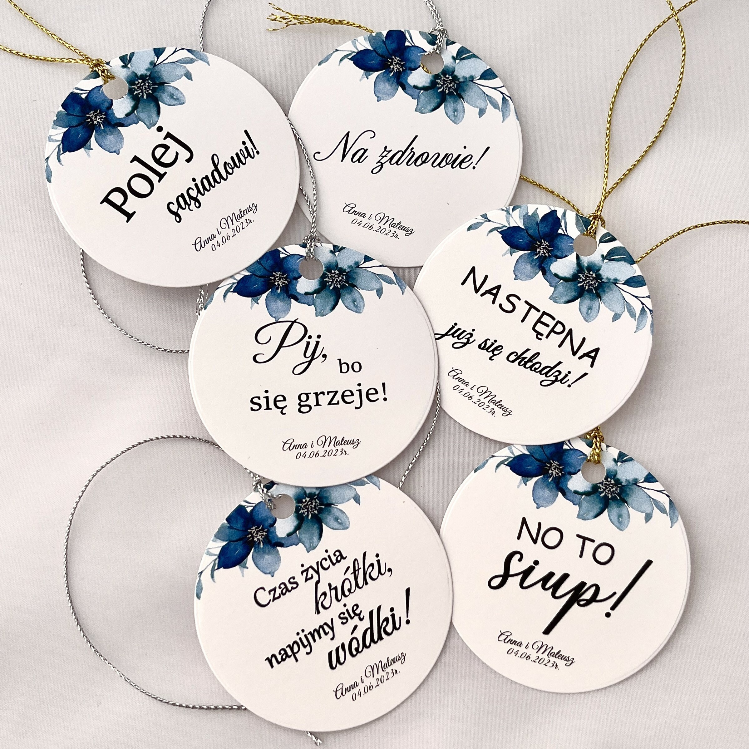 Zawieszka na alkohol to fajny sposób na dopełnienie wyglądu sali. Teksty umieszczone na nich mogą umilić czas gości, a co najważniejsze zachęcić do wspólnej zabawy! Zawieszki stworzone są w taki sposób, by pasowały nie tylko do wcześniej rozdanych zaproszeń, ale także do innych dodatków będących już na stole.
