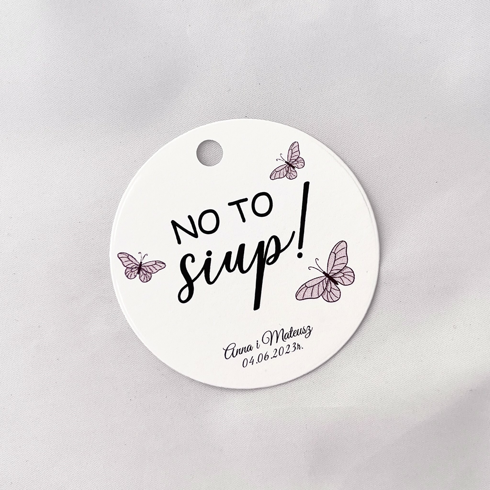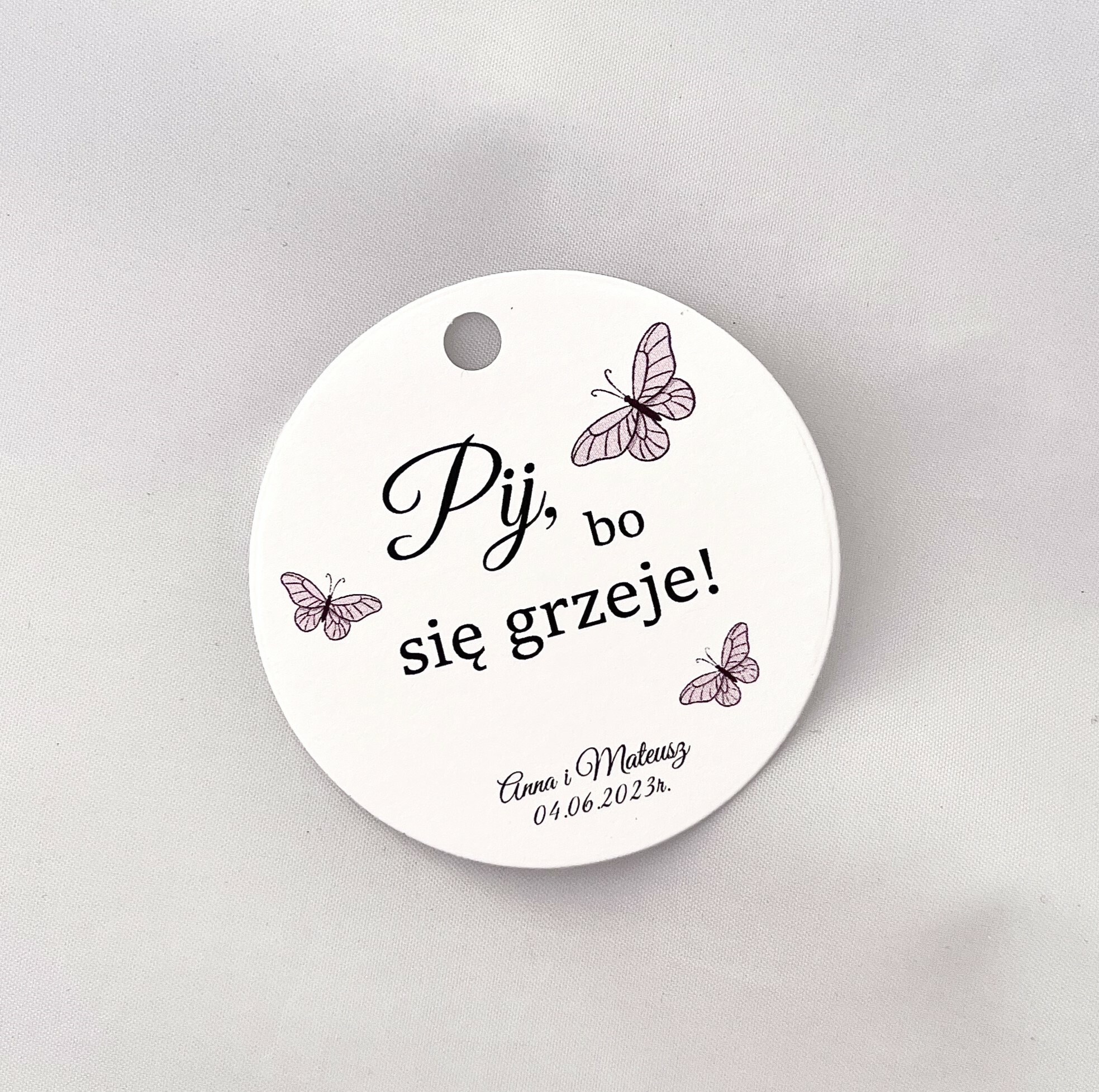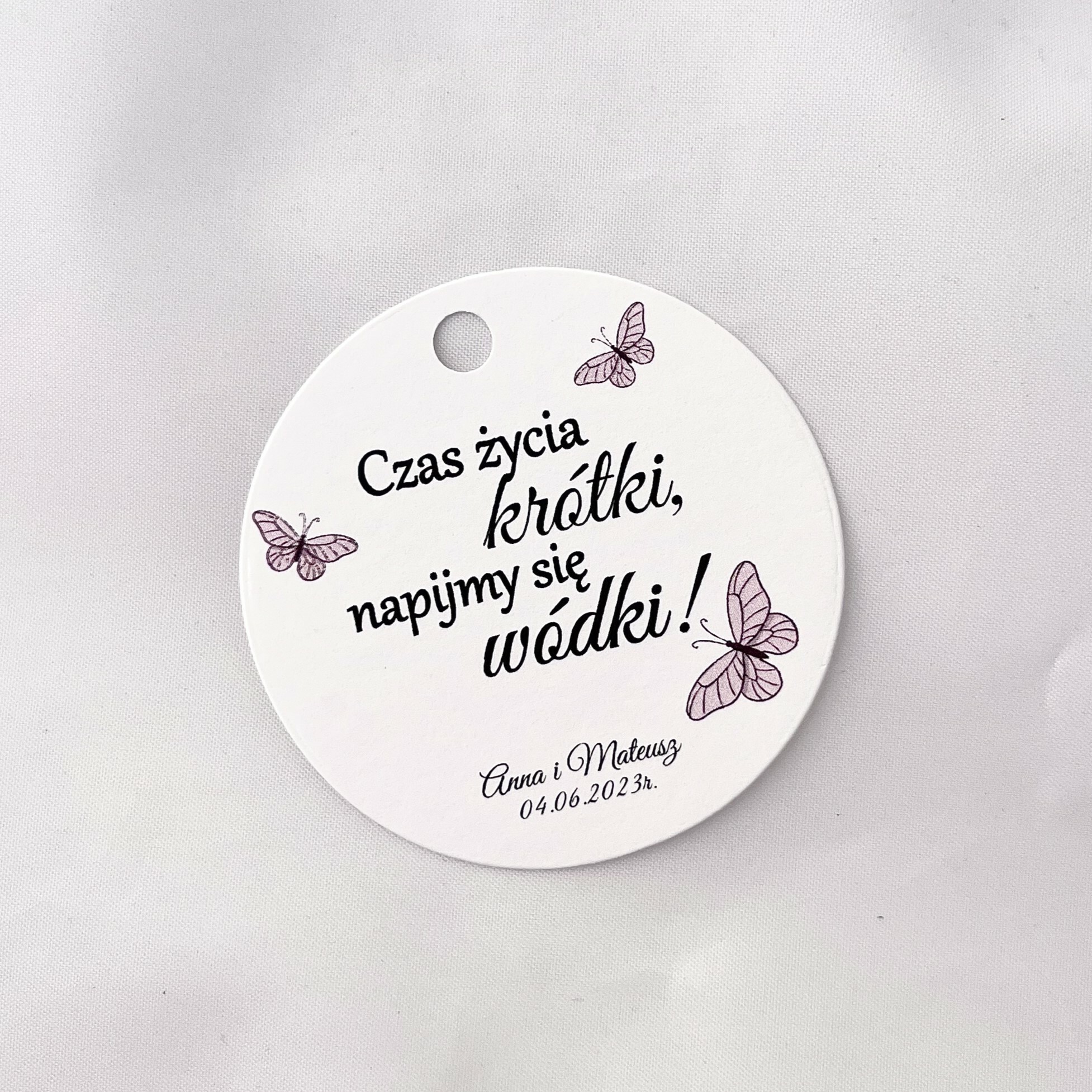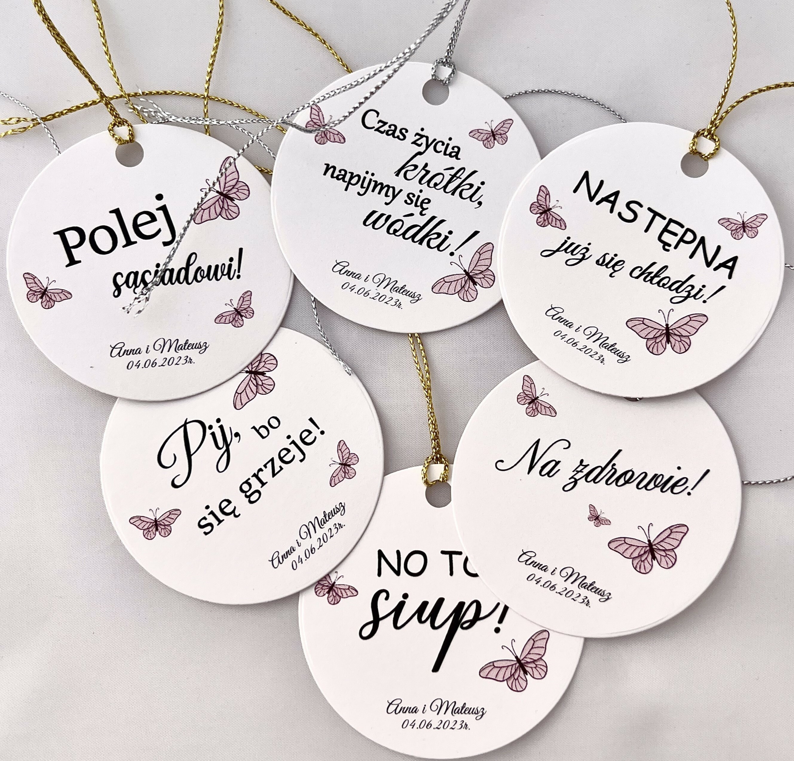Zawieszka na alkohol to fajny sposób na dopełnienie wyglądu sali. Teksty umieszczone na nich mogą umilić czas gości, a co najważniejsze zachęcić do wspólnej zabawy! Zawieszki stworzone są w taki sposób, by pasowały nie tylko do wcześniej rozdanych zaproszeń, ale także do innych dodatków będących już na stole.
