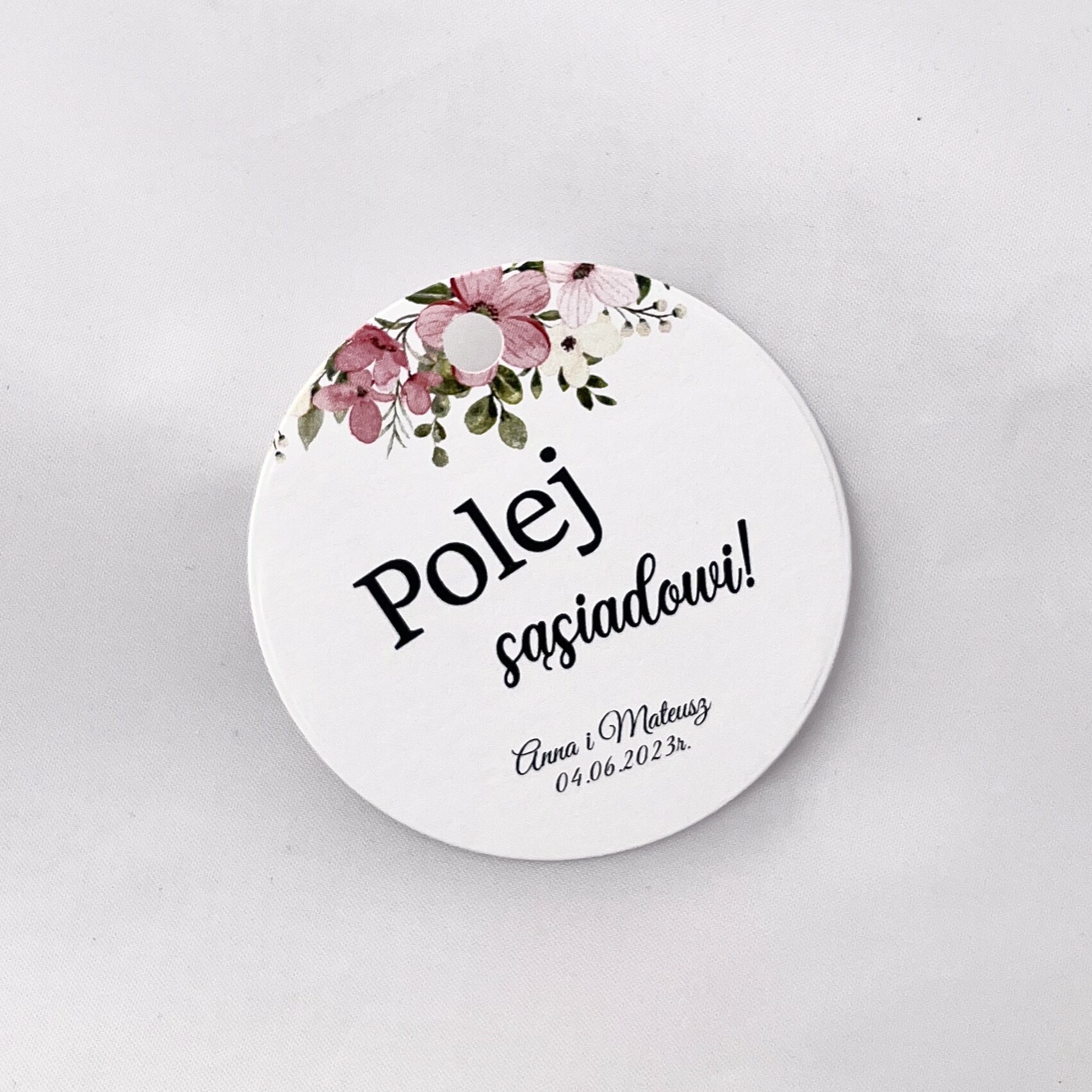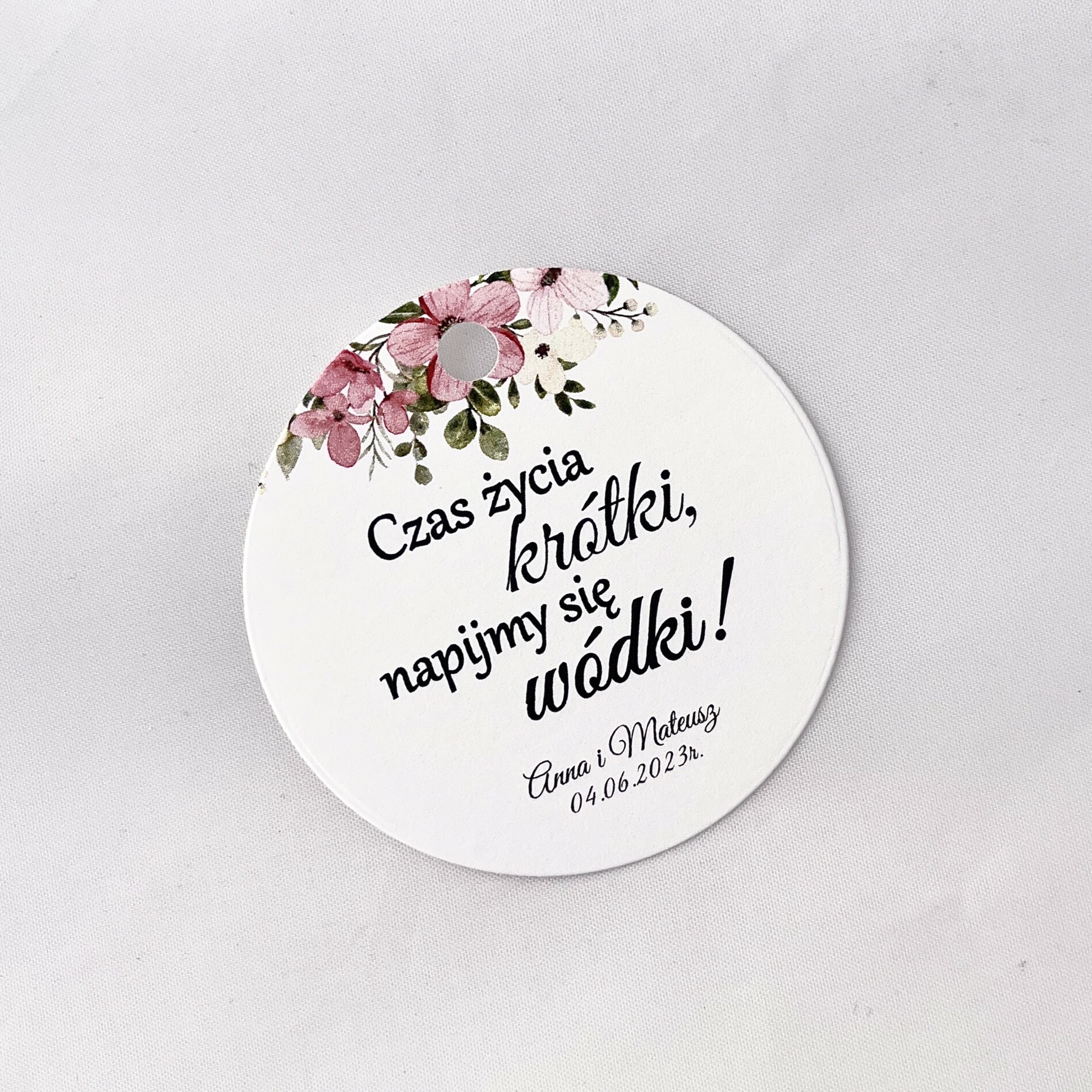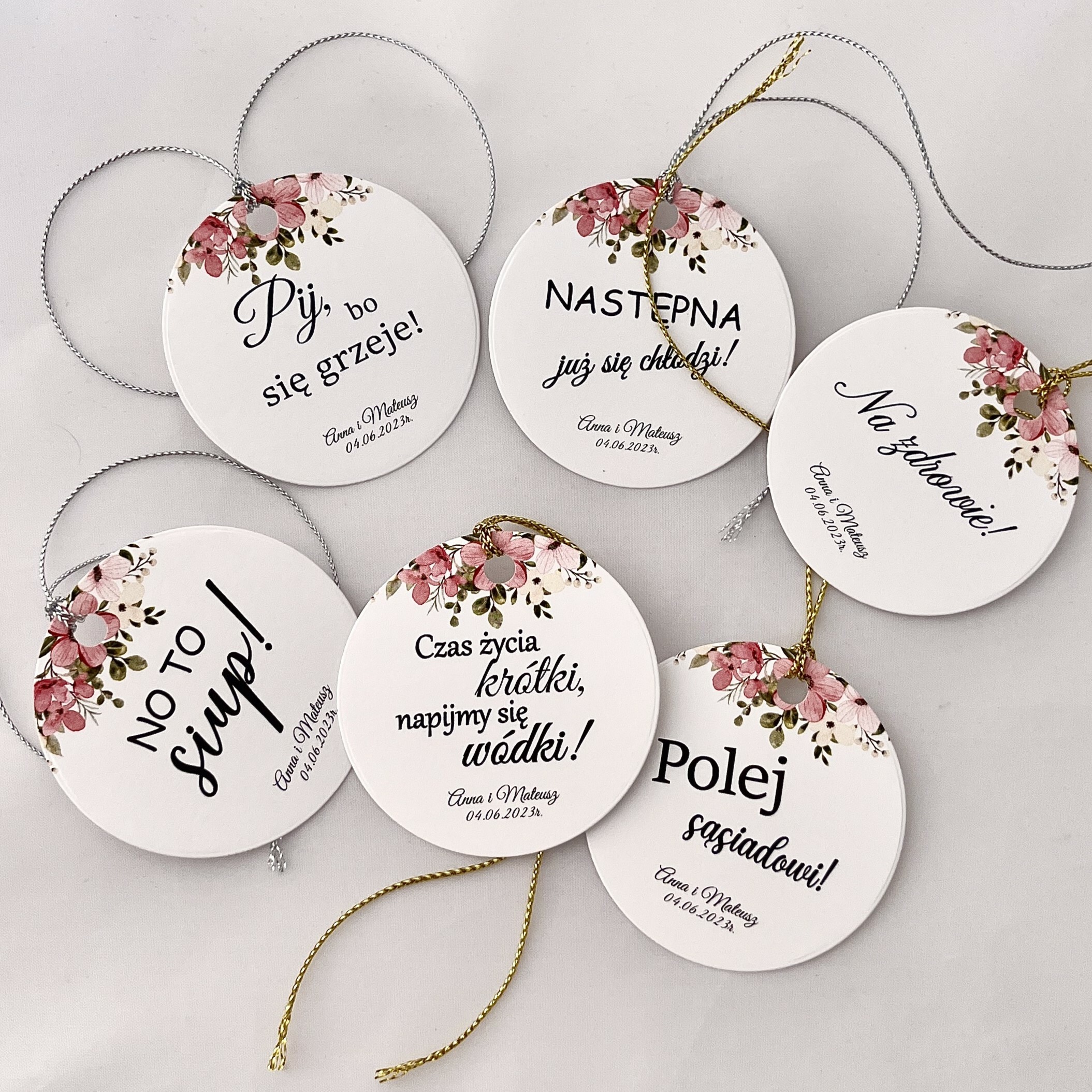 Zawieszka na alkohol to fajny sposób na dopełnienie wyglądu sali. Teksty umieszczone na nich mogą umilić czas gości, a co najważniejsze zachęcić do wspólnej zabawy! Zawieszki stworzone są w taki sposób, by pasowały nie tylko do wcześniej rozdanych zaproszeń, ale także do innych dodatków będących już na stole.